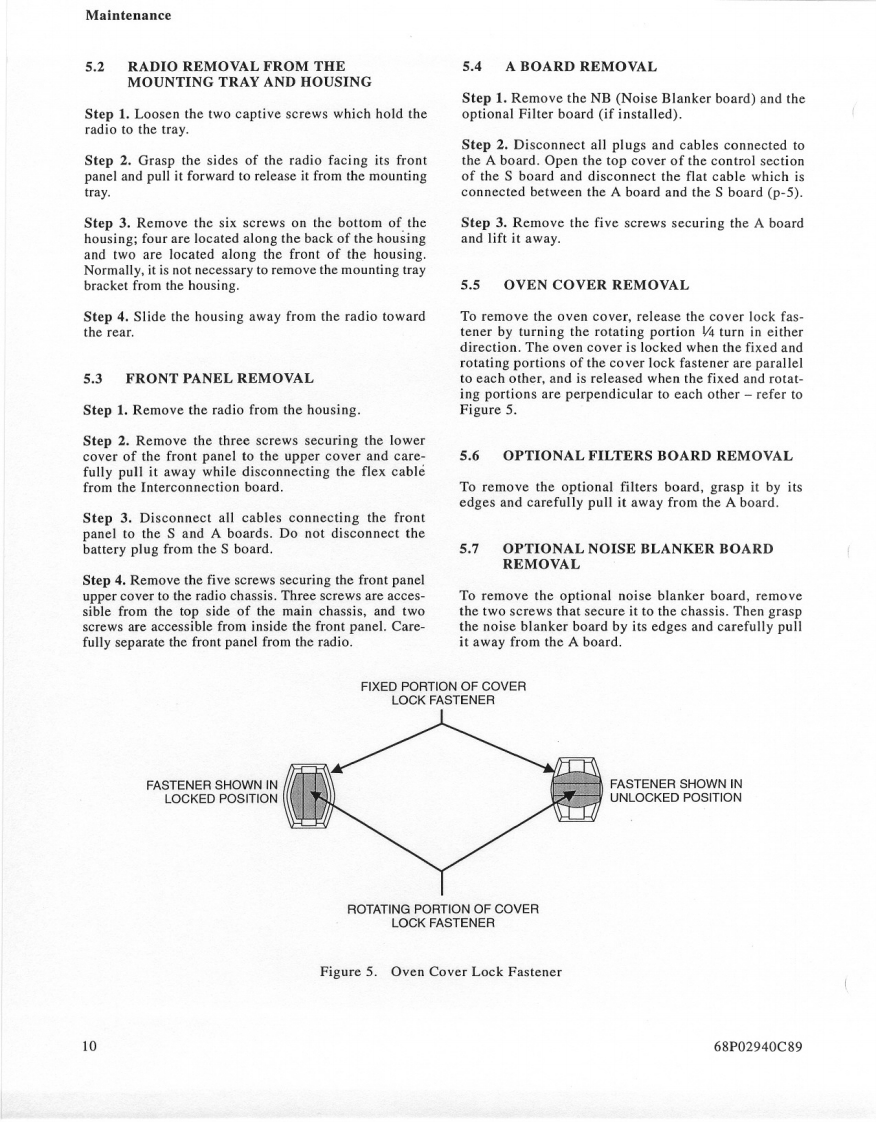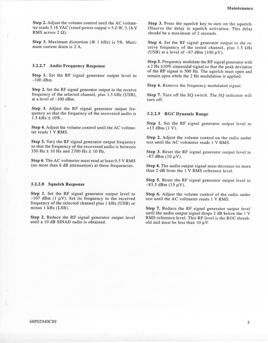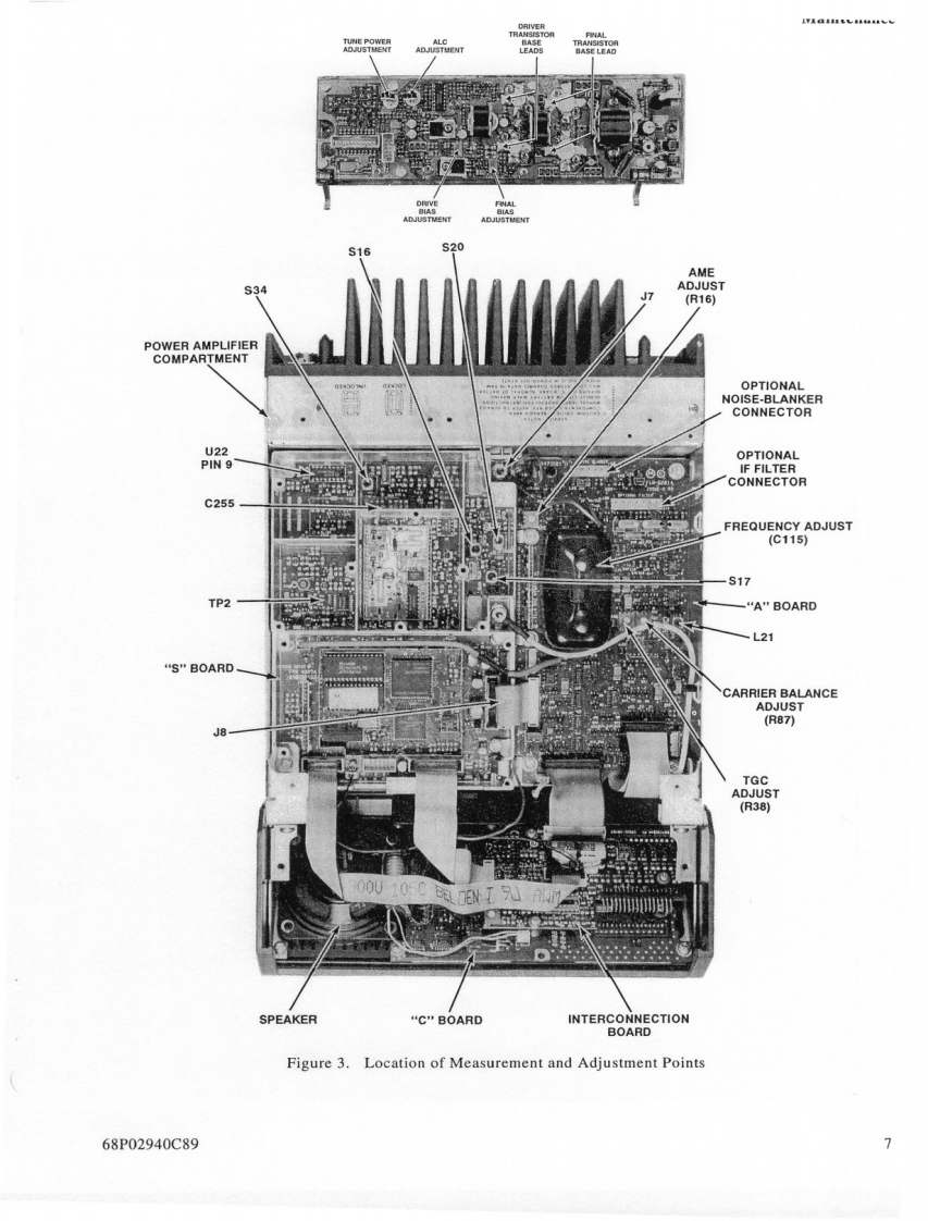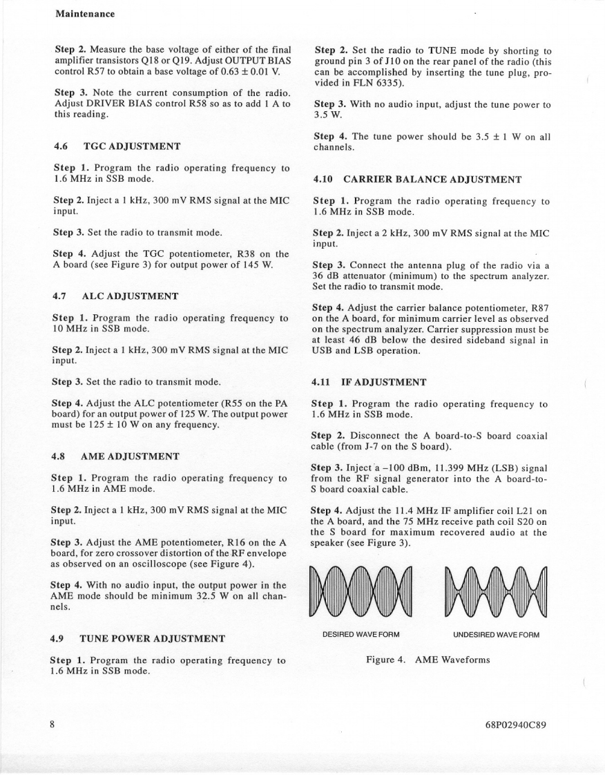 MOTOROLAMAINTENANCE1.INTRODUCTION3.When servicing a MICOM.XL radio,you must be equipped with the pro-This section provides maintenance,calibration,andgramming module FLN6304 (optiontroubleshooting instructions.S86),so as to be able to program theradio to all frequencies used in thetests.2.RECOMMENDED TEST EQUIPMENT3.PREVENTIVE MAINTENANCEItemModel3.1VISUAL INSPECTIONSpectrum AnalyzerHP 8568BCheck that all external surfaces of the equipment areSignal GeneratorHP 8657Afree of dirt.Inspect all connecting cables for damageor loose connections.Frequency CounterHP 5327CIf the equipment is dirty,wash the external surfacesMultimeterFLUKE 8000Awith mild soap and water using a clean cloth.Be care-ful!Never allow electronic components or connectorsAudio GeneratorHP 204Cto get wet.OscilloscopeTEKTRONIX 4653.2PERFORMANCE TESTSAudio AnalyzerHP 8903BAt initial installation and yearly thereafter,perform thepower output,half-power output,'tune'power outputPower MeterHP 438Atransmitter tests and the 10 dB SINAD and half-powersensitivity receiver tests.The tests should be performed30 dB/150 W CoaxialBird 8322on several channels covering the 1.6-30 MHz frequencyAttenuator*range unless otherwise specified.It is recommended tocheck at 1.6 MHz and at the end of each range of the10 dB/1 W AttenuatorBird8302-100harmonic filter(refer to paragraph 3.5 in the Theory ofOperation section of this manual).The readings of eachmay be used as Dummy Loadtest should be recorded and compared with previousreadings to detect any possible deterioration.NOTESThe radio's frequency should be checked and cali-1.It is possible to perform the adjust-brated after the first,third,sixth,and twelfth months,andments with the Motorola R2200 oryearly,thereafter.If the crystal is replaced,the aboveR2600HS communications systemschedule should be repeated for the first year.analyzer.For accurate frequency cal-ibration,a reference source of atThe frequency accuracy of the radio depends only onleast +0.05 PPM is recommended.the frequency accuracy of the 9.105 MHz referenceoscillator,located on the A board (see Figure 2 in the2.Equivalent test equipment may beDescription section of this manual).The oscillator hasused.a normal aging of maximum 1 PPM/year.It is thereforeLand Mobile Products Sector68P02940C99-01301 E.Algonquin Road,Schaumburg.IL 60196©Motorola Inc.,1991April,1994