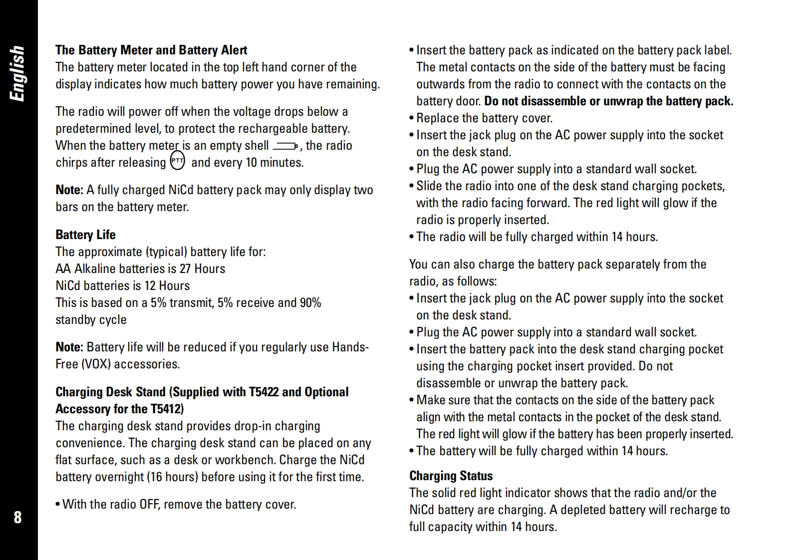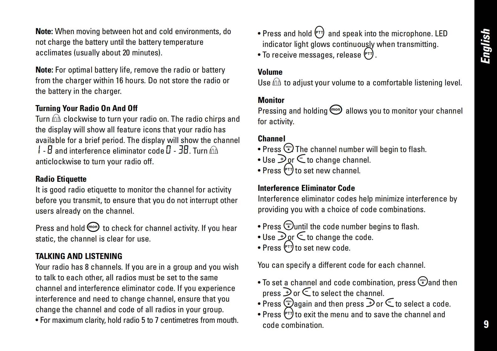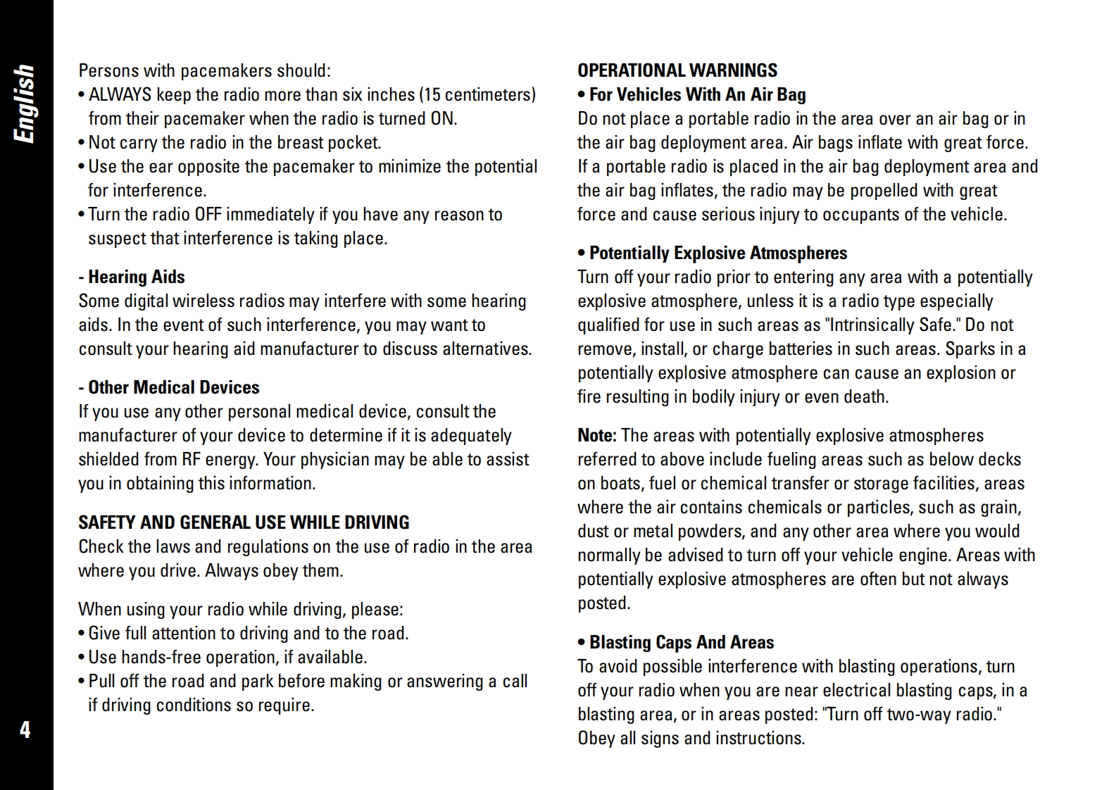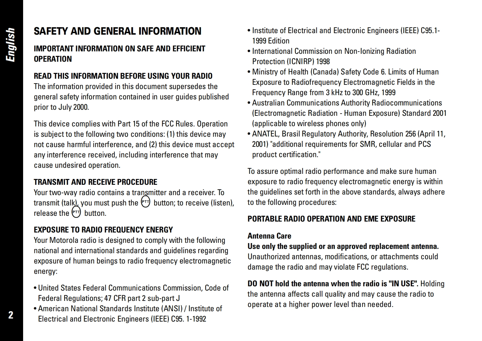 ContentsSAFETY AND GENERAL INFORMATIONys!6ugInterference Eliminator Code9Transmit And Receive Procedure2Time-Out Timer10Exposure To Radio Frequency Energy2Keypad Lock10Portable Radio Operation And EME Exposure2Hands Free Use (VOX)10Electromagnetic Interference/Compatibility3ALERTSSafety And General Use While Driving4Channel Busy Indicator11Operational WarningsCall Tone11Operational Cautions5Roger Beep(Talk Confirmation Tone)11Charger Safety Instructions5ACCESSORIESGETTING STARTEDBelt Clip11Your New RadioFront Covers11Batteries and Battery ChargingInstallation of Batteries7FURTHER INFORMATIONThe Battery Meter and Battery Alert8Talk Range12Battery Life8Troubleshooting13Charging Desk Stand8Use And Care14Turning Your Radio On And Off9Specifications15Radio Etiquette9Warranty Information15Copyright Information15TALKING AND LISTENINGVolume9APPROVED ACCESSORIES LISTMonitor9Approved Accessories List17Channel9