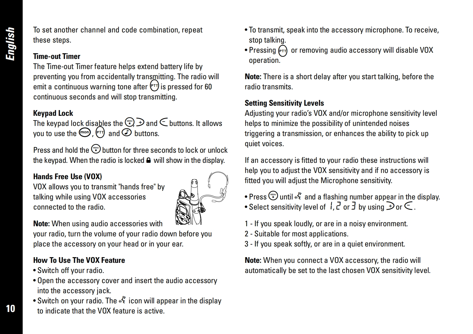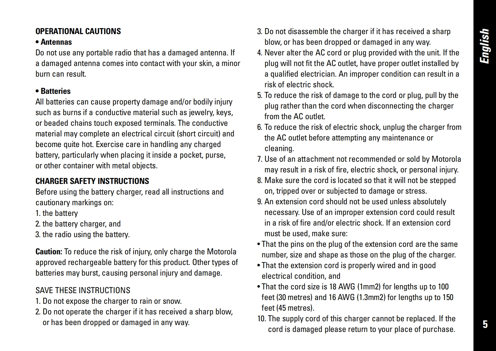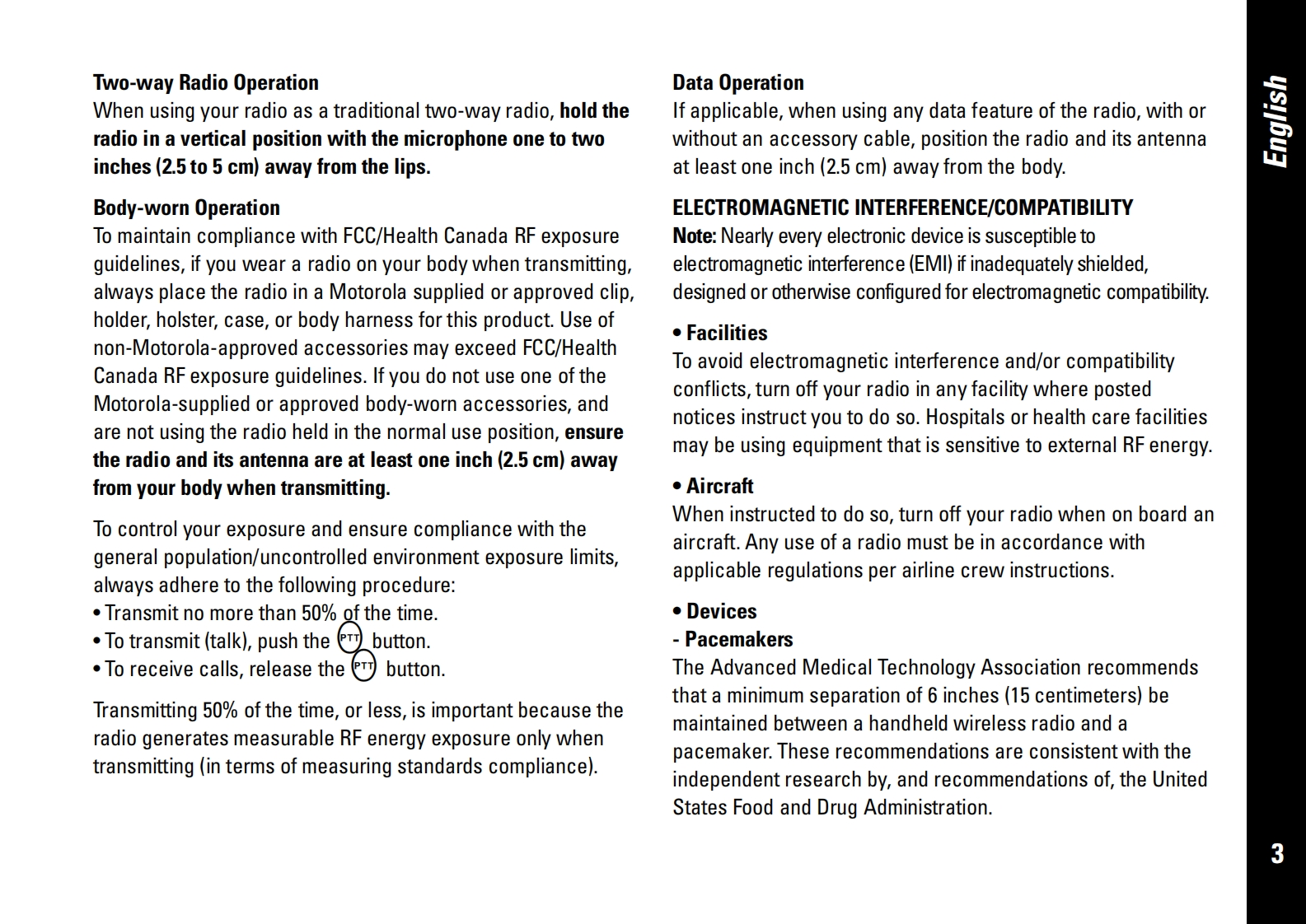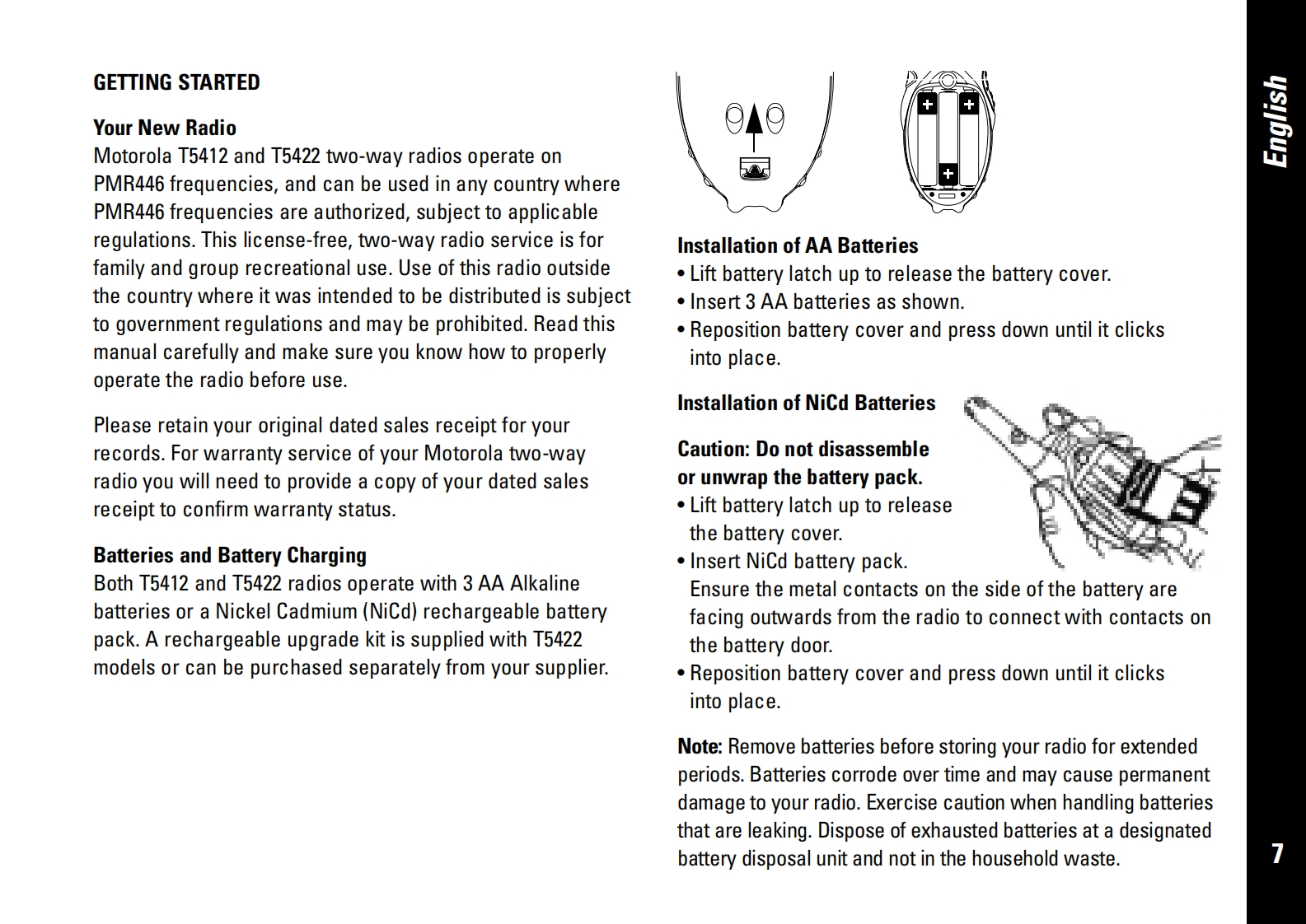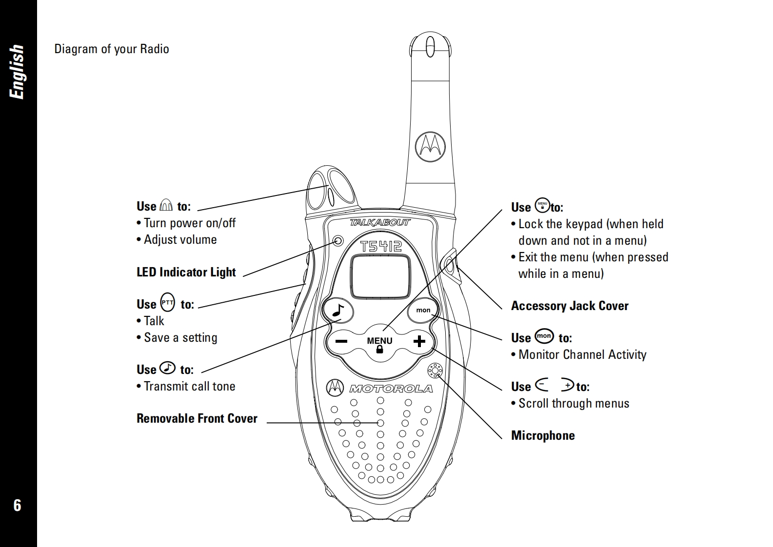 ContentsSAFETY AND GENERAL INFORMATIONys!6ugInterference Eliminator Code9Transmit And Receive Procedure2Time-Out Timer10Exposure To Radio Frequency Energy2Keypad Lock10Portable Radio Operation And EME Exposure2Hands Free Use (VOX)10Electromagnetic Interference/Compatibility3ALERTSSafety And General Use While Driving4Channel Busy Indicator11Operational WarningsCall Tone11Operational Cautions5Roger Beep(Talk Confirmation Tone)11Charger Safety Instructions5ACCESSORIESGETTING STARTEDBelt Clip11Your New RadioFront Covers11Batteries and Battery ChargingInstallation of Batteries7FURTHER INFORMATIONThe Battery Meter and Battery Alert8Talk Range12Battery Life8Troubleshooting13Charging Desk Stand8Use And Care14Turning Your Radio On And Off9Specifications15Radio Etiquette9Warranty Information15Copyright Information15TALKING AND LISTENINGVolume9APPROVED ACCESSORIES LISTMonitor9Approved Accessories List17Channel9