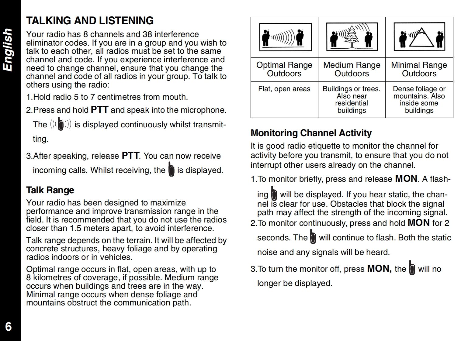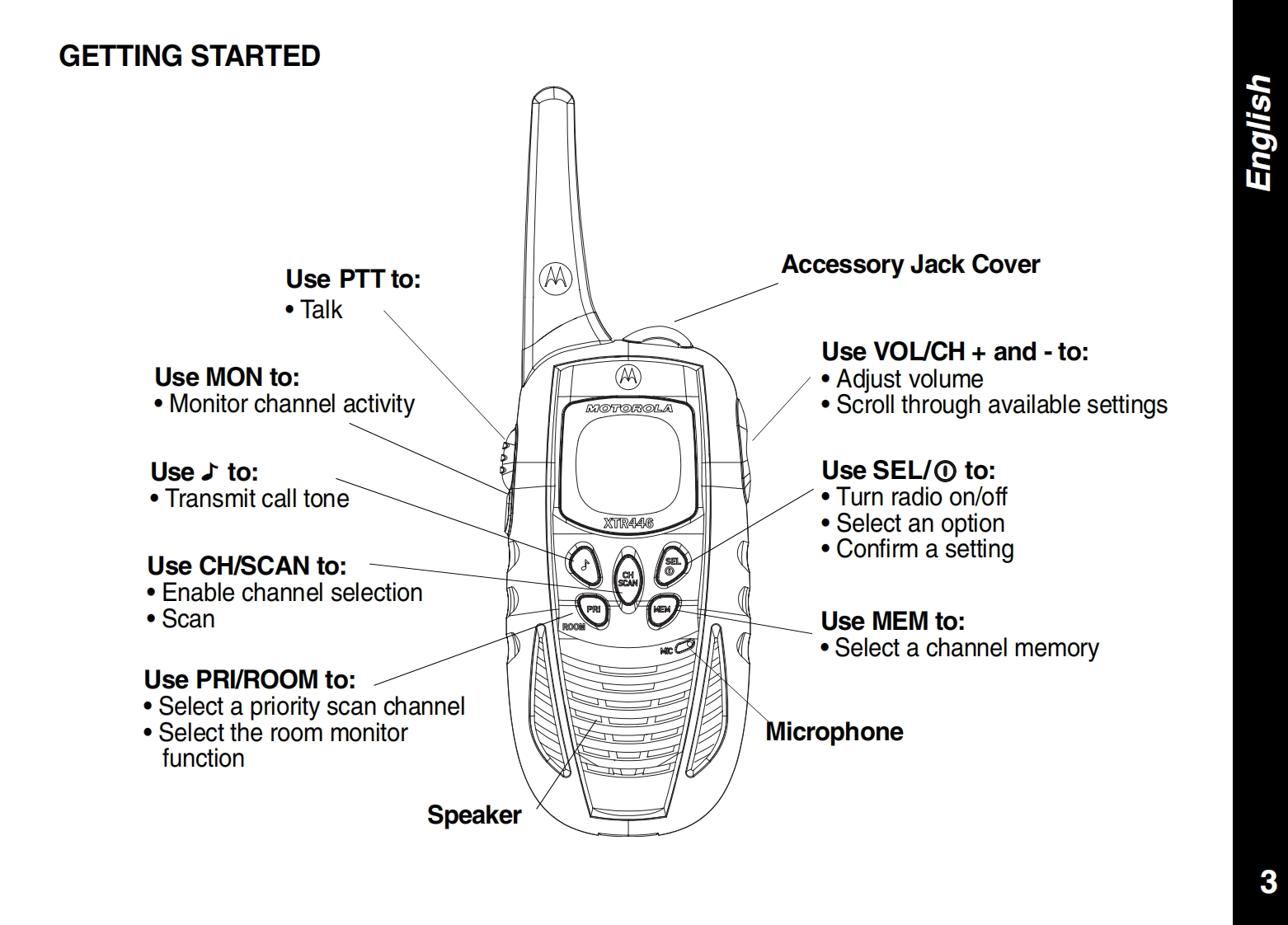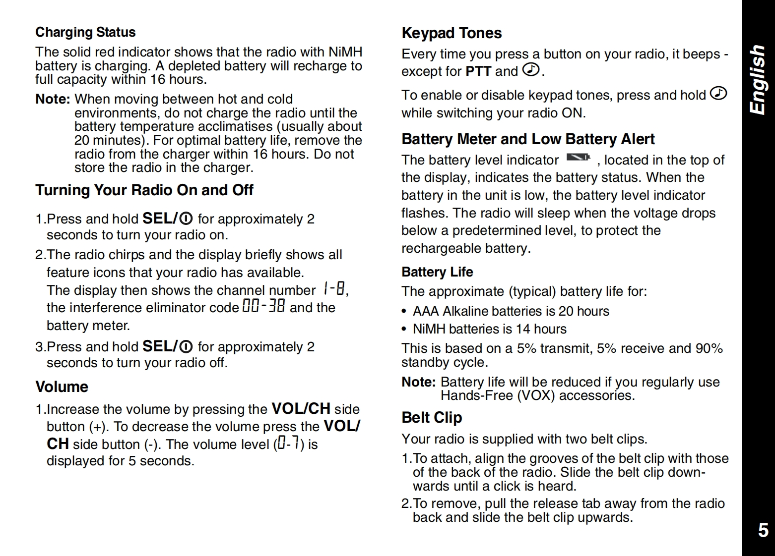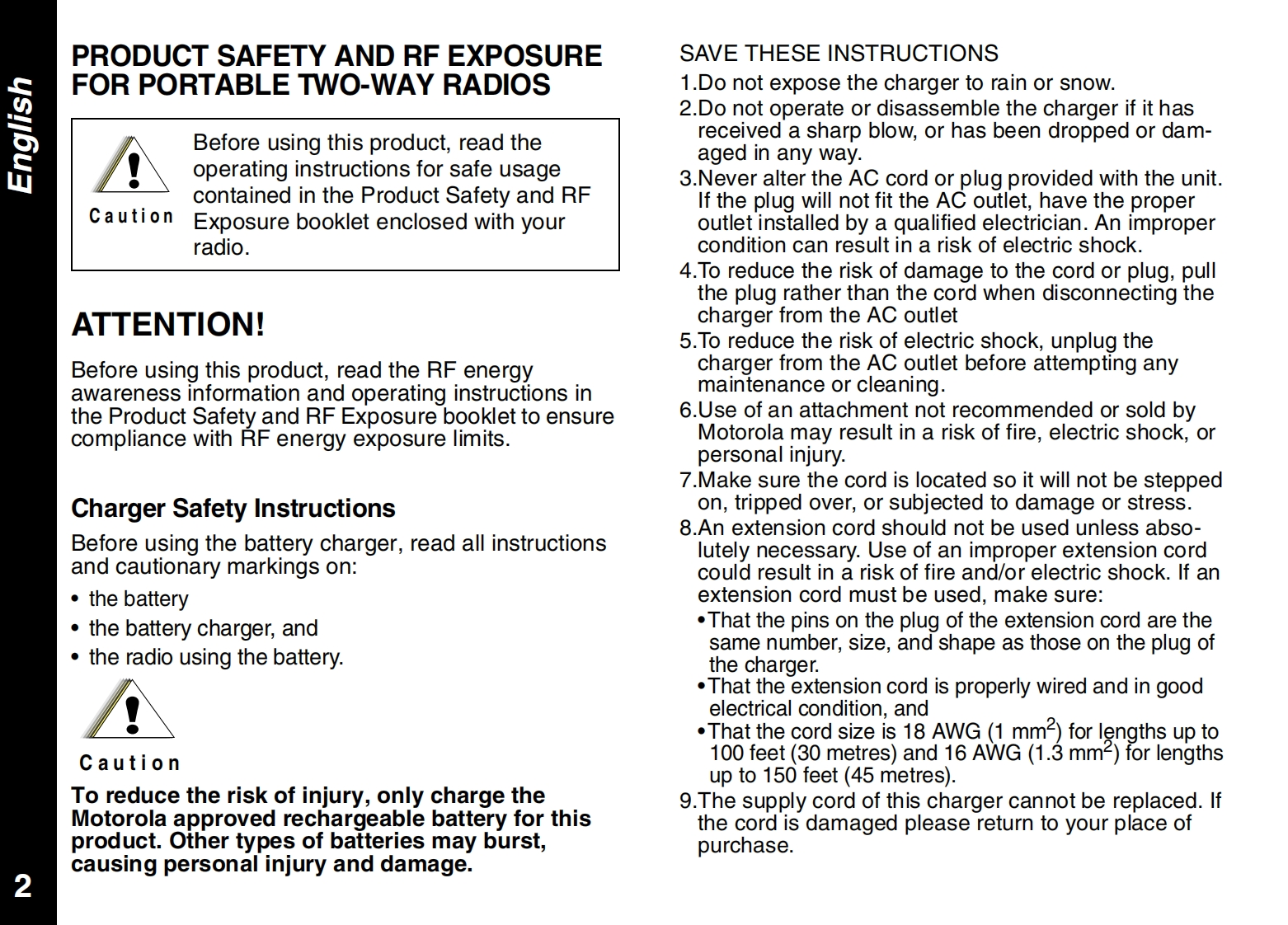 CONTENTSPRODUCT SAFETY AND RF EXPOSUREALERTSFOR PORTABLE TWO-WAY RADIOSCall Tone........10Safety Information........2Talk Confirmation Tone10Charger Safety Instructions ................2FURTHER INFORMATIONGETTING STARTEDTroubleshooting .....11Your New Radio............4Use and Care ..12Batteries and Battery Charging....4Specifications....12Turning Your Radio On and Off.5Warranty Information.13Volume.....··:.5Copyright Information......13Keypad Tones ......5APPROVED ACCESSORIES LISTBattery Meter and Low Battery Alert...5Belt Clip................5Approved Accessories List.......15TALKING AND LISTENINGTalk Range.......6Monitoring Channel Activity.6Selecting a Radio Channel1Interference Eliminator Code,7Channel Memory...·1Scan....········8Priority Channel Scan Feature8Hands Free Use(VOX)....8Room Monitor .......9Automatic Power Save9Keypad Lock ..9Backlight.9