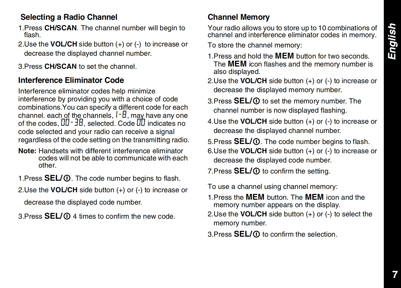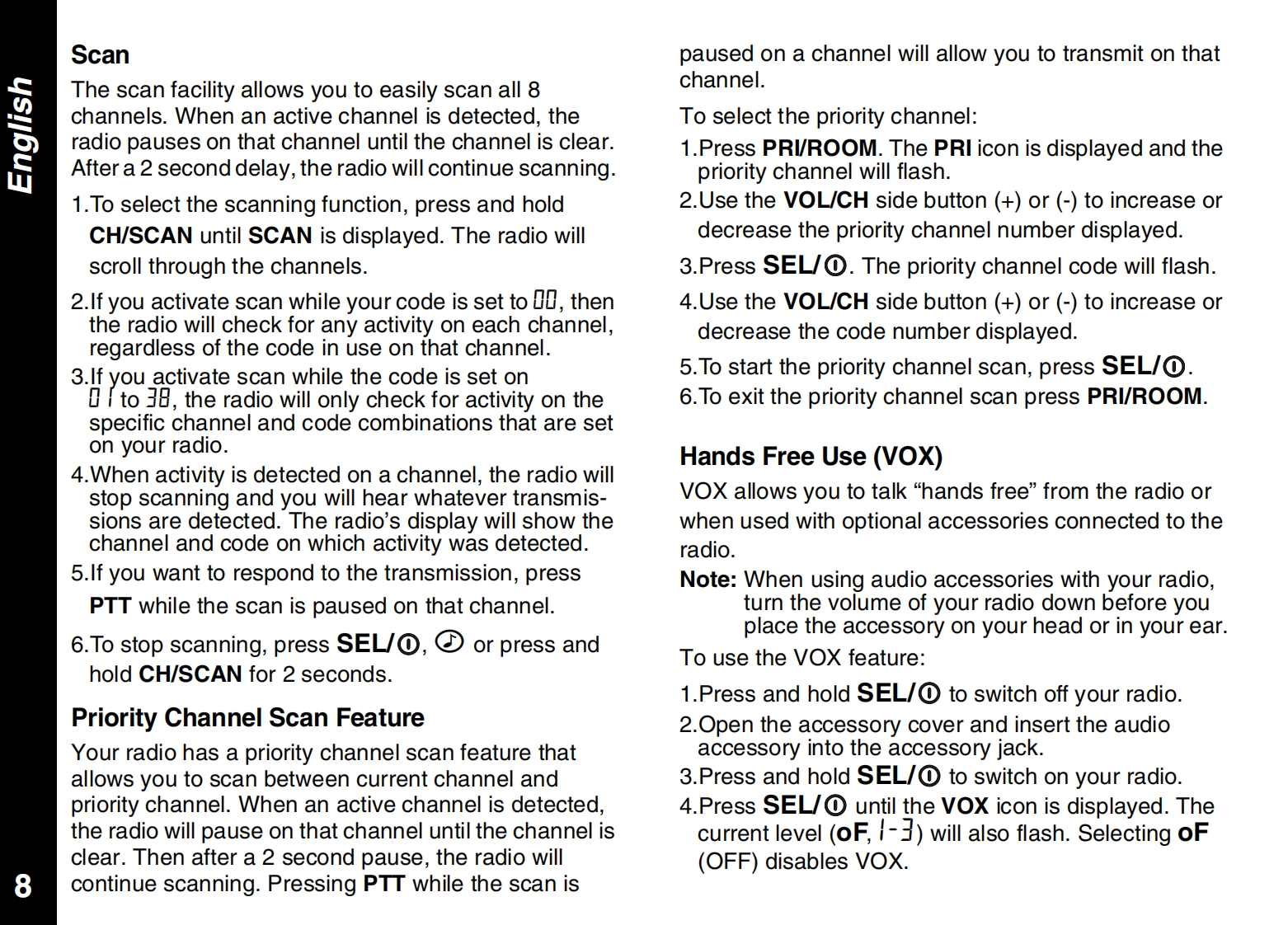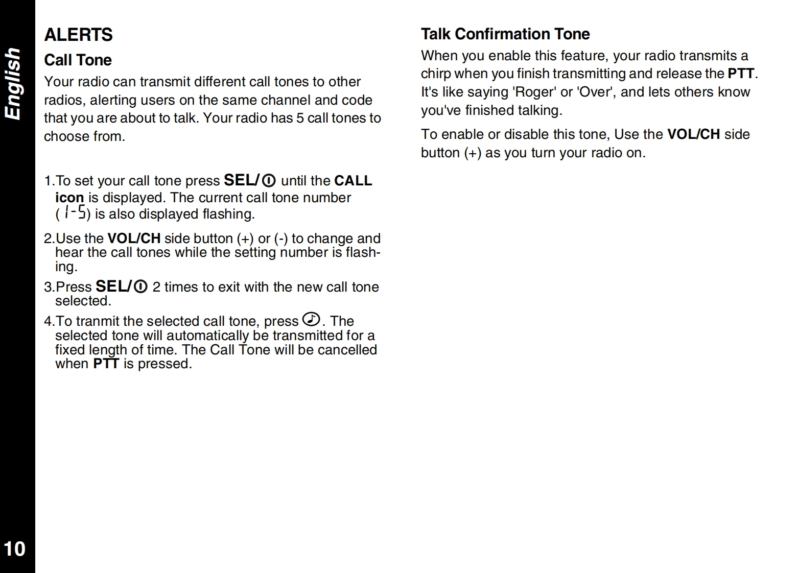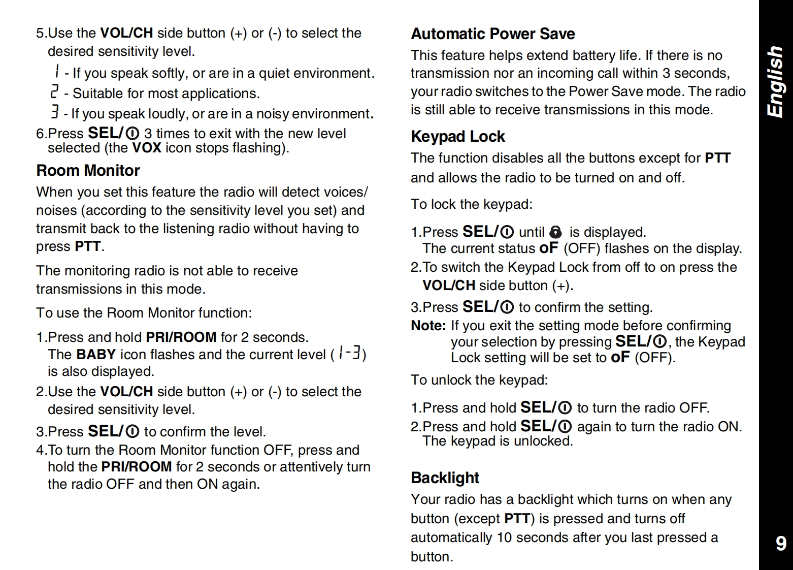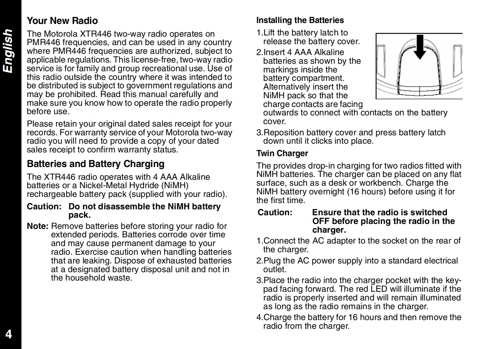 CONTENTSPRODUCT SAFETY AND RF EXPOSUREALERTSFOR PORTABLE TWO-WAY RADIOSCall Tone........10Safety Information........2Talk Confirmation Tone10Charger Safety Instructions ................2FURTHER INFORMATIONGETTING STARTEDTroubleshooting .....11Your New Radio............4Use and Care ..12Batteries and Battery Charging....4Specifications....12Turning Your Radio On and Off.5Warranty Information.13Volume.....··:.5Copyright Information......13Keypad Tones ......5APPROVED ACCESSORIES LISTBattery Meter and Low Battery Alert...5Belt Clip................5Approved Accessories List.......15TALKING AND LISTENINGTalk Range.......6Monitoring Channel Activity.6Selecting a Radio Channel1Interference Eliminator Code,7Channel Memory...·1Scan....········8Priority Channel Scan Feature8Hands Free Use(VOX)....8Room Monitor .......9Automatic Power Save9Keypad Lock ..9Backlight.9