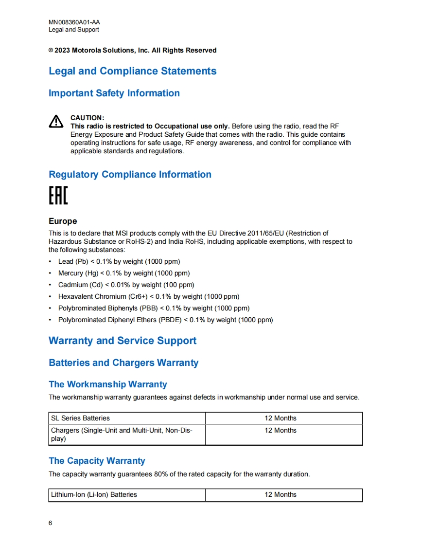 mototrbo-sl1600-user-guide操作说明书手册找手册网32天前发布关注私信1.57MB337页022mototrbo-sl1600-user-guide操作说明书手册此内容为付费资源,请付费后查看¥19¥21黄金会员免费钻石会员免费登录购买付费资源 第1页 / 共337页 第2页 / 共337页 第3页 / 共337页 第4页 / 共337页 第5页 / 共337页 第6页 / 共337页 第7页 / 共337页 第8页 / 共337页 第9页 / 共337页 第10页 / 共337页 试读已结束,还剩327页,您可下载完整版后进行离线阅读 THE END摩托罗拉 文本预览 MOTOTRBOTMPROFESSIONAL DIGITAL TWO-WAY RADIOSL1600 Portable RadioUser GuideMARCH 20232023 Motorola Solutions,Inc.All rights reservedMN008360A01-AA 查看更多 收起部分 喜欢就支持一下吧收藏