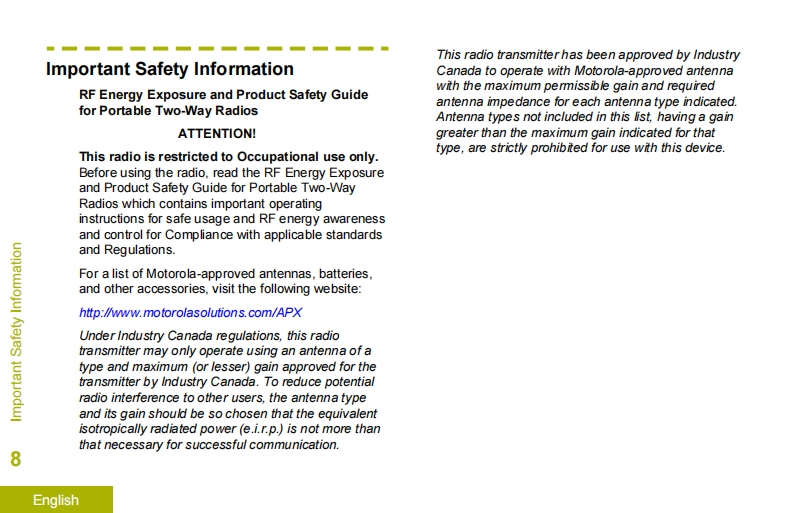 摩托罗拉APX8000XEM1对讲机操作说明书手册找手册网32天前发布关注私信3.66MB108页030摩托罗拉APX8000XEM1对讲机操作说明书手册此内容为付费资源,请付费后查看¥19¥21黄金会员免费钻石会员免费登录购买付费资源 第1页 / 共108页 第2页 / 共108页 第3页 / 共108页 第4页 / 共108页 第5页 / 共108页 第6页 / 共108页 第7页 / 共108页 第8页 / 共108页 第9页 / 共108页 第10页 / 共108页 试读已结束,还剩98页,您可下载完整版后进行离线阅读 THE END摩托罗拉 文本预览 APXTM TWO-WAY RADIOSAPX 8000XE从MODEL 1USER GUIDEMOT⊙rOLA 查看更多 收起部分 喜欢就支持一下吧收藏