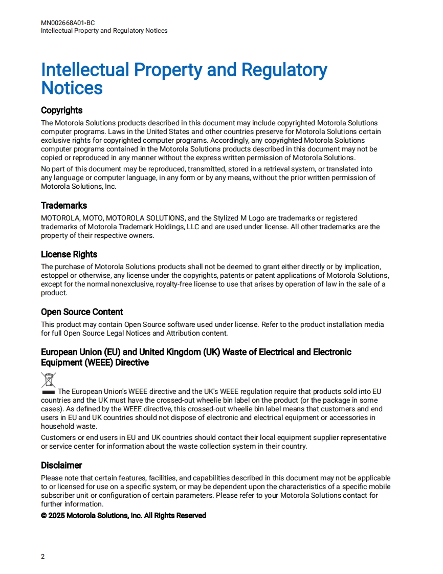 摩托罗拉APX8000XEM2.5对讲机操作说明书手册找手册网32天前发布关注私信0.95MB143页029摩托罗拉APX8000XEM2.5对讲机操作说明书手册此内容为付费资源,请付费后查看¥19¥21黄金会员免费钻石会员免费登录购买付费资源 第1页 / 共143页 第2页 / 共143页 第3页 / 共143页 第4页 / 共143页 第5页 / 共143页 第6页 / 共143页 第7页 / 共143页 第8页 / 共143页 第9页 / 共143页 第10页 / 共143页 试读已结束,还剩133页,您可下载完整版后进行离线阅读 THE END摩托罗拉 文本预览 MOTOROLA SOLUTIONSAPXTM TWO-WAY RADIOSAPX 8000XE Model 2.5 UserGuideJANUARY 2025@2025 Motorola Solutions,Inc.All Rights Reserved.MN002668A01-BC 查看更多 收起部分 喜欢就支持一下吧收藏