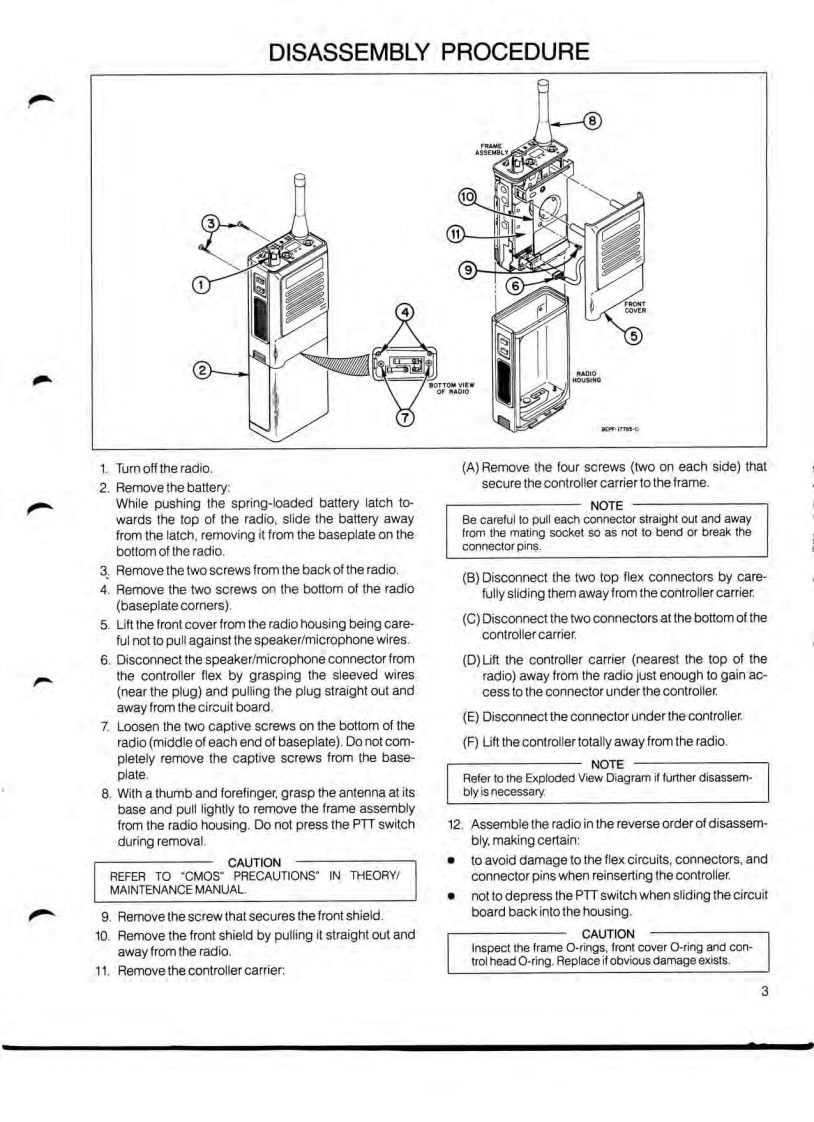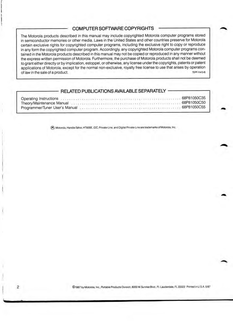 MOTOROLA“HT600E”SERIES“Handie-Talkie”Portable Radios438-470MHzSPECIFICATIONSGENERALTRANSMITTERRECEIVERFREQUENCY RANGE:438.470MHzRFOUTPUT-AUDIO OUTPUT:500mW at less thanNickel-cadmium5%distortionbattery:2.0W at9.6vdcPOWER SUPPLY:Nickel-cadmiumbatterySECI-F450kHz±1.5kHzMODULATION:Type 20KOF3E,FREQUENCY:measured at M1±5 kHz for100%BATTERY DRAIN-modulation at 1000Hzat 9.6Vdc(±4.0kH2min.)SENSITIVITY:0.35UV max.Standby:"44mAincluding PL(12 dB SINAD)】Standby with Scan:*52mAmodulation forStandby withPLmodels*36mANOISE SQUELCHBattery SaverNoise compensatedReceive:·149mASENSITIVITY:type,Programmable;PL MODULATION:Transmit:*825mAopens from.18uV±1 kHz max±500 Hz min'Add 8mA with Remote AntennaAdd 15mA with Remote Antenna3MHzAUDIOLess than 5%atSWITCHINGDISTORTION:1000Hz,3kHzBANDWIDTH:(no degradation)BATTERY LIFE:deviationBased on 5%transmit,20%receive with ratedFREQUENCY STABILITY:af output,75%standby with Battery Saver andSWITCHING17MHz±.0005%trom-10℃to+50CNickel-Cadmium battery,8.7 hours/chargeBANDWIDTH:(no degradation)(+25℃ret)DIMENSIONS:FREQUENCY STABILITY:USEABLEWIDTH:2.70(66.8mmj±.0005%from-10℃to+50CBANDWIDTH:±5kHzDEPTH:1.55(39.4mm)(+25Cref.)HEIGHT:Radio Only3.89(99.0mm)SPURIOUS HARMONICSPURIOUS FREQUENCYRadio with BatteryFREQUENCIES:0.25uWREJECTION:>60dBHigh Capacity6.98(177.3mmjFMNOISE:MAGE REJECTION:>60dBWEIGHT:At least 45dB below 3.0kHz deviationRadio Only13.50z(383g)at 1000HzSELECTIVITYRadio with Battery (Nickel-Cadmium)(CEPT):>70dBLow Capacity19.00z(539g)AUDIO RESPONSE:Medium Capacity21.60z(612g)+1.-3dB from 6dB/octave pre-emphasisHigh Capacity24.102(684gcharacteristic from 300-3000HzINTERMODULATION:>70dBSpecifications Subject To Change Without NoticeNOTE:ALL BATTERIES MUST BE CHARGED PRIOR TO USE.USE OF CHEMICALS(DETERGENTS.ALCOHOL,AEROSOL SPRAY,PETROLEUM PRODUCTS)MAY BE HARMFUL AND DAMAGE THE RADIO HOUSING.WERECOMMEND A MILD DISHWASHING SOAP FOR CLEANING THE EXTERIOR OF THE PRODUCT..O-RING SEALS MUST BE PROPERLY LUBRICATED AND ASSEMBLED TO INSURE CONFORMANCE TO MIL-810D SPECIFICATIONS FOR WATER INTRUSION.Service Manual68P81050C45-0