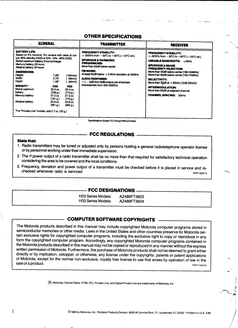 MOTOROLAHT90”SERIES“Handie-Talkie”Portable Fadios136-174MHzSPECIFICATIONSGENERALTRANSMITTERRECEIVERFREQUENCY RANGE:136-174MHzRF OUTPUT-H23H33AUDIO OUTPUT:500mW at less thanPOWER SUPPLY:(1)Nickel-cadmiumNickel-cadmium2.0Wat5.0W at5%distortionbattery,battery:12.5c12.5dcFREQUENCY:(1)Mercury battery.orMercury/Alkaline1.25W at3.0W at455kHz±1.5Hz(1)Alkaline batterybattery:11.5Vdc11.5dcmeasured at M2BATTERY DRAIN-·SENSITIVITY:FREQUENCY:0.25uV max.(12dBWithin±750Hzat12.5VdcH23H33of desired frequencySINAD).0.35uVmax.Standby:12mA12mA(20 dB quieting】Receive85mA65mAMODULATION:Type16F3,±5kHzNOISE SQUELCHNoise compensatedTransmit:450mA1000mAfor 100%modulationSENSITIVITY:type,adjustable;at1000Hz(±4.0kHzopens from 0.18uVmin.)including PLmodulation forMAX.PERMISSIBLECHANNELPLmodels1MHzSEPARATION:(no degradation)PL MODULATION:±1 kHz max.±500 Hz min.AUDIOLess than 5%atDISTORTION:1000Hz,3kHzdeviationMAX.PERMISSIBLECHANNEL'For"Private-Line"models,add 4mA to drain1MHzSEPARATION(no degradation)Specifications Subject To Change Without NoticeNOTE:ALL BATTERIES MUST BECHARGED PRIOR TOUSE.USE OF CHEMICALS(DETERGENTS,ALCOHOL.AEROSOL SPRAY,PETROLEUM PRODUCTS)MAY BE HARMFUL AND DAMAGE THE RADIO HOUSING.WERECOMMEND A MILD DISHWASHING SOAP FOR CLEANING THE EXTERIOR OF THE PRODUCT.O-RING SEALS MUST BE PROPERLY LUBRICATED AND ASSEMBLED TOINSURE CONFORMANCE TO MIL-810C SPECIFICATIONS FOR WATER INTAUSION.HT90 MODELSRelated Publications Availablas paratelyHMB SERIESHMU SERIESNUMBERTYPEOperating Instructions.................68P81022C702W 5W2W5WOFOFTheory/Maintenance Martual.............68P81022C85H23HMB H33HMB'H23HMU H33HMUCHANNELSSQUELCHQuick Reference Card...................68P81022C711124A1124A1124A1124A2Carrier3124A3124A3124A3124A2Tone PL6124A6124A6124A6124ADigital PLService Manual68P81022C75-D