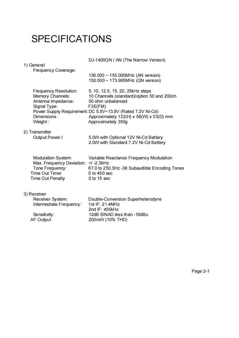 DJ-180DJ-1400Service ManualCONTENTSSPECIFICATIONSPC BOARD VIEW1)General31)VCO Unit22)Transmitter22)JACK Unit3)Receiver23)PTT Unit Side B4)Functions for Each Version4)PS Unit242425CIRCUIT DESCRIPTION5)ROM1 Unit Side B1)Receiver Systemg6)ROM2 Unit Side B2)PLL VCO Circuit.7)RF Unit Side A3)Transmitter System58)RF Unit Side B2526274)DTMF Encoder Circuit (option).69)CPU Unit Side A.5)Tone Squelch Circuit (option)610)CPU Unit Side B6)Microprocessor and Peripheral Circuit611)RE Unit7)Terminal Function of Microprocessor>2829808012)CTCSS UniLSEMICONDUCTOR DATA13)DTMF Unit.1)LR40872110PARTS LAST2)M5218FP10CPU unit3)M5236ML10PS unit.4)MB1504LPF11ROM1 Unit5MC335711DTMF Unit6)MX36512RF Unit33-7)NJM38613Vco unit8)RH5VA32AA13CTCSS Unit9)RH5VA45AA.13PTT SW Unit10)X24C01A14JACK Unit3811)X24C04S1414RE Unit312)X24C16S1414Others13)Transistor,Diode and LED Outline Draw15ROM2 Unit314)LCD Connection.16PACKING38EXPLODED VIEWParts Table for Each Version.391)Rear Case 117ADJUSTMENT2)LCD171)Required Test Equipment.403)Rear Case 2182)Before Adjustment04)Front Case 1193)Adjustment for DJ180.DJ1400415)Front Case 2204)Adjustment for DJ1400AN/QN426)Front Case 3 and Battery Terminal215)Adjustment Quick Reference437)Ten Key Cover and Key Pad Panel226)Adjustment Points.43-448)CTCSS Unit and ROM1 Unit23CIRCUIT DIAGRAM45~46BLOCK DIAGRAM47ALINCO INCORPORATEDTWIN 21 M.I.D.TOWER BUILDING 23F,1-61,2-CHOME,SHIROMI CHUO-KU,OSAKA,540-8580 JAPANTel(81)6-6946-8150fax(81)6-6946-8175e-mail:export@alinco.co.jp