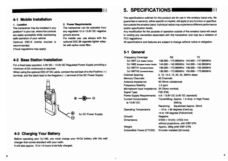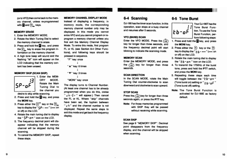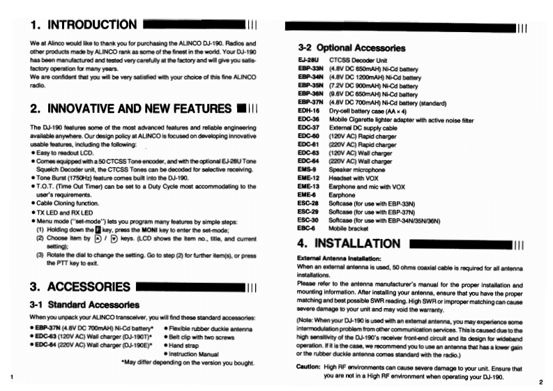 ALINCO111111111111111VHF FM HANDHELD TRANSCEIVERDJ-190INSTRUCTION MANUALALINCO,INC.Head offies:TWIN 21MID Teer Building 25F1-61,2-Chome,Shiemi,Chuo-ku,Ouaku 540-6680 Japancna:06946-8150Faa:06-0466176Ta4:63006mt101243.1446●U5A:4AmSure 130.Te,CA9001601U.sA审pwnw.9mGermany:Eschbomor Landstrasse 55,60489 Franklurt am Man,GermanyP件cna:069-780018Fae069789-60766Thank you for purchasing this ALINCO trans-celver.To obtain optimum performance from thistransceiver.read this Instruction Manuala0网thoroughly.and keep it for future reterence.The LCD display examples in this InstructionManual use the DU-190T's LCD display.1Copyright 1998 Aince.ing.Osaka JepanPrimod in JapanPS02270