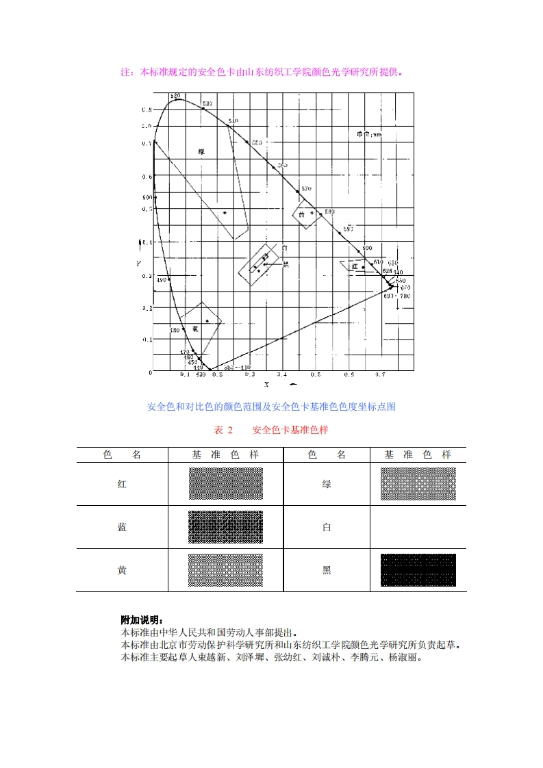 安全色卡GB6527.1一1986中华人民共和国国家标准UDC614.8GB6527.1-1986安全色卡Safety colour card国家标准局1986一06一21发布1987一04一01实施本标准规定的安全色卡包括GB2893一1982《安全色》中规定的红、蓝、黄、绿四种安全色和黑白两种对比色。它是安全色涂料生产和使用单位在配制和选择安全色涂料时的依据。GB2893一1982中规定的色度范围较宽,在同一范围内颜色差别较大,为使安全色卡达到最佳的分辨率和一律的色度,以便于人们能准确、迅速地辨认,更好地提高人们对不安全因素的警惕,使色觉正常和异常者均能看得清,应选择最佳色度范围,确定安全基准色。安全色卡具有最佳的颜色辨认率,即使在傍晚或普通的人造光源下也比较容易识别,并具有较好的防潮、防晒、防老化性能。1各安全色卡的基准值及允许色差范围见表1。表1安全色卡基准值及允许色差范围XYZ表色系孟塞尔标号色名基准值基准值允许色差范围yYHV/C△H△VAC红0.63540.32560.104710R4/15+0.1-2.5+0.2蓝0.16630.16550.05052.5PB3/92.5+0.3-0.2黄0.48050.47670.49005.0Y8/14+0.2-28以上绿0.22910.46900.12594G4/9+1-0.5+0.3白0.31870.33250.8676N9.59以上黑0.33000.33000.0010N0.10.5以下注(I)光源:标准光源D(2)照明与观察条件:0/d。(3)表中色用CE196410°视场XYZ表色系和孟塞尔标号表示。2安全色卡基准色色度坐标点图。3安全色卡基准色样见表2。4本标准采用北方天空白昼光或人造标准D65光源照射。5照射在色卡上的照度应均匀,不应小于T了34一1979《工业企业照明设计标准》的允许照度,采用45/0°照明与观察条件。在视野周围不允许有色彩强烈的物体反射光。6安全色卡应保存在清洁、干燥、黑暗处,防止沾污与擦伤。使用时应避免太阳光直接照射,如有损坏或变色,应立即停止使用。