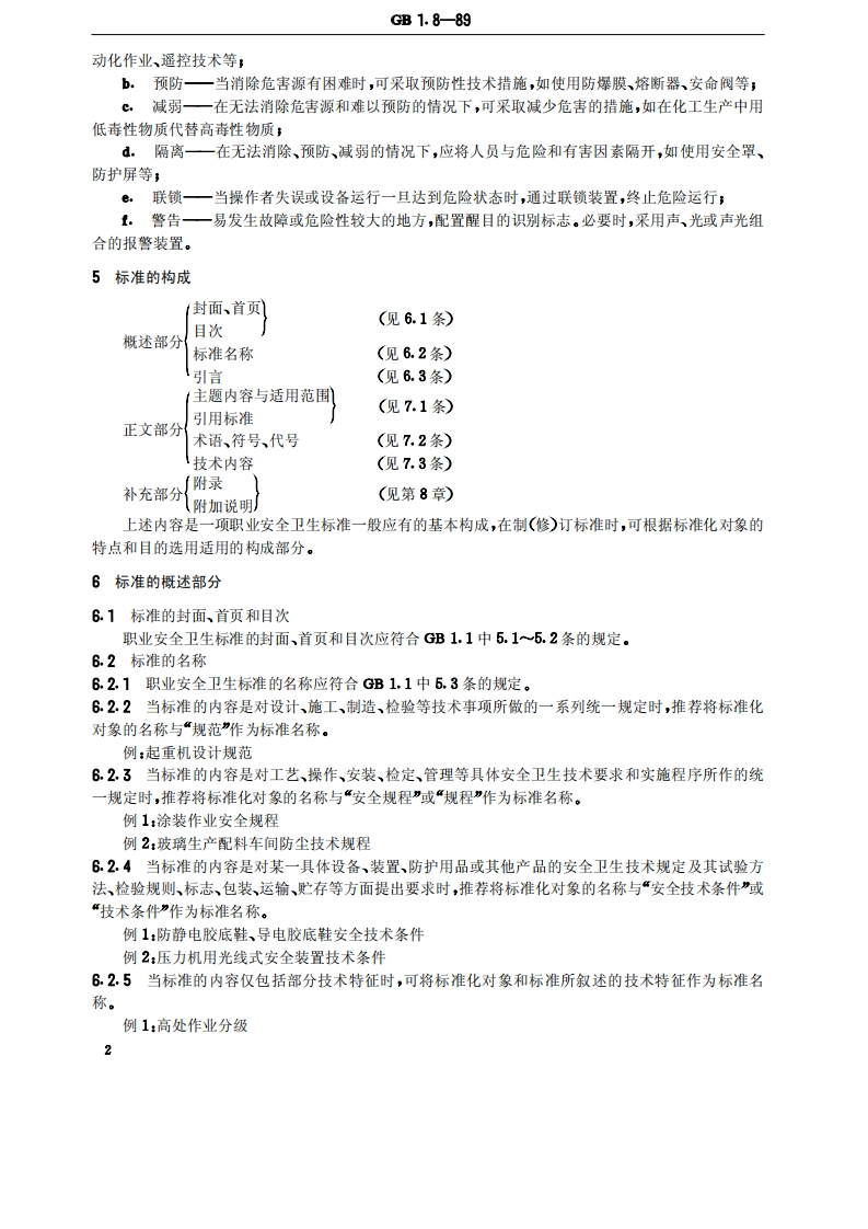 中华人民共和国国家标准UDC 006标准化工作导则GB1.889职业安全卫生标准编写规定Directives for the work of standardizationRules for drafting occupational safetyand health standards1主题内容与适用范围本标准规定了职业安全卫生标准编写的基本原则、要求和方法。本标准适用于编写职业安全卫生国家标准、专业标准,也适用于编写其他种类标准(如产品标准、方法标准)中有关安全卫生技术规定的条文。编写有关的地方标准、企业标准时,亦应参照使用。本标准中的职业卫生系指卫生工程技术和组织管理。2引用标准GB1.1标准化工作导则标准编写的基本规定GB1.3标准化工作导则产品标准编写规定3术语3.1危险因素hazardous factors能对人造成伤亡或对物造成突发性损坏的因素。3.2有害因素harmful factors能影响人的身心健康,导致疾病(含职业病),或对物造成慢性损坏的因素。3.3职业安全卫生标准occupational safety and health standards为消除、限制或预防职业活动中的危险和有害因素而制订的标准。4标准编写的基本要求41在职业活动中,若存在物理、化学、生物、心理、生理的,以及其他种类的危险和有害因素时,应制订相应的安全卫生标准,或在其他种类标准中编写有关的安全卫生技术规定。常见的危险和有害因素见附录A(参考件)。4.2职业安全卫生标准的编写应符合GB1.1中的规定。43职业安全卫生标准的技术内容应贯彻“安全第一、预防为主”的方针,并符合我国有关法规和标准的要求。4,4职业安全卫生标准应积极采用国际标准和国外先进标准。4,5制订职业安全卫生标准时,应充分吸取职业活动中的事故教训。46在标准中规定安全卫生技术措施时,应遵循下述原则:a。消除一一通过合理的计划、设计和科学管理,尽可能从根本上消除危险和有害因素,如采用自国家技术监督局1989一02一22批准1989-09-01实施1