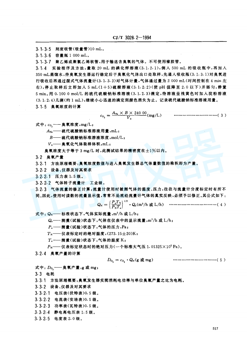 中华人民共和国城镇建设行业标准臭氧发生器臭氧浓度、产量、电耗的测量CJ/T3028.2-1994The measures of ozone concentration,output andspecific energy consumption for ozone generator1主题内容与适用范圆本标准规定了臭氧发生器的臭氧浓度,产量和电耗的测定及计算方法。适用于以电为能源臭氧发生器的测定,2名词术语电耗specific energy consumption设备生产单位重量的成品所消耗的电能。3奥氧发生器的奥氧浓度、产量、电耗的测量和计算方法3.1臭氧浓度3.1.1方法原理概要:臭氧(O,)是一种强氧化剂,与碘化钾(KI)水溶液反应可游离出陕,在取样结束并对溶液酸化后,用0.1000mol/L硫代硫酸钠(NaS,O,)标准溶液并以淀粉溶液为指示剂对游离碘进行滴定,根据硫代硫酸钠标准溶液的消耗量计算出臭氧量。其反应式为:0,+2KI+H,0-→O2+12+2KOH0*45***t小(1)I:+2Na2S2O3-2NaI Na:S.O3.1.2试剂3.1.2.1碘化钾(KI)溶液(20%):溶解200g碘化钾(分析纯)于1000mL煮沸后冷却的蒸馏水中,用棕色瓶保存于冰箱中,至少储存一天后再用。此溶液1.00mL含0.20g陕化钾。3.1.2.2(1十5)硫酸(HS0)溶液:量取浓硫酸(=1.84:分析纯)溶于5倍体积的蒸馏水中。3.1.2.3c(NaS,0·5H,0)=0.1000mol/L疏代硫酸钠标准溶液:使用分析天平准确称取24.817g硫代硫酸钠(Na2S2O,·5H2O:分析纯)用新煮沸怜却的蒸馏水定溶于1000mL的容量瓶中。或称取25g硫代疏酸钠(NaS,O,·5H,O,分析纯)溶于1000mL新煮沸冷却的燕馏水中,此溶液硫代硫酸钠浓度约为0.1mol/L。再加入0.2g碳酸钠(NaCO,)或5mL三氯甲烷(CHCl),标定,调整浓度到0.1000mol/L,贮于棕色瓶中,储存的时间过长时,使用前需重新标定(标定方法见附录A)。3.12.4淀粉溶液:称取1g可溶性溶粉,用冷水调成悬浮浆,然后加人约80mL煮沸水中,边加边搅拌,稀释到100mL:煮沸几分钟后放置沉淀过夜,取上清液使用,如需较长时间保存可加入1.25g水杨酸或0.4g氯化锌。3.1.3试验仪器、设备及对其要求3.1.3.1三角洗瓶(吸收瓶)500mL。3.1.3.2滴定管50mL,宜用精密滴定管。3.1.3.3湿式气体流量计容量5L。3.1.3.4量筒20mL500mL各一只。中华人民共和国建设部1994-04-13发布1994-12-01实施516
