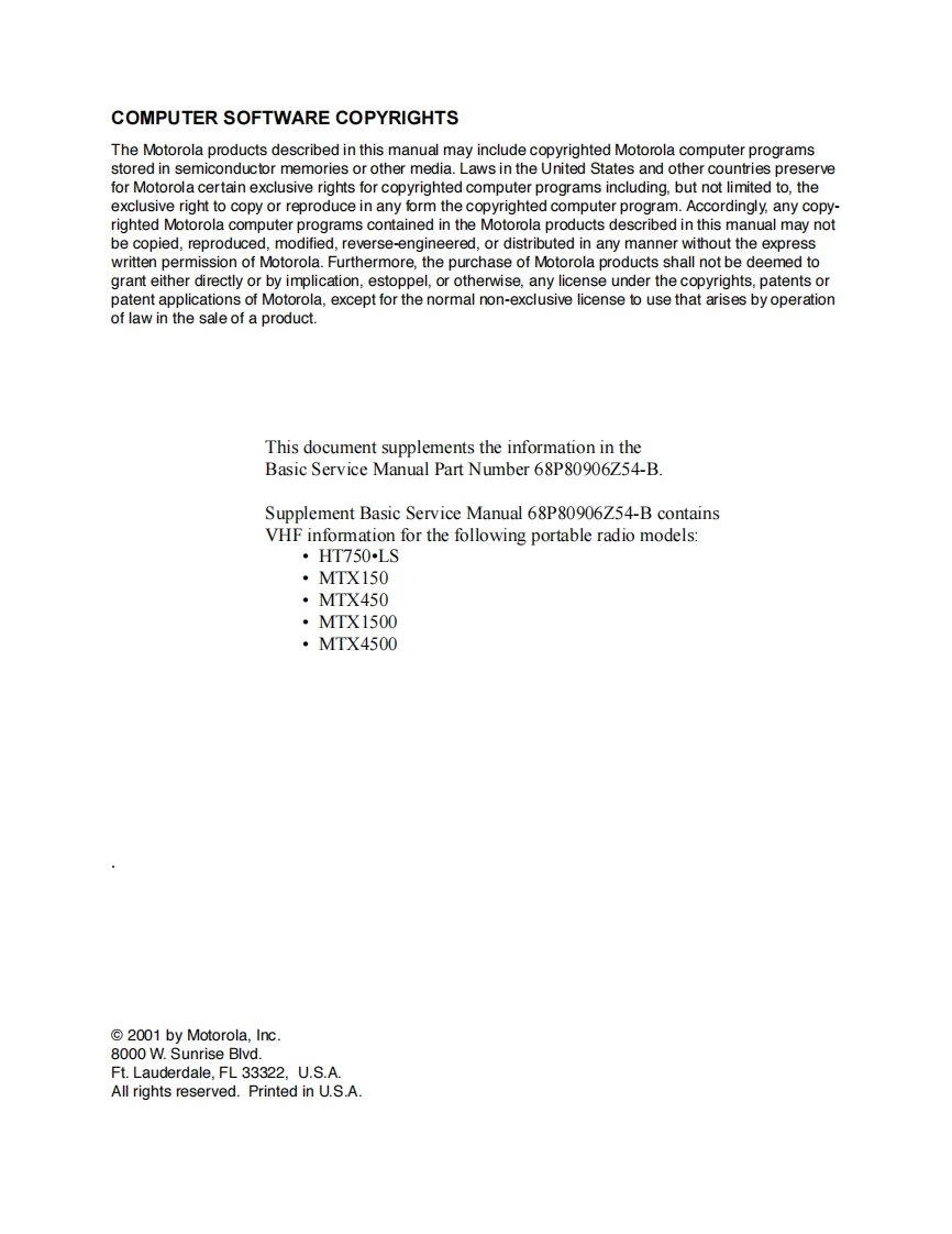 NOVACOMMUNICATIONS0 worono一款型MOTOROLAMOTOROLAHT750.LSMTX150MTX450MTX1500MTX4500Portable Radiosquality④MOTOROLAversatilitySupplement toBasic Service Manual (canada only)4 ghProfessional Portable Radio Basic Service Manual 68P80906Z54