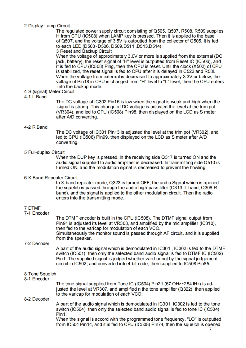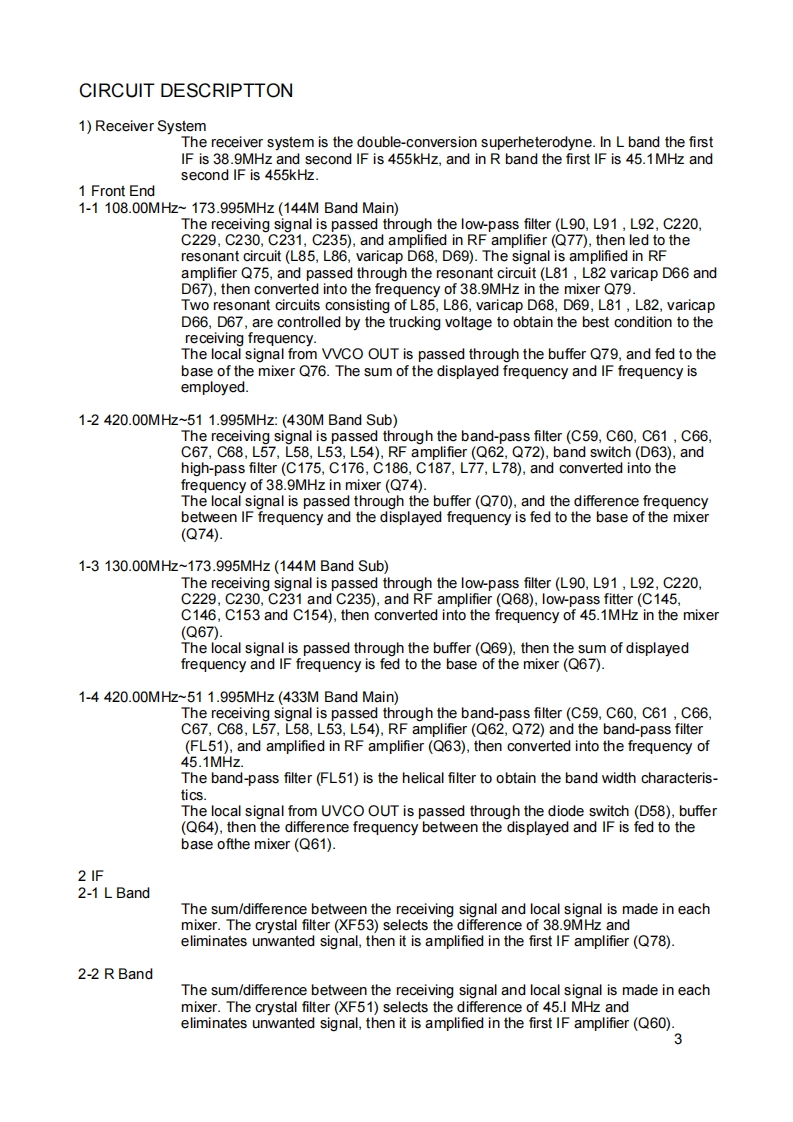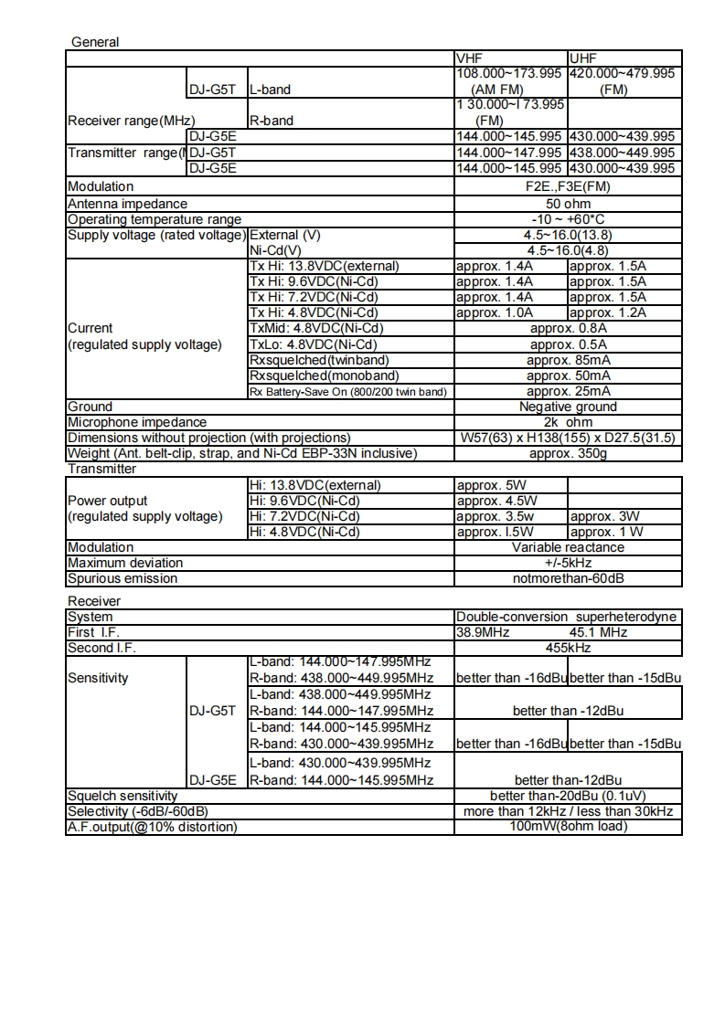 DJ-G5Service ManualCONTENTSSPECIFICATIONS2PARTS LISTRF Unit37-40IF Unit41-44CIRCUIT DESCRIPTIONCPU Unit44-461)Receiver System3-5SW UniL462)Transmitter System5UVCO Unit463)PLL Synthesizer Circuit6VCO Unit474)CPU and Peripheral Circuit6-7CHARGE Unit475)Terminal function of CPU10-12PTT Unit6)Terminal function of 409413Mechanical Parts87)Frequency Table13SEMICONDUCTOR DATAADJUSTMENTI)AK2341141)Required Test Equipment42)BU4094BF152)Adjustment for DJ-G5T/E03)HD64338773)Adjustment Points514)LC75366M175)LC73881M186)M64076GP19PC BOARD VIEW7)MC3372VM201)RF Unit Side A528)NJM2100W22)RF Unit Side B9)NJM2070M13)IF Unit Side A10)RH5RH501A4)1F Unit Side B11)RH5RH651A225)CPU Unit Side A8145566712)S-80730SL-AT36)CPU Unit Side B13)S-AV28247)UVCO Unit814)S-AU5728)WVCO Unit15S-81237SG-QE9)PTT Unit Side A16)TA75S01F2510)PTT Unit Side B88585817)TA75W01FU2611)CHARGE Unit18)TC4W53F2612)SW Unit Side A5819)TK10930WTL2720)uPD16430AGF.3B92821)24LC16B29VOLTAGE TABLE22)Transistor,Diode and LED Outline Dra 301)Diode59-6023)LCD Unit31-322)IC60-633)Transistor63-64EXPLODED VIEW1)Charge Unit33BLOCK DIAGRAM66-672)RF Unit43)IF Unit/CPU Unit354)Front/Rear View6SCHEMATIC DIAGRAM1)RF Unit68-692)IF Unit70-713)CPU Unit72-734)UVCO Unit745)WVCO Unit756)CHARGE Unit767)PTT Unit76ALINCO INCORPORATEDTWIN 21 M.I.D.TOWER BUILDING 23F.1-61.2-CHOMESHIROMI CHUO-KU.OSAKA.540-8580 JAPANTe(81)6-6946-8150fax(81)6-6946-8175e-mail:export@alinco.co.jp