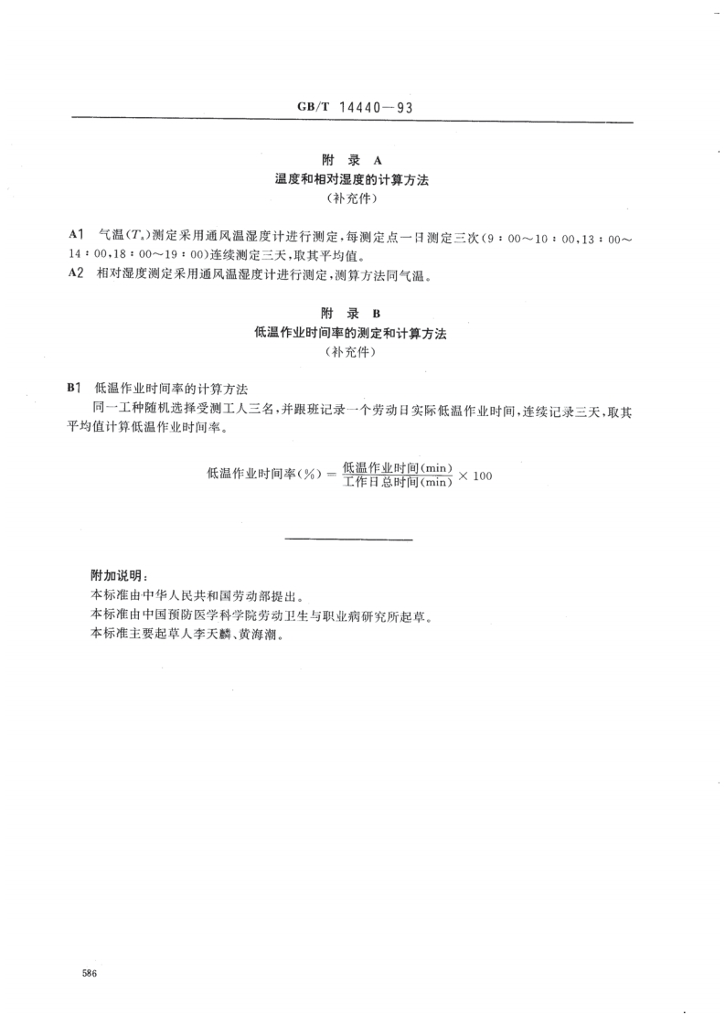 中华人民共和国国家标准GB/T14440-93低温作业分级Classification of works in cold environment1主题内容与适用范围本标准规定了低温作业环境冷强度大小及其对人体机能影响程度的级别。本标准适用于对低温作业实施劳动保护分级管理。2术语2.1低温作业在生产劳动过程中,其工作地点平均气温等于或低于5C的作业。2.2低温作业时间率一个劳动日在低温环境中净劳动时间占工作日总时间的百分率。3低温作业分级按工作地点的温度和低温作业时间率,将低温作业(按表1)分为四级,级别高者冷强度大。表1低温作业分级温度范围,C低温作业时间率,≤50<0-5<-5--10<-10-15<-15-20<-20≤25>25~50>50-75≥751注:凡低温作业地点空气相对湿度平均等于或大于80%的工种应在本标准基础上提高一级。国家技术监督局1993-06-10批准1994-01-01实施585