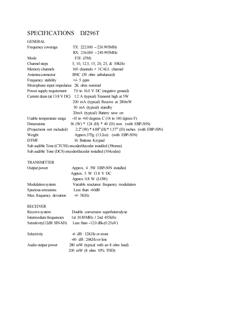 CIRCUIT DESCRIPTION DJ-296T1)Receiver SystemThe receiver system is a double superheterodyne system with a 30.85 MHz first IF and a 455kHz second IF.1.Front EndThe received signal at any frequency in the 216.00 to 249.995 MHz range is passed through thelow-pass filter (L2,L3,L8,C2,C9,C10,C11,C62 and C189),high-pass filter (C56,C57,C58,C61,L22,L25 and D15),and amplified by the RF amplifier (Q9).The signal from Q9 isthen passed through the tuning circuit (C12,C14,C65,C66,L19,120,121,D12,D13 andD14)and converted into 30.85 MHz by the mixer (Q10).The tuning circuit is controlled by thetracking voltage fom the CPU(IC9)so that it is optimized for the reception frequency.The localsignal from the VCO is passed through the buffer(Q11),and supplied to the source of the mixer(Q10).The radio uses the lower side of the superheterodyne system.2.IF CircuitThe mixer mixes the received signal with the local signal to obtain the sum of and differencebetween them.The crystal filter (XF1)selects 30.85 MHz frequency from the results andeliminates the signals of the unwanted frequencies.The first IF amplifier (Q8)then amplifies thesignal ofthe selected frequency.3.Demodulator CircuitAfter the signal is amplified by the first IF amplifier (Q8),it is input to pin 16 of the demodulatorIC (IC4).The second local signal of 30.395 MHz,which is oscillated by the intemal oscillationcircuit in IC4 and crystal (X2).Then,these two signals are mixed by the internal mixer in IC4 andthe result is converted into the second IF signal with a frequency of 455kHz The second IF signalis output from pin 3 ofIC4 to the ceramic filter (FL1),where the unwanted frequency band ofthat signal is eliminated,and the resulting signal is sent back to the IC4 through pin 5.The second IF signal input via pin 5 is demodulated by the intemal limiter amplifier and quadraturedetection circuit in IC4,and output as an audio signal through pin 10.4.Audio CircuitThe audio signal from pin 10 of IC4 is compensated to the audio frequency characteristics in the