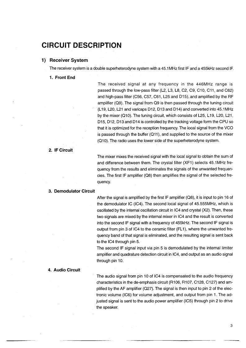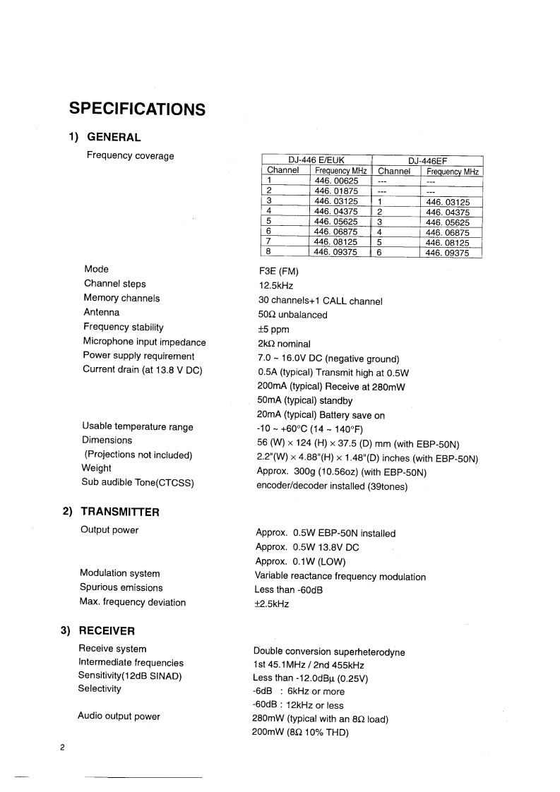DJ-446Service ManualCONTENTSSPECIFICATIONSEXPLODED VIEW1)GENERAL..,21)Front View......…152)TRANSMITTER..........22)Rear View ...........63)RECEIVER..2PARTS LIST17-22CIRCUIT DESCRIPTIONADJUSTMENT1)Receiver System3.41)Required Test Equipment ..23,242)Transmitter System......42)Adjustment Mode25-273)PLLSynthesizer Circuit4.5PC BOARD VIEW4)CPU and Peripheral Circuits5.65)M38267M8L258GP(XA0733)..6-8MAIN Unit..28,29BLOCK DIAGRAMSEMICONDUCTOR DATA301)NMJ2070MT1(XA021O)SCHEMATIC DIAGRAM.31,92)AT24C16N-10S1-2.7TER(XA0368)93)M5222FP-600C(XA0385).104)TK14521MTl(XA0515).115)M64076AGP(XA0352)126)NJM2904V-TE1(XA0573)…127)NJM2902V-TE1(XA0596)....128)S-81350HG-KD-T1(XA0724).139))S-80845ALMP-EA9-T2(XA0620).1310)2SK2975(0XE0038).1311)Transistor,Diode,and LED Ontline Drawings......1412)LCD Connection (EL044)1ALINGO.INC.