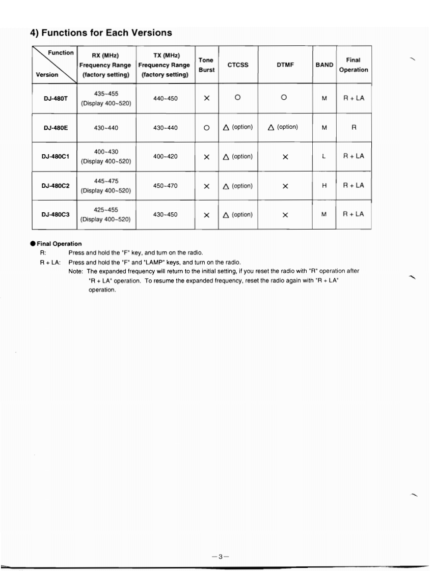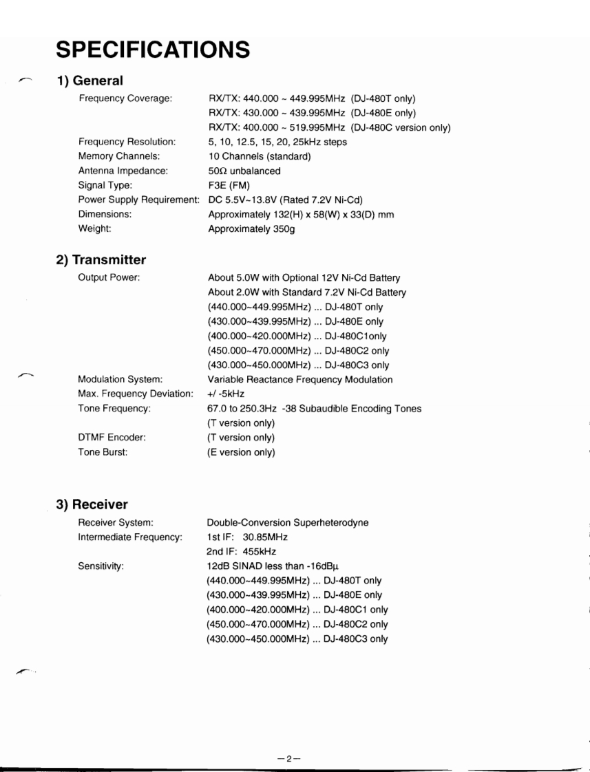 DJ-480C/T/EService ManualCONTENTS●PC BOARD VIEW●SPECIFICATIONS1)VCO Unit.251)General.…22)JACK Unit..252)Transmitter….23)PTT Unit Side B.253)Receiver....…24)PS Unit......264)Functions for Each Version..35)AOM1 Unit Side B6◆CIRCUIT DESCRIPTION6)ROM2 Unit Side B.361)Receiver System........7)ROM3 Unit Side B.262)PLL,VCO Circuit58)RF Unit Side A...273)Transmitter System.....59)RF Unit Side B..284)DTMF Encoder Circuit (option)..610)CPU Unit Side A..295)Tone Squelch Circuit (option)......611)cPU Unit Side B.306)Microprocessor and Peripheral Circuit......612)RE Unit......317)Terminal Function of Microprocessor.......7-913)CTCSS Unit.31●SEMICONDUCTOR DATA14)DTMF Unit...321)LR408721.15)16KEY Unit.332)M5218FP10●PARTS LIST3)M5236ML10CPU Unit......344)M67749...11.35-385)MB1504LPF11VCO Unit.....38-396)MX365.12DTMF Unit..397)NUM386..13CTCSS Unit.398)RH5VA32AA..13PTT SW Unit.409)RH5VA45AA..13JACK Unit..4010)TK10420MTA.14RE Unit.....4011)X24C01A..15PS Unit.4012)X24C04S14..15ROM1 Unit..4013)X24C16S14..15ROM2 Unit..4014)Transistor,Diode and LED Outline Drawings....16ROM3 Unit....015)LCD Connection.1716KEY Unit....40●EXPLODED VIEWOTHERS..411)Rear Case 1..18PACKING.2)LCD.18Version Table..423)Rear Case 2..19●ADJUSTMENT4)Front Case 1..201)Required Test Equipment......435)Front Case 2....212)Before Adjustment....436)Front Case 3 and Battery Terminal..223)Adjustment for DJ480..447)Ten Key Cover and Key Pad Panel234)Adjustment Quick Reference..458)CTCSS Unit and ROM Unit...245)Adjustment Points.45-46●CIRCUIT DIAGRAM...47、48●BLOCK DIAGRAM.49ALINCO ELECTRONICS INC.