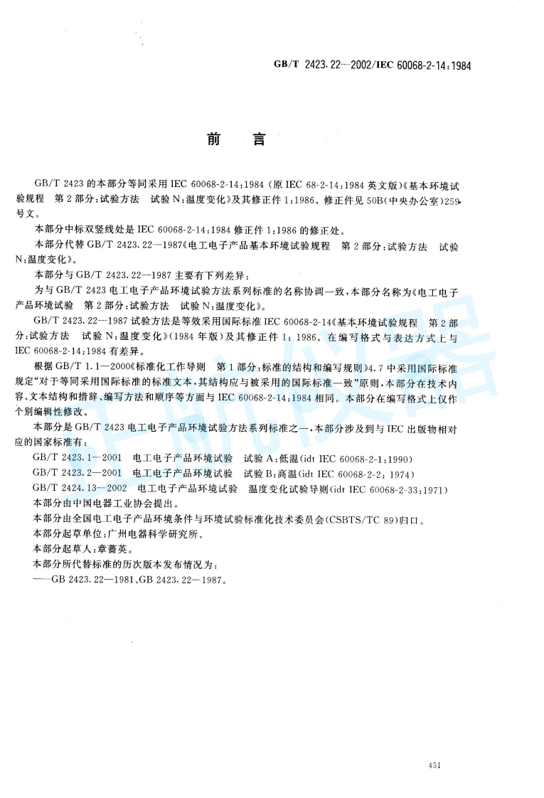 1Cs19.040K04中华人民共和国国家标准GB/T2423.22-2002/IEC60068-2-14:1984代替GB/T2423.22-…1987电工电子产品环境试验第2部分:试验方法试验N:温度变化Environmental testing for electric and electronic products-Part 2:Test methodsTest N:Change of temperature(IEC 60068-2-14:1984,Basic environmental testing procedures-Part 2:Tests-Test N:Change of temperature,IDT)2002-06-13发布2003-01-01实施中华人民共和国国家质量监督检验检疫总局发布450