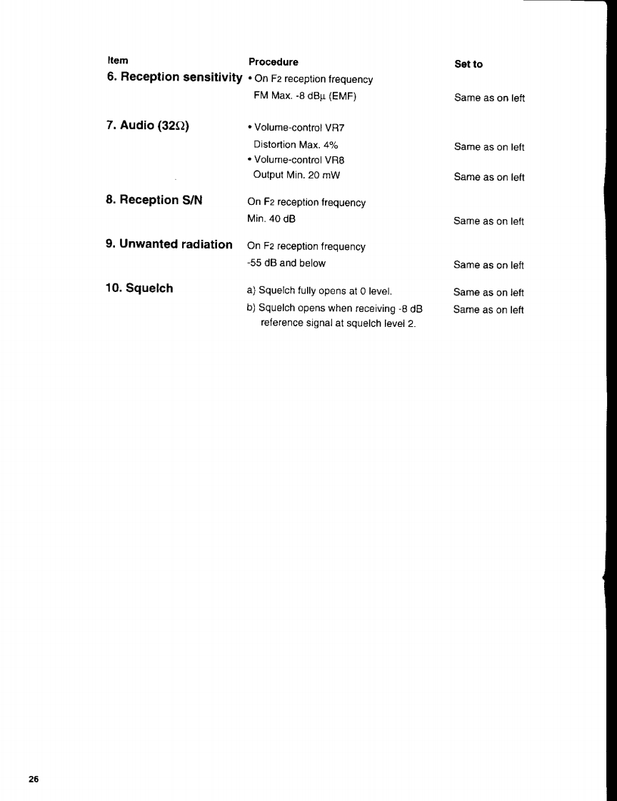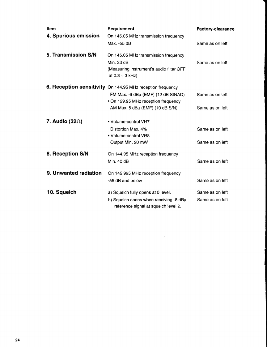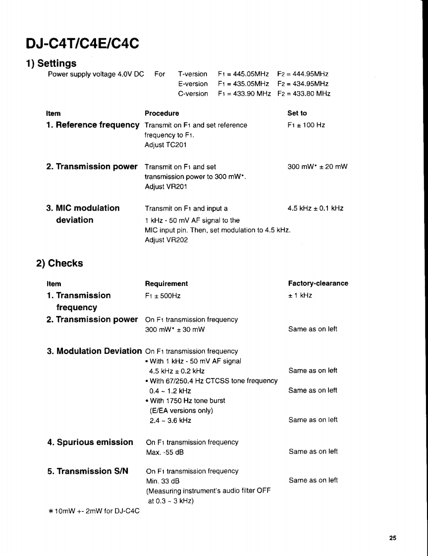 ADJUSTMENTDJ-C1T/C1E1)SettingsPower supply voltage 4.0V DCItemProcedureSet to1.Reference voltageTune in 144.95 MHz and set P/D voltage1.7±0.1Vto 1.7 V.(VCO case attached)Adjust L2142.ReferenceTransmit on 145.05 MHz and set reference 145.05 MHz +0.5 Hzfrequencyfrequency to 145.05 MHz.Adjust TC2023.Transmission powerTransmit on 145.05 MHz and set300mW±20mWtransmission power to 300 mW.Adjust VR2014.MIC modulationTransmit on 145.05 MHz and input a4.5±0.1kHzdeviation1 kHz-50 mV low-frequency signal tothe MIC input pin.Then,set modulation to4.5 kHz.Adjust VR2022)ChecksItemRequirementFactory-clearance1.Transmission145.05MHz±200Hz±500Hzfrequency2.TransmissionOn 145.05 MHz transmission frequencypower300mW±30mWSame as on left3.ModulationOn 145.05 MHz transmission frequencyDeviation.With 1 kHz -50 mV AF signal4.5kHz±0.2kHzSame as on leftWith 67/250.4 Hz tone frequency0.4-1.2kHzSame as on leftWith 1750 Hz tone burst(E/EA specification only)2.4-3.6kHzSame as on left23