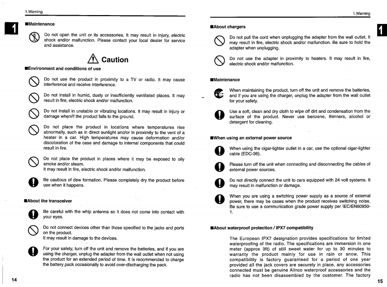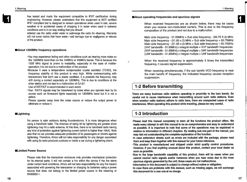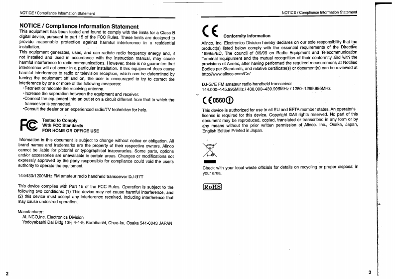 ALINCO144/430/1200MHz TRIPLE BAND FM TRANSCEIVERDJ-G7Instruction ManualALINCO,INC.Head Office:Yodoyabashi-Dai buiding 13th Floor4-9.4-Chome.Koraibashi,Chuo-lou,Osaka 541-0043,JAPANPhone+81-6-7636-2362Fax+81-B-620g-3902http://www.alnco.comE-maibexporfoalinco.co.lpA②Thank you for purchasing your new Alinco transcelver.Please read this manualarefully before using the product to ensure full performance.and keep thisnanual for future reference as it contains information on after-sales service.n case addendum or errata sheets are included with this product,please readhose materials and keep them together with this instruction manual for futureeference.Printed in JapanCopyright Alnoo,Ine.PS0597B/FNNM-ENALINCO,INC.