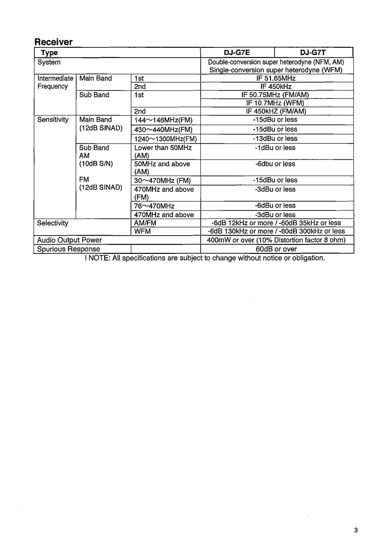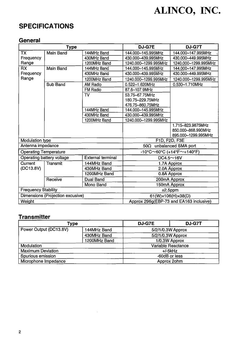 DJ-G7/T/EService ManualCONTENTSSPECIFICATIONSEXPLODED VIEWGeneral......21)Front View..........21,22Transmitter.…22)Rear View..........23,24Receiver….33)Bottom View.......25CIRCUIT DESCRIPTIONPARTS LIST1)Reception........4-7CPU Unit….26-292)Transmission....7MAIN Unit....30-373)CPU Peripheral.......7vco Unit......…384)CPU…8-11Mechanical Parts.....…39LED Unit.....39SEMICONDUCTOR DATAJACK Unit...…391)BU2152FS(XA0210)12RE1 Unit.......392)NJM2070M(XA1352).13RE2 Unit.....393)TA31136FN(XA0404).134)TK10931V(XA0666)..13ADJUSTMENT5)M62364FP(XA1293).14Adjustment Mode..40-466)TC3W53FU(XA0341).147)MB15F07SL(XA1033).15PC BOARD VIEW8)uPC2771TB(XA0953).15CPU Unit Side A….479)uPC2757TB(XA0976)..15CPU Unit Side B..4810)AT24C1024B(XA1351)..15MAIN Unit Side A ..4911)BU4830FVE(XA1009).16MAIN Unit Side B....512)S-812C32AMC(XA1353).16VCO Unit……5113)LM2681(XA1354).16JACK Unit.14)NJM2125F(XA0622)…17LED Unit.....…525215)TC75S51FU(XA1014).17RE Unit.....5316)LM12904PWR(XA1155).…1717)NJM2746RB1(XA1356)..17SCHEMATIC DIAGRAM.............5.4-5618)BA2902FV(XA1371)…1819)MM1332EF(XA1139)..18BLOCK DIAGRAM....5720)Transistor,Diode and LED Outline Drawings.....1921)LCD Connection (EL0063).........................20ALINGO.INC.