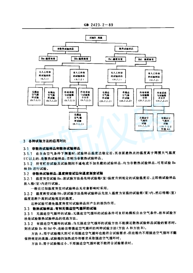 中华人民共和国国家标准电工电子产品基本环境试验规程GB2423.2一89试验B:高温试验方法代替GB2423.2一81Basic environmental testing proceduresfor electric and electronic productsTests B:Dry heat本标准等效采用国际标准1EC68一2一2《基本环境试验规程试验B:干热》(1974年版)及其第一次补充文件IEC68一2-一2A(1978).1主题内客与适用范圆本标准规定了电工电子产品基本环境试验规程:高福试验方法。本标准适用于非散热的和散热的电工、电子产品(包括元件、设备及其他产品)的高温试验。本标准仅限于用来考核和确定电工、电子产品在高温环境条件下贮存和(或)使用的适应性。本标准不能用来评价试验样品在温度变化期间的耐抗性和工作能力,这时应采用GB2423.22《电工电子产品基本环境试验规程试验N:温度变化试验方法》。本试验方法通常用于在条件试验期问能达到温度稳定的试验样品。试验时是将具有室温的试验样品投入试验,当实际上试验样品是和某种特定的安装架一起使用时,则应使用这些安装架一起进行试验。试验持续时间是从试验样品达到温度稳定时开始计算。在特殊情况下,当试验样品在进行条件试验期间达不到温度稳定时,试验持续时间从试验箱(室)达到规定的试验温度时开始计算。2高温试验方法分类及方摆围2.1高温试验方法a.非散热试验样品的高温试险:试验Ba一温度突变:试验Bb-一温度渐变。b.散热试验样品的高温试验:试验B一温度突变,试验Bd一温度渐变。2.2高温试验方法分类的方框图中华人民共和国机械电子工业部1989-01-25批准1990-01-01实施