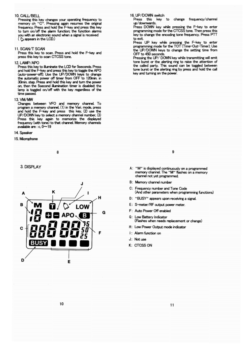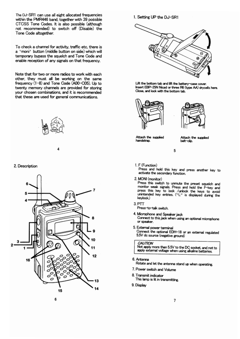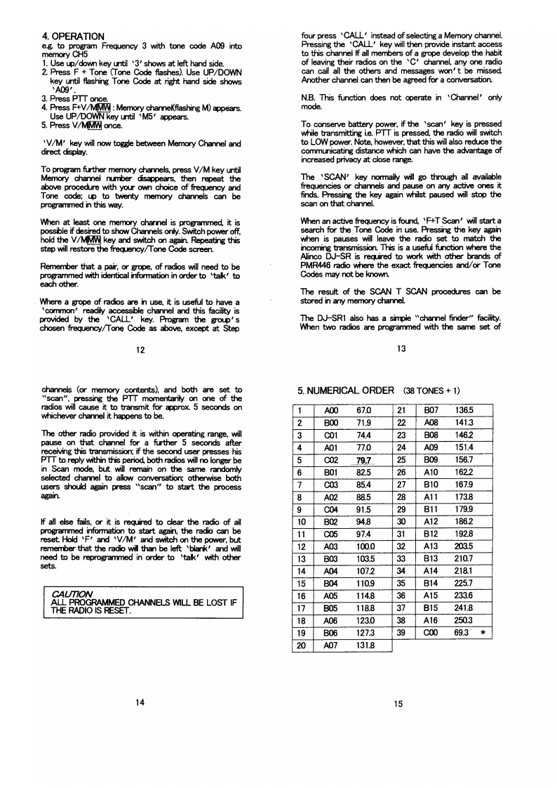 QUICK REFERENCEALINCOCondition Pressed aionePressed whiePress and hoid andKeyF is pressedtun the power onreset (with V/M)MONIunmutes squeichkeylock/unlockbeep on/offPTTtransmitDJ-SR1V/MVARLMemoryMemory Write43e0freq/memo.up(scans if pressed aUPwhile)T.O.T.(lf pressed with PTT.emits alert tone.)Freq/memo.down(scans if pressed aDOWNtone freg changetodes stand-by(f pressed with PTTbeep On/OfFamits slert tone)CALLcal channealarm on/offalert/Tone Burstscan startSCANwith PTT.togdestone scan startpower Hi/LoaLAMPlamp on/offAuto Power Offchange lamp modeooALINCO.INC.Head Office:"TWIN 21"MID Tower Buiding 25F1-61.2-Chome,Shiromi,Chuo-ku,Osaka 540-8580,JapanPhon06-6946-8150Fac:06-6946-8175E-mail:exportoalinco.co.jpPS0309BALINCO,INC.NOTICESSAFETYIt is material that the user is aware of and under-stands hazards common to the operation of radio.LEGAL WARNING●Govemment law disallows the operation ofunlicensed radio transmitters within the districtsunder govemment controlllegal operation is punishable by fine or imprisonmentor both.CAUTIONSPlease observe the following cautions prevent fire.personal injury,and radio damage:Refer service to a qualified licensed or certifiedtechnician only.Tum off and do not operate your radio while taking onfuel,or while parked in gasoline service stations●Do not modify this radio for any reason●Do not expose the radio to long periods of directsunlight.nor please the radio close to heatingappliances.●Do not place the radio in excessively dusty areas.humid areas,and wet areas.If an abnormal order or smoke is found coming fromthe radio.switch off the power immediately andremove the batteries from the radio.Contact your ALINCO dealer.3