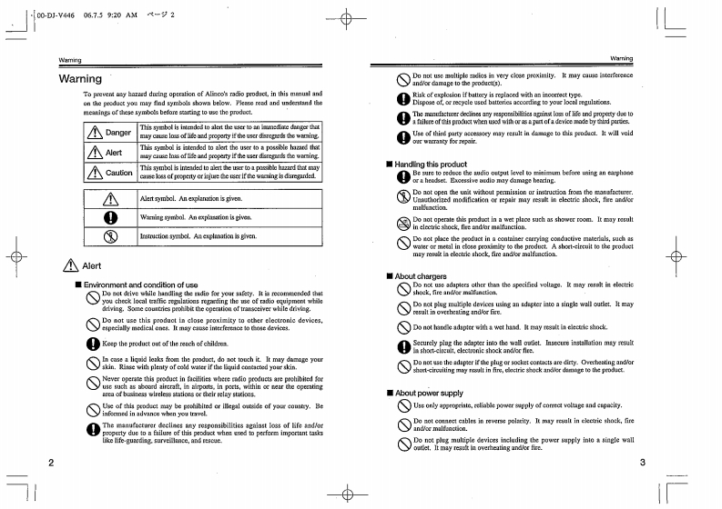 ..V46635920AM-91⊕ALINGOPRIVATE MOBILE RADIODJ-V446Instruction Manual08的Thank you for purchesing your now Alnco trnscover.This instruction manual contains importan saotyand cperatng instructions.Please read this manualOMAIEADcarefully before using the product and keop it fortuture relerence.ALINCO,INC.51F