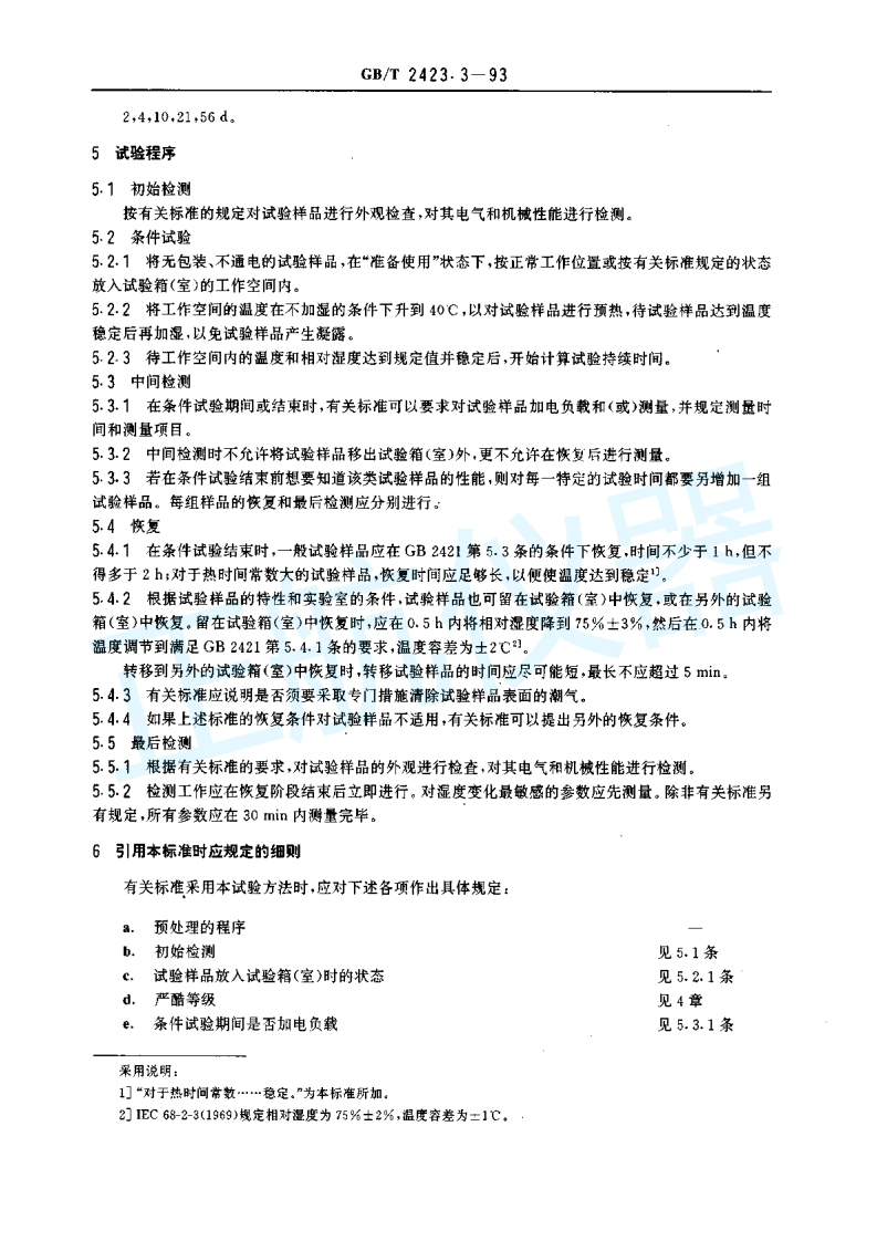 中华人民共和国国家标准电工电子产品基本环境试验规程试验Ca:恒定湿热试验方法GB/T2423.3-93Basic environmental testing procedures for代替GB2423.3一81electric and electronic productsTest Ca:Damp heat,steady state本标准等效采用1EC68-2-3《基本环境试验规程试验Ca:恒定湿热》(1969年第三版)及1984年第一号修正件。1主题内容与适用范围本标准规定了恒定湿热试验的试验程序,严酷等级和对试验箱(室)的基本要求等。本标准适用于确定电工电子产品、元件,材料等在恒定湿热条件下使用和贮存的适应性。2引用标准GB2421电工电子产品基本环境试验规程总则GB2422电工电子产品基本环境试验规程名词术语GB2424.2电工电子产品基本环境试验规程湿热试险导则3对试验箱(室)的要求3.1工作空间内应装有监控温、湿度条件的传感器。3.2工作空间内的温度应能保持在40士2℃,相对湿度应能保持在93%±号%的范里内。本标准中规定的温度容差(士2℃),考虑了测量的绝对误差、温度的缓慢变化和工作空间内温度的均匀性,即工作空间内的温差。为使本标准规定的相对湿度容差(%)保持在要求的范围内,工作空间内任何两点的温差,在任一瞬时都不应大于1℃,短期的温度波动也必须保持在较小的范围内。3.3凝结水应不断排出工作室外,未经纯化处理不得再次使用。3.4使用直接与水接触产生湿度的加湿法时,在试验中水的电阻率应保持不小于500n·m。3.5工作空间内的温度和湿度应均匀,并尽可能与温湿度传感器处的条件一致。36试验样品的特性及电气负载不应明显地影响工作空间内的温、湿度条件。3.?试验箱(室)内壁和顶部的凝结水不应滴落到试验样品上。4严酷等级在本标准中,试验严酷等级由于试验持续时间决定,有关标准应从下列持续时间中选取严酷等级:采用说明:1]1EC68-2-3(1969)无2d.国家技术监警局1993-11-19批准1994-07-01实施