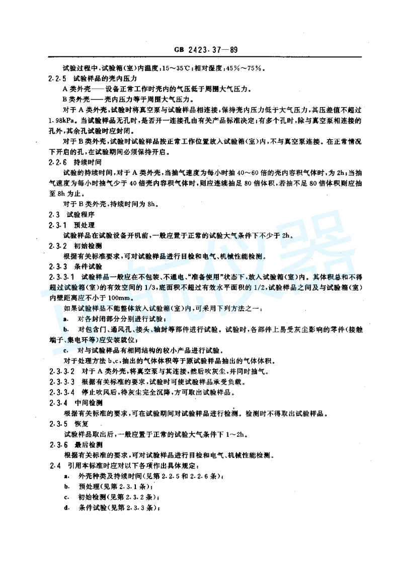 中华人民共和国国家标准电工电子产品基本环境试验规程GB2423.37一89试验L:砂尘试验方法Basic environmental testing proceduresfor electric and electromic productsTest L:Dust and Sand1‘主惠内容与适用范园本标准规定了电工电子产品基本环境试验规程试验L:砂尘试验方法。本标准提供了三种砂尘试验方法,适用于在砂尘环境中使用的电工电子产品。砂尘对产品的主要影响如下:a。侵入巒封件和外壳:b.改变电气性能(如接触电阻和表面泄漏电流改变等):c.阻滞和磨损轴承等运动部件;d.磨蚀表面,污染润滑剂:e,阻塞通风口、管路、过滤器、操作孔等;【,积尘可以成为水汽凝聚的核心,促进腐烛和霉菌生长。器2方法La:外亮防尘用于检测产品的外壳密封性能的试验方法,主要用于GB4208一84《外亮防护等级的分类》中规定的P5X和P6X两个等级的产品。2.1对试验箱(室)的要求a。试验时应能提供非层流状的载灰尘的垂直循环气流:b.试验时应具有循环使用灰尘的功能:c,试验时应具有良好的唐封性:d.试验时应能视察灰尘的循环状况:e.内壁应平滑、防静电:【.应配备真空泵,并满足本标准2.2.5条的要求。2.2试验条件22.1试验用尘能通过筛孔为75μm、金属丝直径为50μm的方孔筛的干燥滑石粉。2.2.2灰尘浓度试验箱(室)内(工作室和管通道)灰尘量为2kg/m3.2.2.3气流速度应能保证试验用灰尘均匀缓慢沉降在试验样品上,但最大值不得超过2m/s。2.2.4温度和相对湿度中华人民共和国机城电子工业部1989-02-28批准1990-01-01实撞