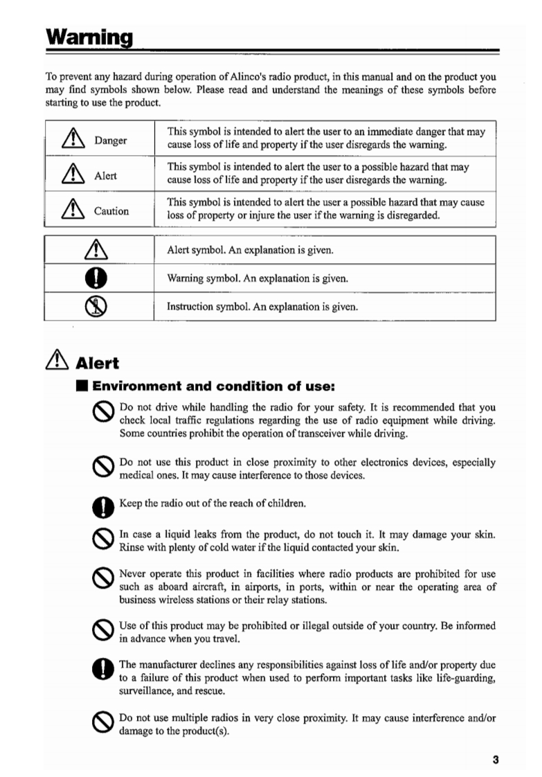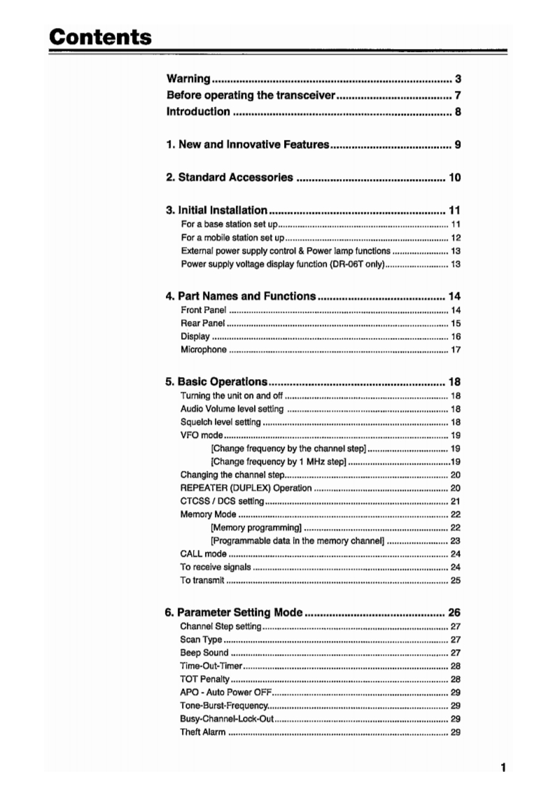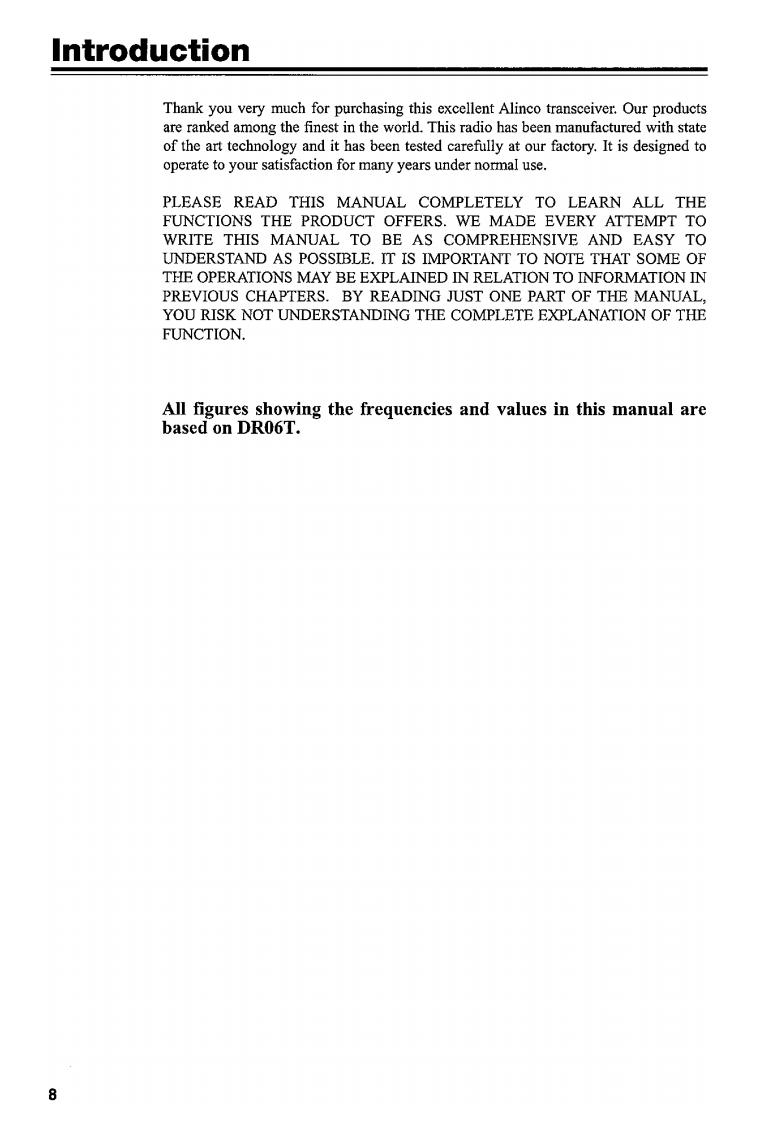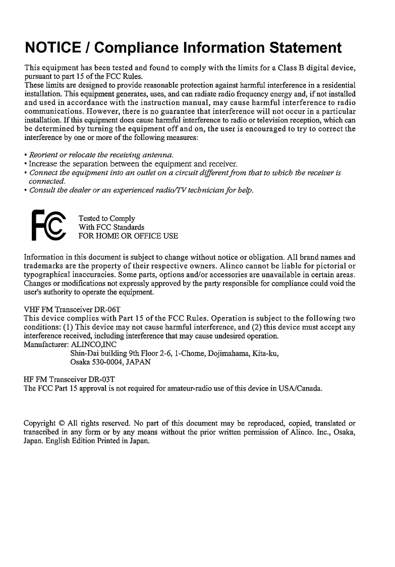 ALINGOVHF FM Mobile TransceiverDR-06TDR-MO6RDR-135LHHF FM Mobile TransceiverDR-03TDR-M03RInstruction Manual©Thank you for purchasing your new Alinco transceiver.This instruction manual contains important safety and operating instructions.Please readthis manual carefully before using the product and keep it for future reference.All figures showing the frequencies and values in this manual are based on DRO6T.ALINGO