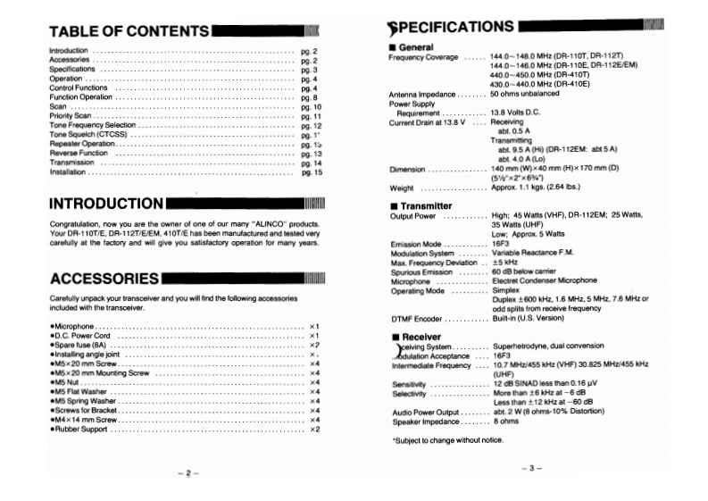 ALINCO11I1110VHF/UHF FM TRANSCEIVERSDR-11OT/E,112T/E/EM,41▣T/EINSTRUCTION MANUALALINCDO ELECTRONICS INC.20705S.Westem Ave.Suite 104.Torrance Ca.90501.U.S.A.Ph0n8213)518-66161-1-1 Mishimae,Takatsuki city,Osaka 569.Japany509.2DR-110T10ALINCO ELECTRONICS INC.PS0127F0788G10195000@