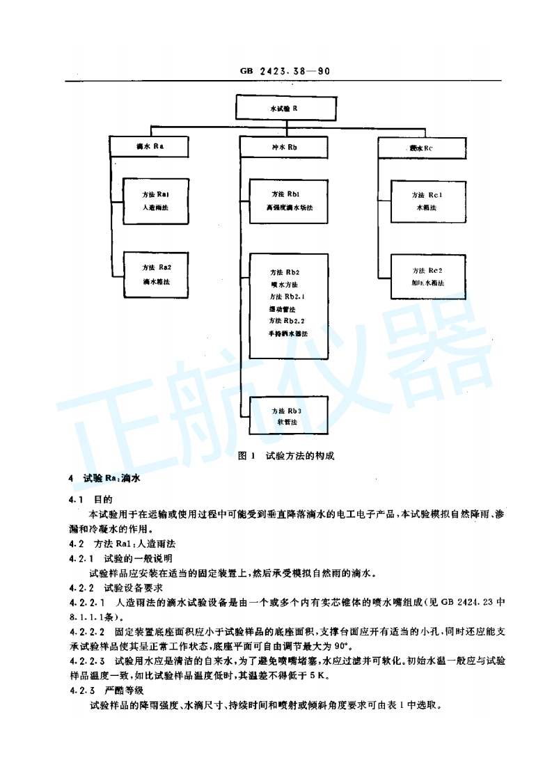 中华人民共和国国家标准电工电子产品基本环境试验规程GB2423.38-90试验R:水试验方法Basic environmental test procedures for electric and electronic productsTest R:Water test method1主题内容与适用范围本标准规定了滴水、冲水和浸水试验方法。试验的主要目的是考核电工电子产品外壳和密封件在水试验后或在试验期间能否保证设备和元件良好的工作性能。本标准包括以自然条件为基础的人工淋雨试验,但不包括有强风速的降雨,本标准不考虑试验样品的温度与雨水温度的温度差作用(例如由压力变化和热冲击)所引起的大量进水。本标准适用于电工电子产品(包括元件)在运输或使用期间可能受到滴水、冲水和浸水影响,并可作为产品技术标准的引用依据。2引用标准GB2424.23电工电子产品基本环境试验规程水试验导则GB5170.38电工电子产品环境试验设备基本参数检定方法水试验设备石试验方法的构成(见图1)水试验有三类:试验Ra:滴水一用人工模拟降雨方法进行的试验。试验:冲水一高强度滴水场或喷射水流以一定的力冲击被试样品,滴水场可以任何角度冲向被试样品。试验R©:浸水一试验样品浸入到规定深度或相当压力的水中。国家技术监督局1990-07-16批准1991-03-01实施