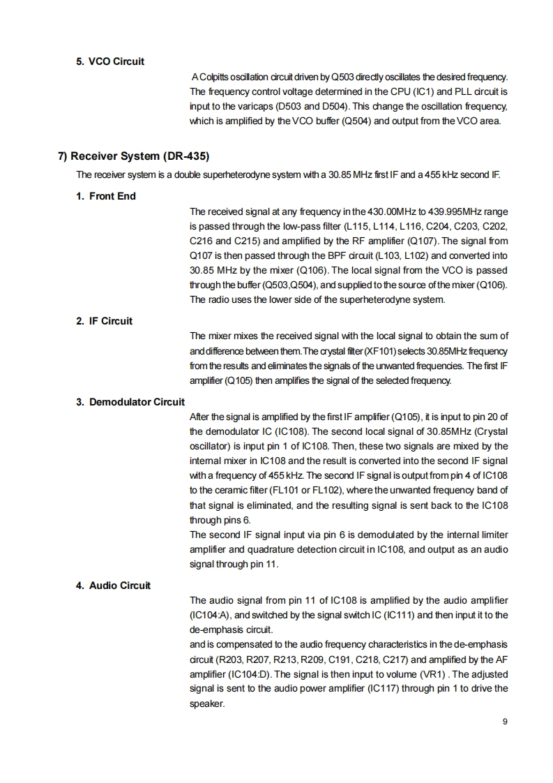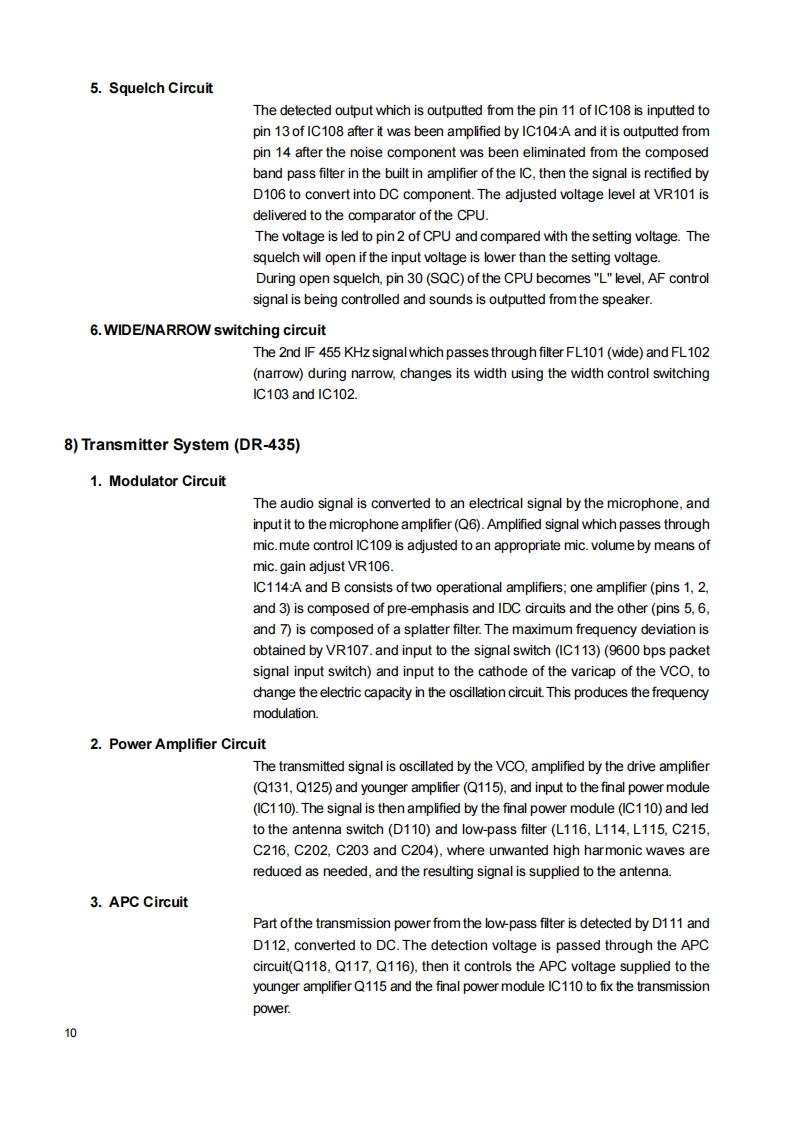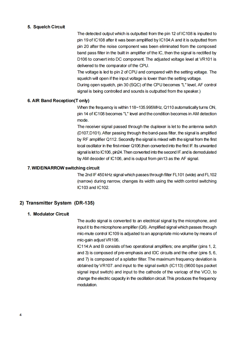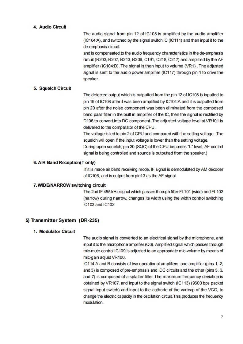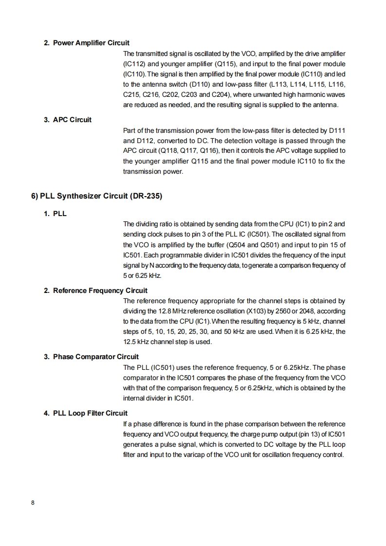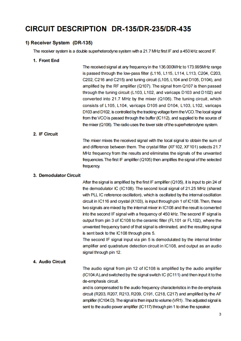 DR-135/DR235/DR435Service ManualCONTENTSSPECIFICATIONSGENERAL.2Mechanical PartsTRANSMITTERPacking Parts..阳RECEIVER.ACCESSORIESCIRCUIT DESCRIPTION DR-135ACCESSORIES(SCREW SET)1)Receiver System (DR-135)4TNC(EJ41U)2)Transmiter System(DR-135)4,5TNC (EJ41U)Packing Parts.A53)PLL Synthesizer Crcuit (DR-135)5.6DR-135 ADJUSTMENT4)Receiver System(DR-235)......6,71)Adjustment Spot65)Transmitter System (DR-235)7,82)VCo and RX Adjustment Specification.476)PLL Synthesizer Circuit (DR-235)8.93)TxAdjustment Specification....477)Receiver System (DR-435)9.104)Rx Test Specification.....为8)Transmitter System(DR-435).....,105)Tx Test Specification499)PLL Synthesizer Circuit (DR-435)........11DR-235 ADJUSTMENT10)CPU and Peripheral Circuits(DR-135 DR-235 DR-435)..........11,121)Adjustment Spot11)Power Supply Circuit.......132)VCO and RX Adjustment Specification5112)M3826M8269GPC仪A081814-163)TxAdjustment Specification51SEMICONDUCTOR DATA4)Rx Test Specification521)M5218FP仪A0068-175)Tx Test Specification532)NJM7808FA (XA0102)17DR-435 ADJUSTMENT3)TC4S66F仪A0115.171)Adjustment Spot..4)TK10930 VTL (XA0223182)VCO and RX Adjustment Specification号5月BU4052BFXA0236193)TxAdjustment Specification.6)TC4W53FU (XA0348)194)Rx Test Specification.87M64076GPKA0352205)Tx Test Specification8)LA4425ACKA0410)21PC BOARDVIEW9M67746A0412)211)CPU Unit Side A.5810M68729A0591)222)CPU Unit Side B...5811)M57788CKA0077A)233)Main Unit Side A DR-135 (UP0400B)5912)mPC2710TGA0449244)Main Unit Side B DR-135(UP0400B)5913)NJM2902XA0596245)Main Unit Side A DR-235 (UP 0414)号14)24LC32A0XA0804256)Main Unit Side B DR-235 (UP 0414)6015)S-80845ALMP-EA9-T2 (XAD620)257)Main Unit Side A DR-435 (UP 0415)6116)L8BMSO5TLL (XA0675)258)Main Unit Side B DR-435 (UP 0415)611刀AN8010MCA0119)269)Tnc Unit Side A (UP 0402)(DR-135TP onty)的18周TK10489MCA0314..2610)Tnc Unit Side B(UP 0402)(DR-135TP onty)6219)Transistor,Diode,and LED Ontline Drawings.....2SCHEMATIC DIAGRAM20)LCD Connection (TTR3626UPFDHN).......281)CPU UnitDR-135 /DR-235/DR-43563EXPLODED VIEW2)Main Unit DR-135641)Top and Front View293)Main Unit DR-235652)Bottom View304)Main Unit DR-4353)LCD Assembly.5)TNC Unit(DR-135TP only)67PARTS LISTBLOCK DIAGRAMCPU32,331)DR-135.Main Unit(DR-135)33-362DR-2356gMain Unit(DR-235)36-393)DR-435.70VCO Unit(DR-235)39Main Unit(DR-435)42VCO Unit(DR-435)42ALINCO,INC.