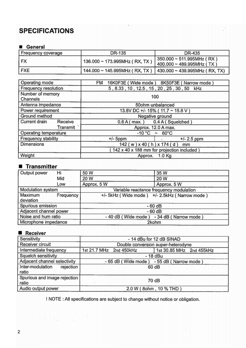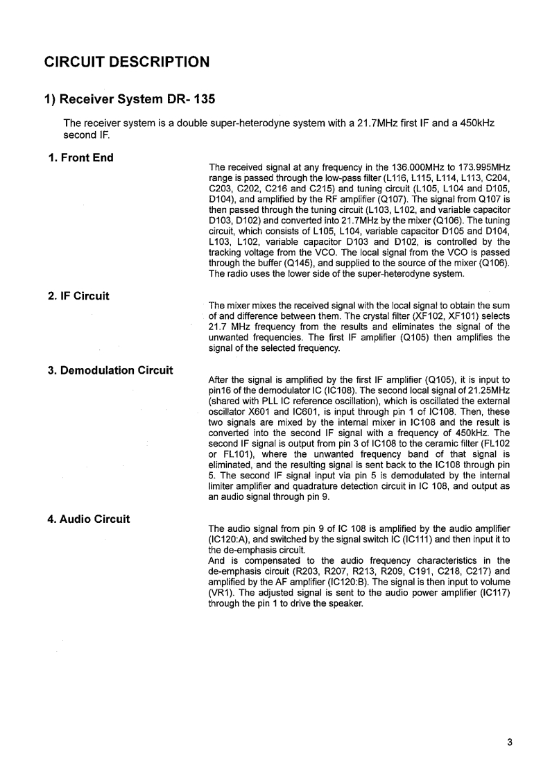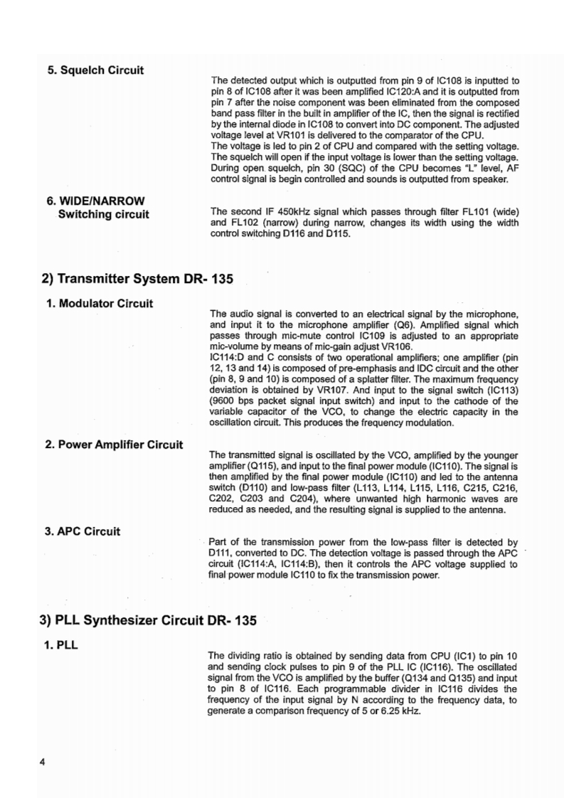 DR-135/435FXService ManualCONTENTSSPECIFICATIONSPARTS LISTGENERAL…CPU Unit,…24TRANSMITTER..........MAIN Unit DR-135.24-27RECEIVER.....2MAIN Unit DR-43527-30Mechanical Parts..…3CIRCUIT DISCRIPTIONPacking Parts...…311Receiver System DR-135.........................3,4ACCESSORIESTransmitter System DR-135.ACCESSORIES(SCREW SET)...........33jPLL Synthesizer Circuit DR-135................4.54)Receiver System DR-435...5,6DR-135 ADJUSTMENT5)Transmitter System DR-435....................,71)Adjustment Spot.............32PLL Synthesizer Circuit DR-435.2VCO and RX Adjustment Specification..7)CPU and Peripheral Circuit..……3)TX Adjustment Specification............8)Power Supply Circuit....84)RX Test Specification.9)M38268MCA075GP(XA1130).......9-115)TX Test Specification........3333455SEMICONDUCTOR DATADR-435 ADJUSTMENT1)NJM7808FA(XA0102)...121))Adjustment Spot...…2)TC4S66F(XA0115).…VCO and RX Adjustment Specification..93AN8010M(XA0119).123)TX Adjustment Specification.….…384TC4W53FU(XA0348)..4)RX Test Specification..........5)TA31136FN(XA0404)…135)TX Test Specification....................6)LA4425AXA0410)...7BR24L32FJ(XA0604Z).14PC BOARD VIEW8)S-80845ALMP(XA0620)..14CPU Unit Side A DR-135(UP0538A)....9)1)41S-816A50AMC(XA0925)】142CPU Unit Side B DR-135(UP0538A)....10)NJM78M05DL1A(XA0947).14行3CPU Unit Side A DR-435(UP0545)......411)LM2904 PWR (XA1103)15CPU Unit Side B DR-435(UP0545)......12)LM2902 PWR (XA1106)1MAIN Unit Side A DR-135(UP0538A)...4313)MB15E07SR(XA1107刃).......161MAIN Unit Side B DR-135(UP0538A).14)RA60H1317M1XA1108)177MAIN Unit Side A DR-435(UP0545).....415)S-AU82LXA1142).188MAIN Unit Side B DR-435(UP0545)....416)Transistor,Diode and LED Outline Drawing...17)LCD Connection (TTR3626UPFDHN)20SCHEMATIC DIAGRAM1CPU Unit DR-135.EXPLODED VIEW5CPU Unit DR-435.1)Top and Front View..…。Bottom View.6122233MAIN Unit DR-135.7MAIN Unit DR-435.43LCD Assembly,..…BLOCK DIAGRAM1)DR-135.42DR-435.ALINGO.INC