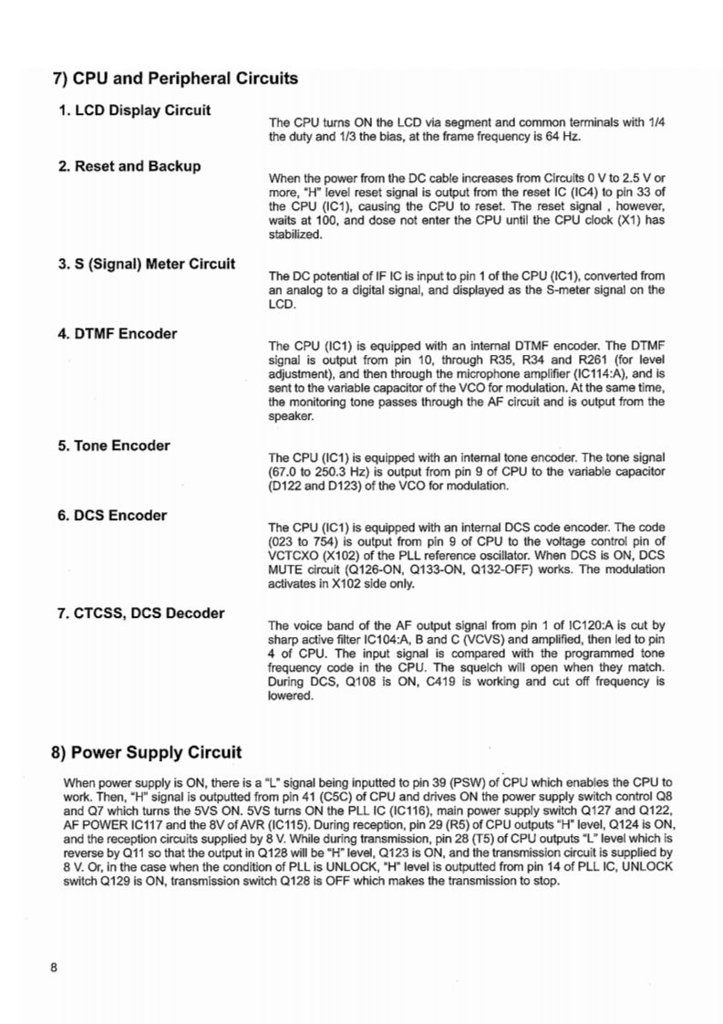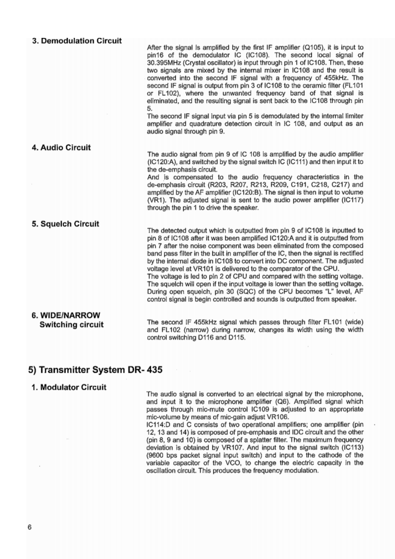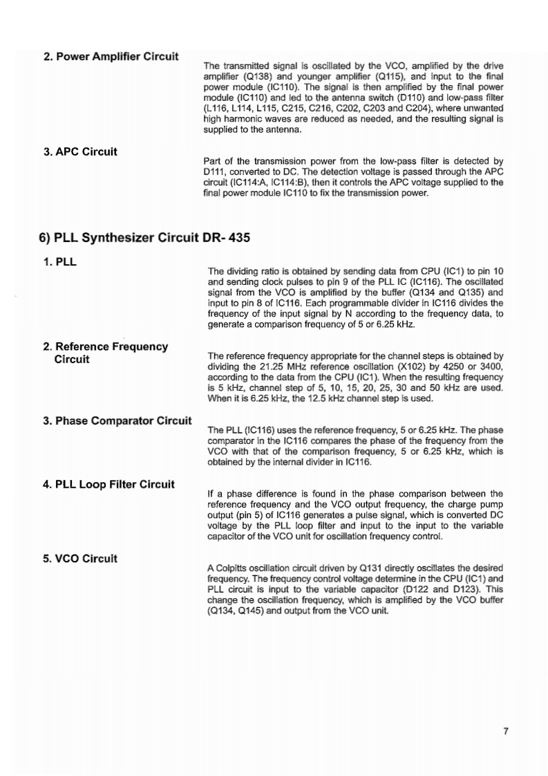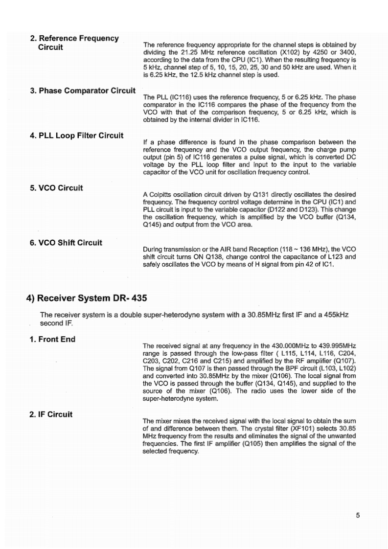 DR-135/435FXService ManualCONTENTSSPECIFICATIONSPARTS LISTGENERAL…CPU Unit,…24TRANSMITTER..........MAIN Unit DR-135.24-27RECEIVER.....2MAIN Unit DR-43527-30Mechanical Parts..…3CIRCUIT DISCRIPTIONPacking Parts...…311Receiver System DR-135.........................3,4ACCESSORIESTransmitter System DR-135.ACCESSORIES(SCREW SET)...........33jPLL Synthesizer Circuit DR-135................4.54)Receiver System DR-435...5,6DR-135 ADJUSTMENT5)Transmitter System DR-435....................,71)Adjustment Spot.............32PLL Synthesizer Circuit DR-435.2VCO and RX Adjustment Specification..7)CPU and Peripheral Circuit..……3)TX Adjustment Specification............8)Power Supply Circuit....84)RX Test Specification.9)M38268MCA075GP(XA1130).......9-115)TX Test Specification........3333455SEMICONDUCTOR DATADR-435 ADJUSTMENT1)NJM7808FA(XA0102)...121))Adjustment Spot...…2)TC4S66F(XA0115).…VCO and RX Adjustment Specification..93AN8010M(XA0119).123)TX Adjustment Specification.….…384TC4W53FU(XA0348)..4)RX Test Specification..........5)TA31136FN(XA0404)…135)TX Test Specification....................6)LA4425AXA0410)...7BR24L32FJ(XA0604Z).14PC BOARD VIEW8)S-80845ALMP(XA0620)..14CPU Unit Side A DR-135(UP0538A)....9)1)41S-816A50AMC(XA0925)】142CPU Unit Side B DR-135(UP0538A)....10)NJM78M05DL1A(XA0947).14行3CPU Unit Side A DR-435(UP0545)......411)LM2904 PWR (XA1103)15CPU Unit Side B DR-435(UP0545)......12)LM2902 PWR (XA1106)1MAIN Unit Side A DR-135(UP0538A)...4313)MB15E07SR(XA1107刃).......161MAIN Unit Side B DR-135(UP0538A).14)RA60H1317M1XA1108)177MAIN Unit Side A DR-435(UP0545).....415)S-AU82LXA1142).188MAIN Unit Side B DR-435(UP0545)....416)Transistor,Diode and LED Outline Drawing...17)LCD Connection (TTR3626UPFDHN)20SCHEMATIC DIAGRAM1CPU Unit DR-135.EXPLODED VIEW5CPU Unit DR-435.1)Top and Front View..…。Bottom View.6122233MAIN Unit DR-135.7MAIN Unit DR-435.43LCD Assembly,..…BLOCK DIAGRAM1)DR-135.42DR-435.ALINGO.INC