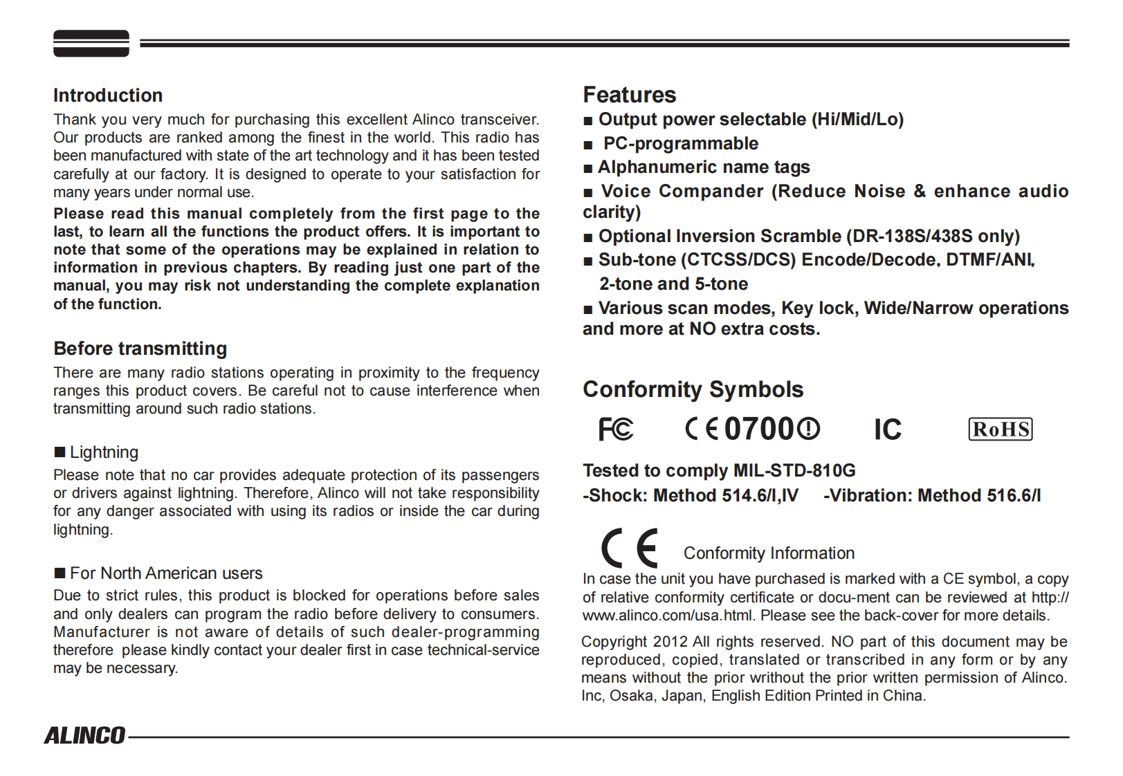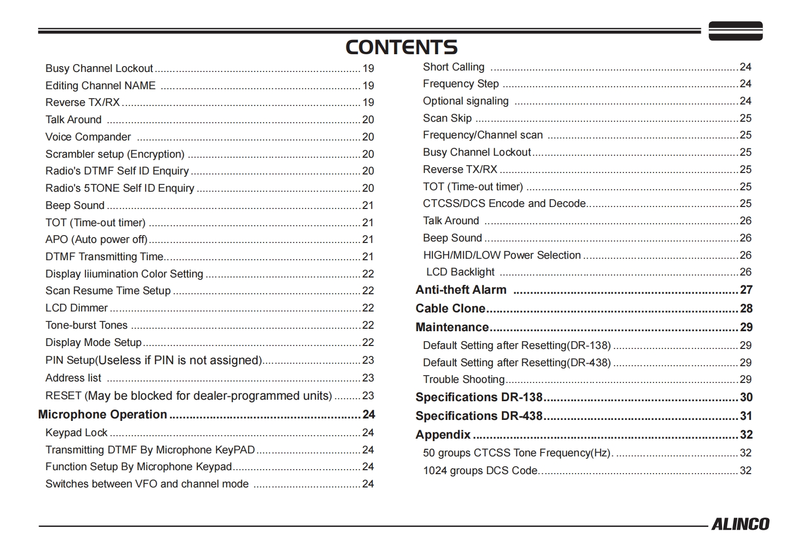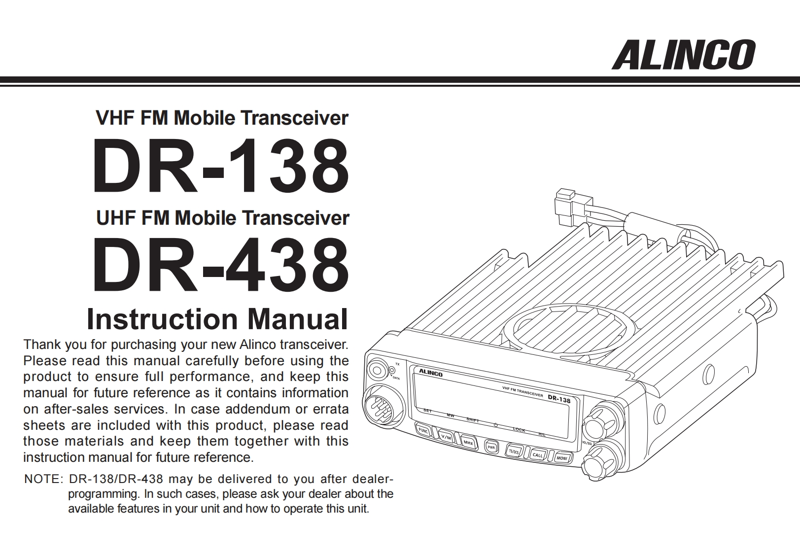 ALINCO,INC.Yodoyabashi Dai-bldg 13F4-4-9 Koraibashi,Chuo-ku,Osaka 541-0043 JapanPh0ne:+81-6-7636-2362Fax:+81-6-6208-3802http://www.alinco.comE-mail:export@alinco.co.jpFC(∈0700④DR-138:VHF FM Transceiver 136.000-173.995MHzDR-438:UHF FM Transceiver 400.000-469.995MHzAll EU and EFTA member states.IcRoHSOperator license is required.宫Copyright Alinco,Inc.PS0665B/FNEG-NLPrinted in China