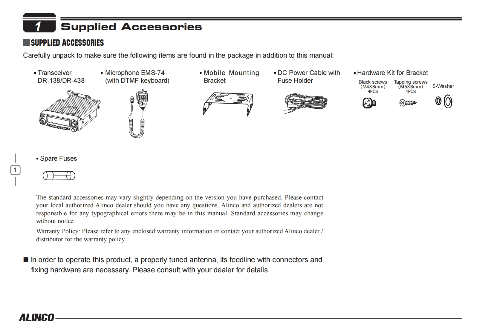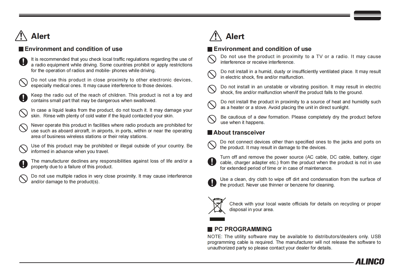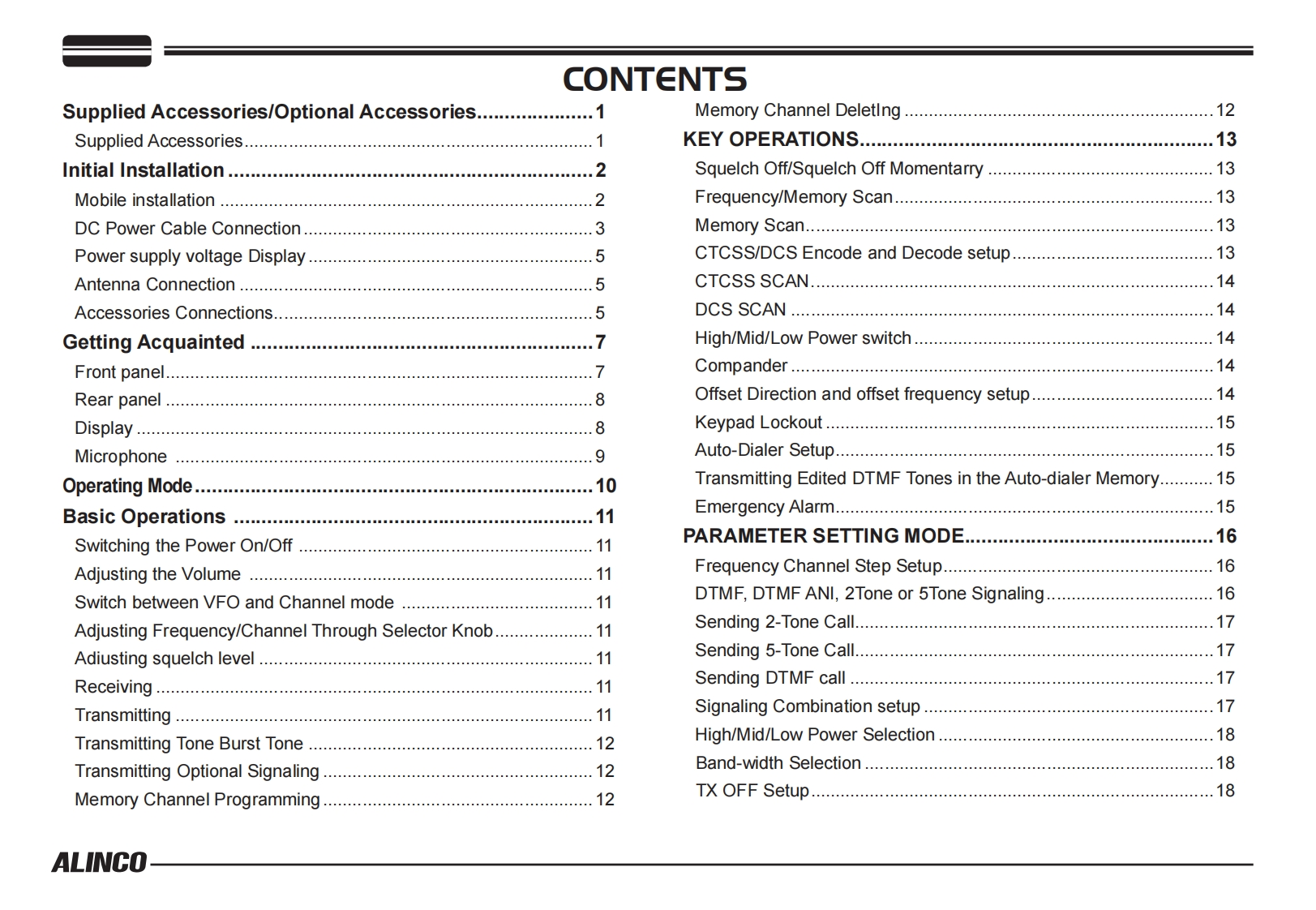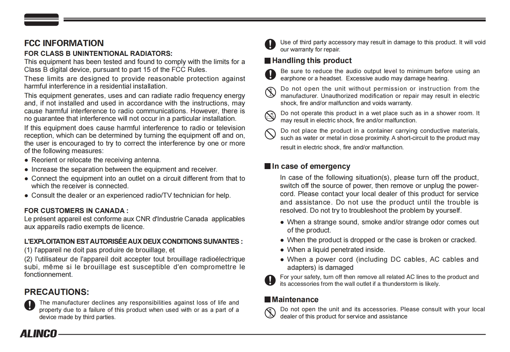 ALINCO,INC.Yodoyabashi Dai-bldg 13F4-4-9 Koraibashi,Chuo-ku,Osaka 541-0043 JapanPh0ne:+81-6-7636-2362Fax:+81-6-6208-3802http://www.alinco.comE-mail:export@alinco.co.jpFC(∈0700④DR-138:VHF FM Transceiver 136.000-173.995MHzDR-438:UHF FM Transceiver 400.000-469.995MHzAll EU and EFTA member states.IcRoHSOperator license is required.宫Copyright Alinco,Inc.PS0665B/FNEG-NLPrinted in China