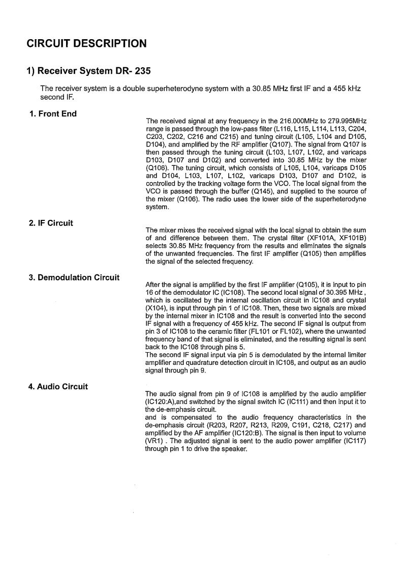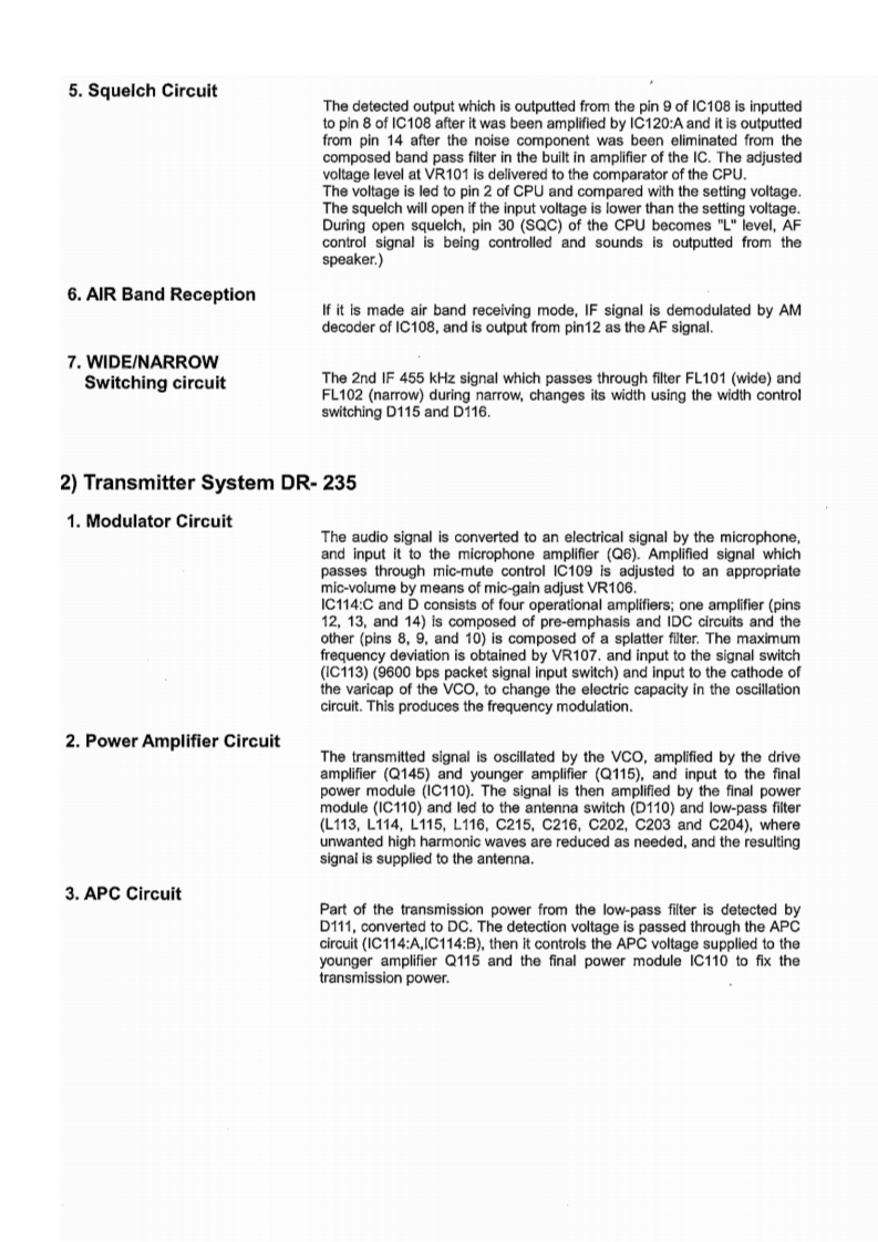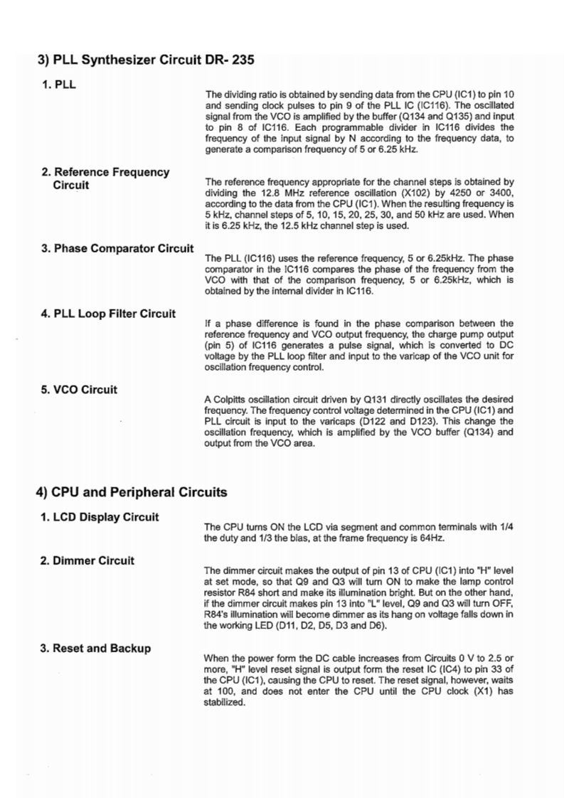 DR-235TMkIIIService ManualCONTENTSSPECIFICATIONSPARTS LISTGENERAL.......2CPU Unit...21.22TRANSMITTER......RECEIVER........22MAIN Unit.....22-25Mechanical Parts..........................25Packing Parts...2CIRCUIT DISCRIPTIONACCESSORIES251)Receiver System DR-235.3,4ACCESSORIES(SCREW SET)...........22Transmitter System DR-235.......................4TNC(EJ41U)63)PLL Synthesizer Circuit DR-235................TNC (EJ41U)Packing Parts.27CPU and Peripheral Circuit.5Power Supply Circuit.........6DR-235 ADJUSTMENT6M38268MCA075GP(XA1130).7-91)Adjustment Spot........282)VCO and RX Adjustment Specification..29SEMICONDUCTOR DATA3)TX Adjustment Specification..............01)NJM7808FA(XA0102).04)RX Test Specification......TC4S66F(XA0115)15)TX Test Specification.......323)AN8010M(XA0119)14)TC4W53FU(XA0348).......PC BOARD VIEWTA31136FN(XA0404).11CPU Unit Side A DR-235(UP0579)......336)LA4425A(XA0410).112)CPU Unit Side B DR-235(UP0579).337)BR24L32FJ (XA0604Z).13MAIN Unit Side A DR-235(UP0579).....4L88MS05TLL(XA0675).…124)MAIN Unit Side B DR-235(UP0579)....9)S-816A50 AMC (XA0925)15)TNC Unit Side A(UP0402)(option)......610)LM2904PWR(XA1103)..26)TNC Unit Side B(UP0402)(option).....3511)LM2902PWR(XA1106)112)MB15E07SR(XA1107)SCHEMATIC DIAGRAM13)S-80845 CLNB (XA1120)14CPU Unit DR-235.3614)BU4052BCFV(XA1229)0005004400000*400014MAIN Unit DR-235.15)S-AV40(XA1230)...今TNC Unit(option)…貂16)Transistor,Diode and LED Outline Drawing...1617)LCD Connection (TTR3626UPFDHN)..........17BLOCK DIAGRAM1)DR-23539EXPLODED VIEW1)LCD Assembly..182Top and Front View13)Bottom View.…20ALINCO,INC.