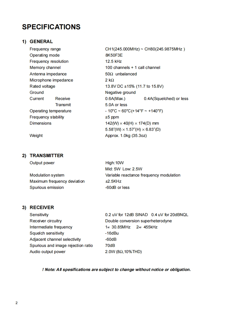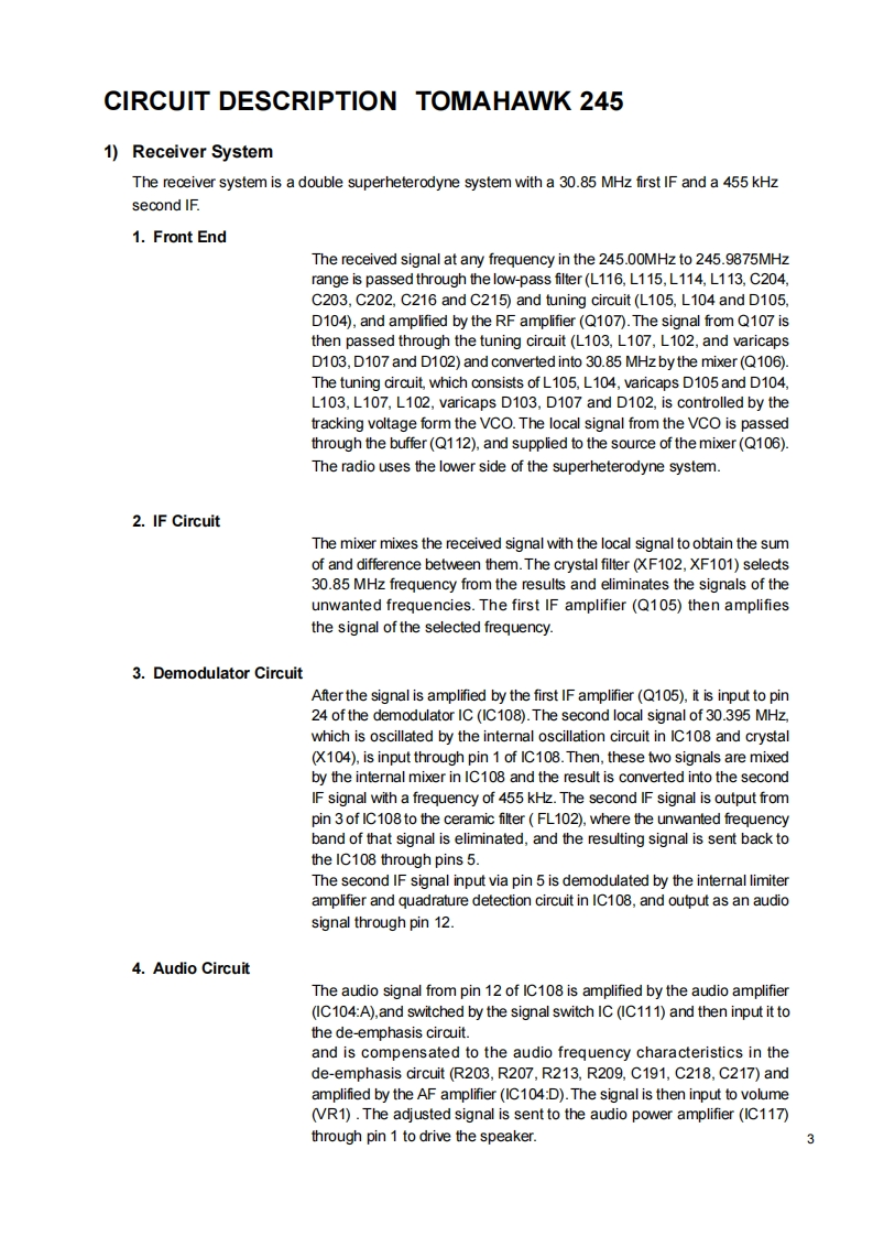 TOMAHAWK 245Service Manual DR-245ACONTENTSSPECIFICATIONSPARTS LIST1)GENERAL322.232)TRANSMITTER2Main Unit.…23-263)RECEIVER......Vco Unit......26CIRCUIT DESCRIPTION DR-135Mechanical Parts.261)Receiver System ..........3,4Speakef2.T2)Transmitter System......4Packing Parts.273)PLL Synthesizer Circuit5,6ADJUSTMENT4)CPU and Peripheral Circuits...6.71)Adjustment Spot.....285)Power Supply Circuit...........72)VCO and RX Adjustment Spedfication...............96)M3826M8L270GPXA0819)8-103)Tx Adjustment Specification..............29SEMICONDUCTOR DATA4)RxTest Specification.301)M5218FPXA0068)..115)Tx Test Specification ....302)NJM7808FA(CXA0102)11PC BOARD VIEW3)TC4S66FXA0115)111)CPU Unit Side A (UP 0414)...314)TK10930 VTL (XA0223).122)CPU Unit Side B(UP 0414).....315)BU4052BF(XA0236).133)Main Unit Side A(UP 0414).326)TC4W53FU(XA0348)134)Main Unit Side B(UP 0414).......327)M64076GPXA0352)e e...14SCHEMATIC DIAGRAM8)LA4425AXA0410).151)CPU Unit......339)M68729(XA0591)152)Main Unit........341O)AN8010MCXA0119)16BLOCK DIAGRAM3511)NJM2902(XA0596)1612)24LC32AXA0604)1713)S-80845ALMP-EA9-T2(XA0620)...1714)L88MS05TLXA0675)1715)Transistor,Diode,and LED Ontline Drawings......1816)LCD Connection (TTR3626UPFDHN)8EXPLODED VIEW1)Top and Front View192)Bottom View.203)LCD Assembly...ALINCO,INC.