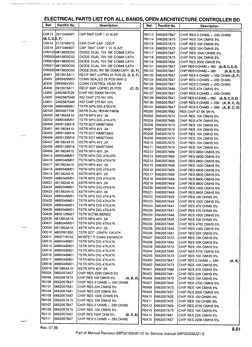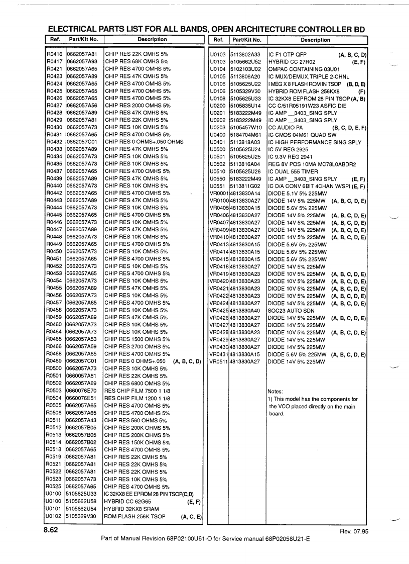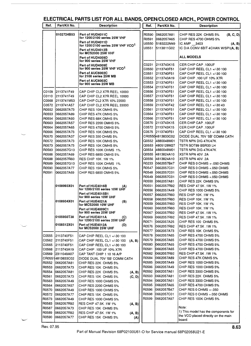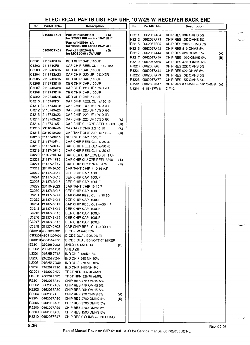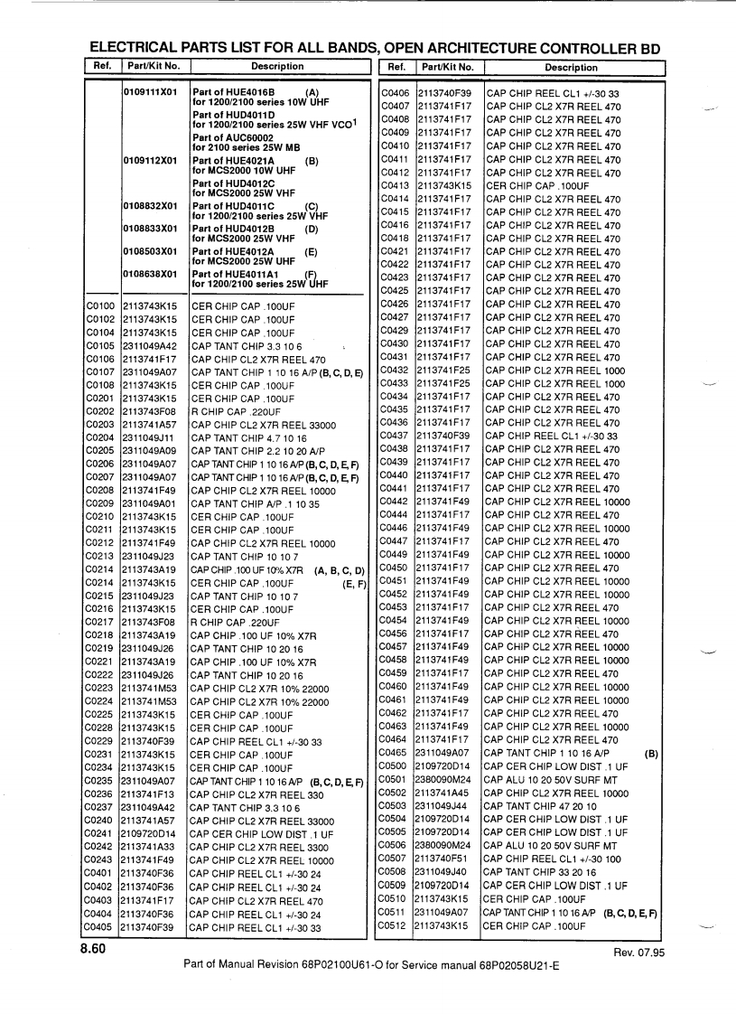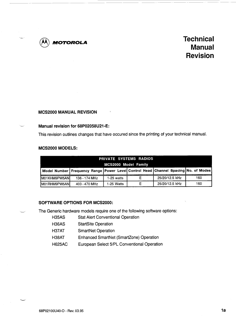 MOTOROLATechnicalManualRevisionThis revision outlines changes that have occured since the printing of your technical manual.Use the attached pages to update your manual.TECHNICAL MANUAL AFFECTED:68P02058U21-E:Service Manual for mobile radios MC900/GM900/GN1100 /GM1200/MCX1200/MCS2000/MCX2000/MC2100.SUBJECT:MCS2000 UHF 1-10 WATT WITH PROGRAMMABLE 1 MEGABYTE FLASHEEPROMThis manual revision covers the MCS2000 UHF 1-10 Watt model with programmable1 Megabyte flash EEPROMNew ModelsPRIVATE SYSTEMS RADIOSMCS2000 Model FamilyModel NumberFrequency RangePower Levell Control HeadChannel Spacing No.of ModesMO1RFM9PW5AN403-470MH21-10 WattsE25/20/12.5kHz160This model uses the mini UHF antenna connector,part number:0905901V01 (see explodedview page 8.3).Note:All MCS2000 models ending with "AN"are not secure capable.Main BoardThe kit number of the 1-10 Watt 1 Megabyte main board is:HUE4021A.The board is common to the existing UHF 10 Watt board,HUE4016B,except for the followingsections:·RF Back End:0108687X01·Controller::0109112X01·Power Control:0108934X01Parts lists,updated with the three above-mentioned sections,are enclosed with this manualrevision.68P02100U61-0Date:07.95