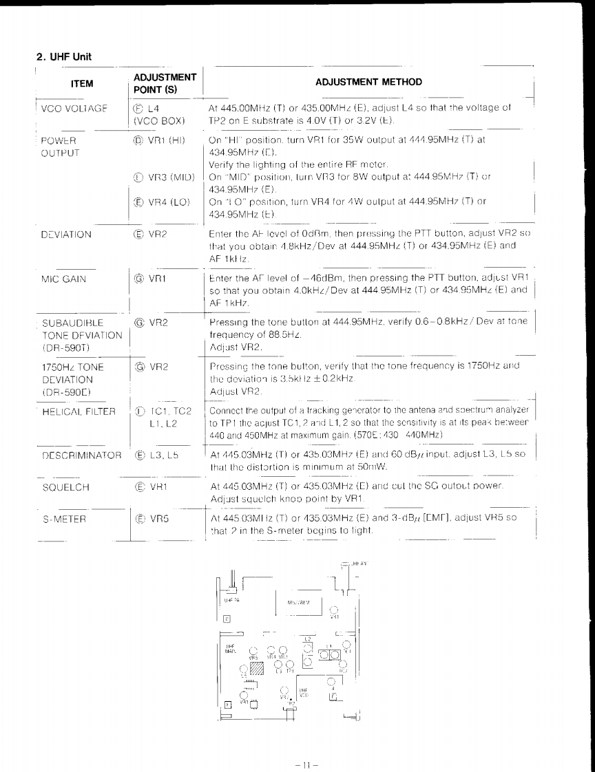 ■ADJUSTMENT1.VHF UnitITEMADJUSTMENTPOINT(S)ADJUSTMENT METHODVCO VOLTAGE⊙L3.L10At 145.00MHz,adjust L3 so that the voltage of TP2 on B substrate is 3.0V.(VCO BOX)At 145.00MHz,pressing the PTT button,adjust L10 so that the voltage ofTP2 on B substrate is 3.4V.BASIC®TC1Pressing PTT button.adjust TC1 so that f-counter indicates 145.950 +0.1FREQUENCYkHz (T)or 144.950 0.1kHz (E)MHz.TX POWER⑧TC2,3On"HI"position,pressing the PTT button,adjust TC2 and TC3 so thatthe power is maximum at 145.95MH2(T)or 144.95MHZ(E)POWERVR2 (HI)On "HI"position,turn VR2 for 45W oulput at 145.95MHz (T)orOUTPUT144.95MHz{E).Verify the lightining of the entire RF meter.E VR3 (MID)On "MID"position,turn VR3 for 10W output at 145.95MHz (T)or144.95MHzE).€VR4LO)On "LO"position,turn VR4 for 5W output at 145.95MHZ (T)or144.95MHz(C).DEVIATION⑧VR3Enter the Af level of OdBm,then prossing the PTT button,adjust VR3 so that youobtain 4.8kHz/Dov at 145.95MHz (T)or 144.95MHz (E)and AF 1kHz.MIC GAIN©VR1Enter the AF level of -46dBm.thon pressing the PTT bulton,adjust VR1 so thatyou obtain 4.0
