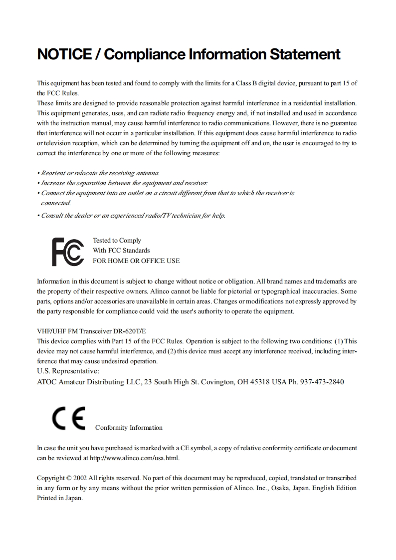 Downloaded by▣RadioAmateur.EUALINCOVHF/UHF FM TRANSCEIVERDR-620T/EInstruction Manual©©Thank you for purchasing your new Alinco transceiver.This instruction manual contains important safety and operating instructions.Please read thismanual carefully before using the product and keep it for future referenceALINCOQLINCOINCORPORATED