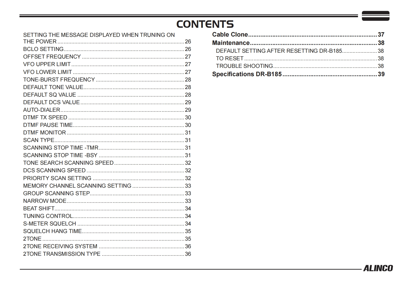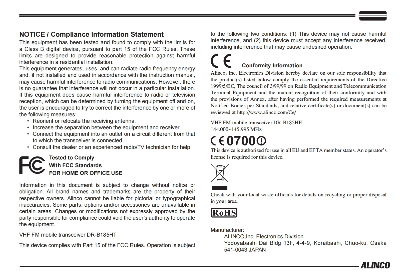 ALINCOVHF FM Mobile TransceiverDR-B185HTDR-B185HEInstruction ManualThank you for purchasing your new Alinco transceiver.Please read this manual carefully before using theproduct to ensure full performance,and keep thismanual for future reference as it contains informationon after-sales services.In case addendum or erratasheets are included with this product,please readthose materials and keep them together with this888品instruction manual for future reference.西5高