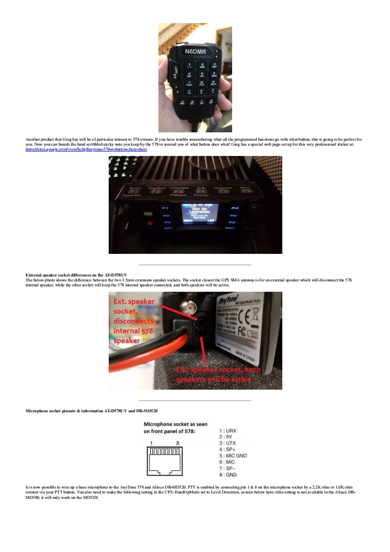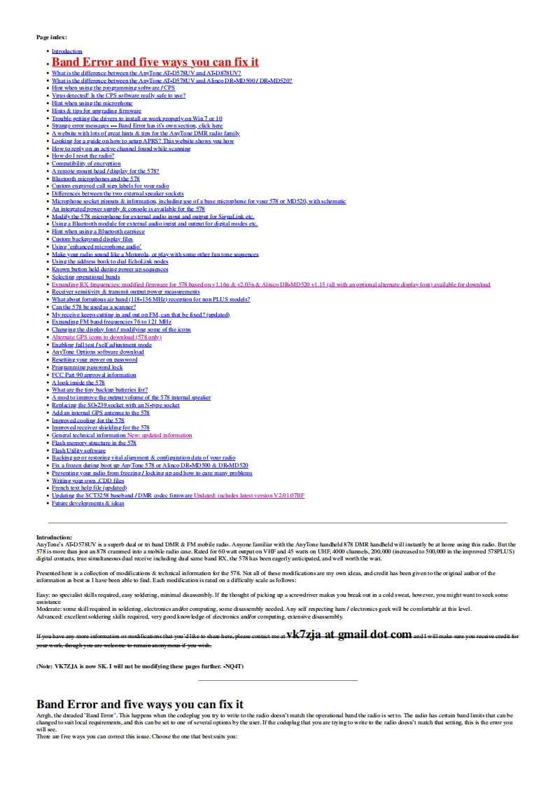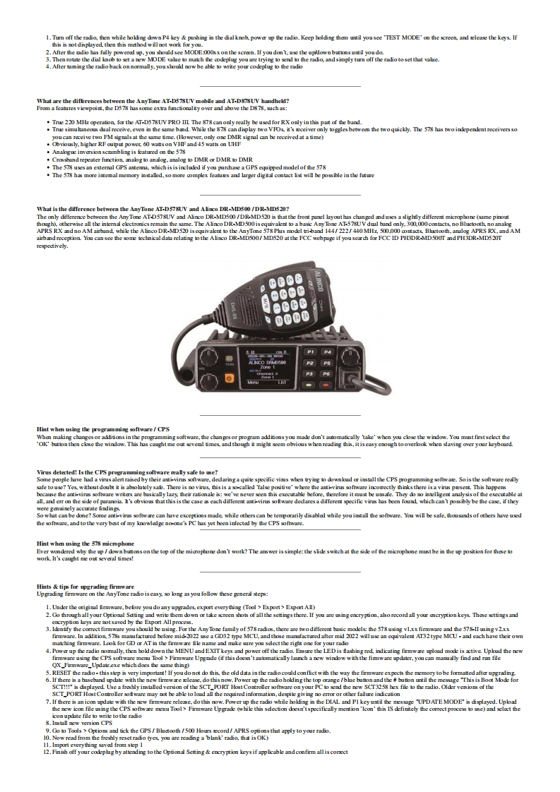 Modificat ions,hints,tips and technicalinformafion for theAnyTone AT-D578UVdual tri band DMR digital mobile radio(Some relevance to Alinco DR-MD500 DR-MD520 too)VK7ZJA1第⊙Version 7.4-20 October 2022 (FINAL:VK7ZJA SK 17JAN-2023)Updates made since the previous version are shown in this purple colurThis information is primarily intended for amateur 'ham'radio operators who wish to maintain and adjust their AT-D578UV.Any regulatory authority approval (egFCCcertification)may hecome invalid by the use of this information.Users shoull always ensure that they and their radis are operating in accordance with their licence conditions.Manyof these mods may ako invalidate any manufacturer warranty you may have.In any cae,the tser alone acepts all responsibility and risk from the use of this information and toolsprovided hereJason/VK7ZJA is sadly SK.I am providing this mirror of the last version to ensure this valuable information can he availahle to the community in the future.Page links have only heenmodified for mirroring.to remove references to possihly ureliahle external fle hosts,and to add these notices.No content modification has heen performed and I will not he updatinghe ages.-NQ-TGeneral warnings to all users:Codeplug version,CPS programming software version and firmware version present inthe radio must all match in version number.If not,very strange things happen.You mustREBUILD your codeplug every time a new CPS or firmware version is installed.Thiskeeps the underlying data sent to the radio consistent in version.For the same reason ahove,I would caution anyone from sharing and using other people's codeplugs.Whik it might he convenient,you can't he guaranteed what version theerlv under the firmre version instalkd in your radia.You just can't tell,the CPS won't tell youunkss it is a very early versioncodeplug.Save yourself a lt of headaches and REBUILD the clug hefore writing it to your radiaUse caution if writing non standard data to the radio in some of the advanced modifications listed below.It is possible to cause the radio to cease functioning correctly ifinstructions are not carried out with care.
