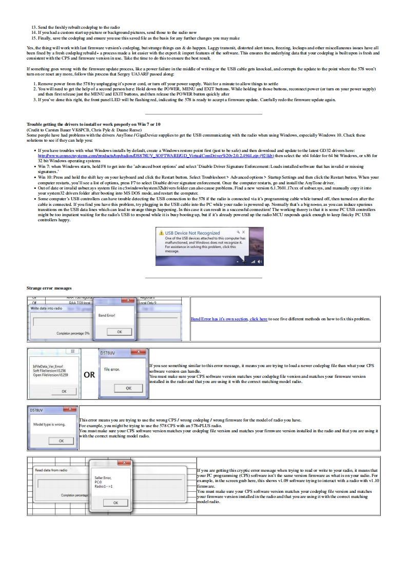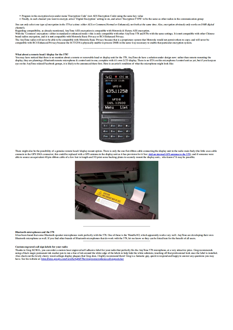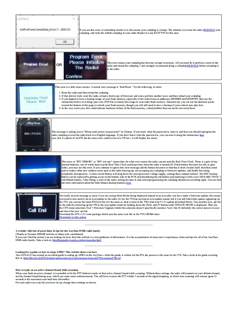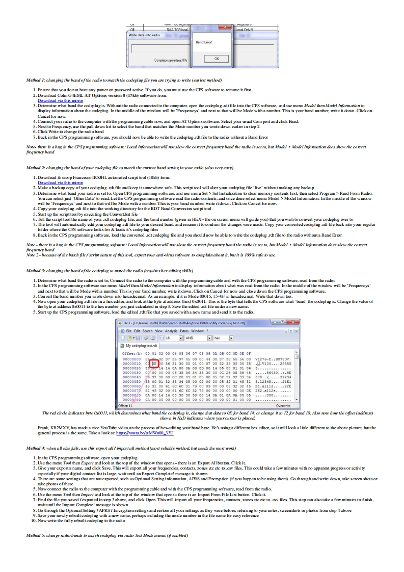 Modificat ions,hints,tips and technicalinformafion for theAnyTone AT-D578UVdual tri band DMR digital mobile radio(Some relevance to Alinco DR-MD500 DR-MD520 too)VK7ZJA1第⊙Version 7.4-20 October 2022 (FINAL:VK7ZJA SK 17JAN-2023)Updates made since the previous version are shown in this purple colurThis information is primarily intended for amateur 'ham'radio operators who wish to maintain and adjust their AT-D578UV.Any regulatory authority approval (egFCCcertification)may hecome invalid by the use of this information.Users shoull always ensure that they and their radis are operating in accordance with their licence conditions.Manyof these mods may ako invalidate any manufacturer warranty you may have.In any cae,the tser alone acepts all responsibility and risk from the use of this information and toolsprovided hereJason/VK7ZJA is sadly SK.I am providing this mirror of the last version to ensure this valuable information can he availahle to the community in the future.Page links have only heenmodified for mirroring.to remove references to possihly ureliahle external fle hosts,and to add these notices.No content modification has heen performed and I will not he updatinghe ages.-NQ-TGeneral warnings to all users:Codeplug version,CPS programming software version and firmware version present inthe radio must all match in version number.If not,very strange things happen.You mustREBUILD your codeplug every time a new CPS or firmware version is installed.Thiskeeps the underlying data sent to the radio consistent in version.For the same reason ahove,I would caution anyone from sharing and using other people's codeplugs.Whik it might he convenient,you can't he guaranteed what version theerlv under the firmre version instalkd in your radia.You just can't tell,the CPS won't tell youunkss it is a very early versioncodeplug.Save yourself a lt of headaches and REBUILD the clug hefore writing it to your radiaUse caution if writing non standard data to the radio in some of the advanced modifications listed below.It is possible to cause the radio to cease functioning correctly ifinstructions are not carried out with care.