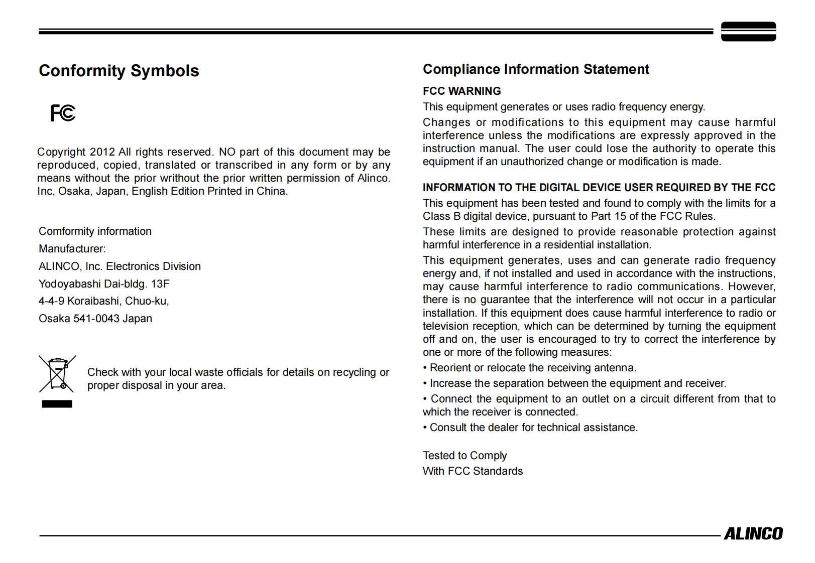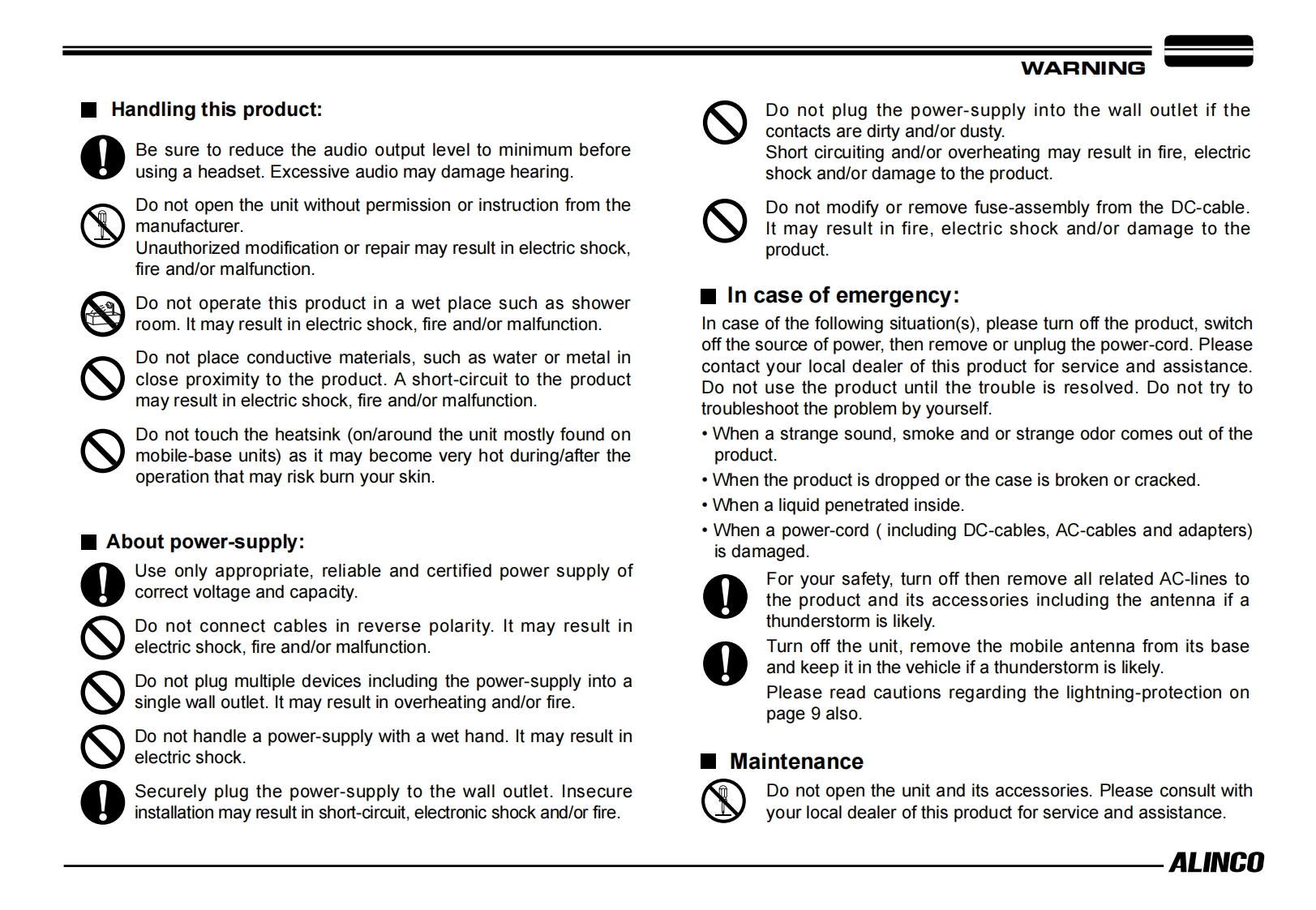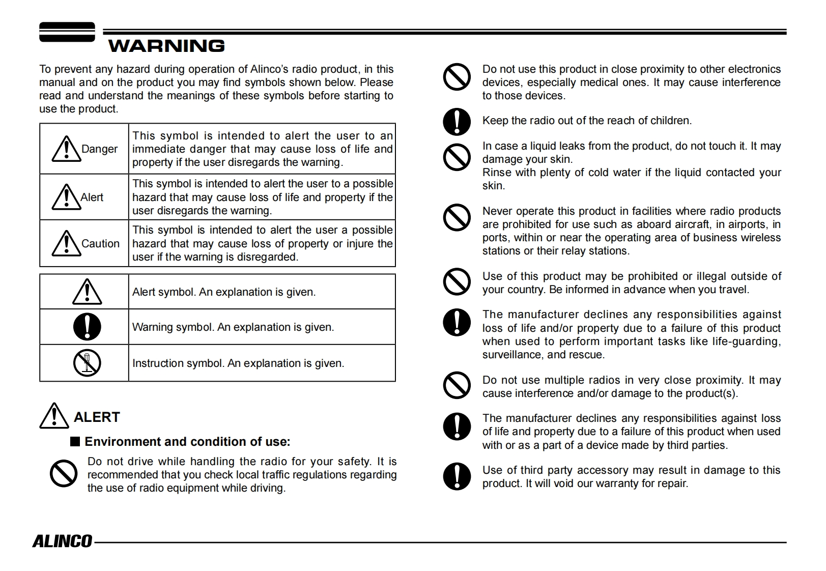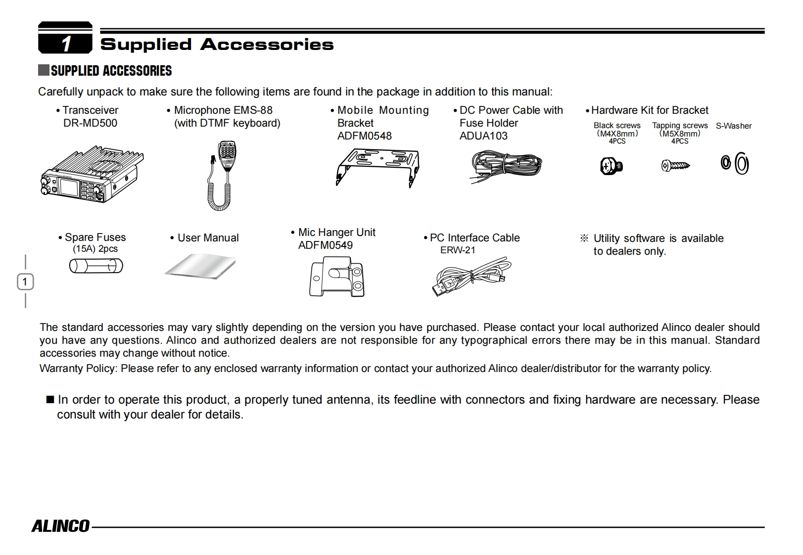 ALINCOVHF/UHF Dual Band Digital TransceiverDMRDR-MD500Instruction ManualThank you for purchasing your new Alinco transceiver.Please read this manual carefully before using theproduct to ensure full performance,and keep thisOR-MD500manual for future reference as it contains informationon after-sales services.In case addendum or errataP4sheets are included with this product,please readthose materials and keep them together with thisinstruction manual for future reference.NOTE:DR-MD500 may be delivered to you after dealer-programming.In such cases,please ask your dealer aboutthe available features in your unit and how to operate this unit.Features and functions may be limited due to dealer-programming.ALINCO,INC.W