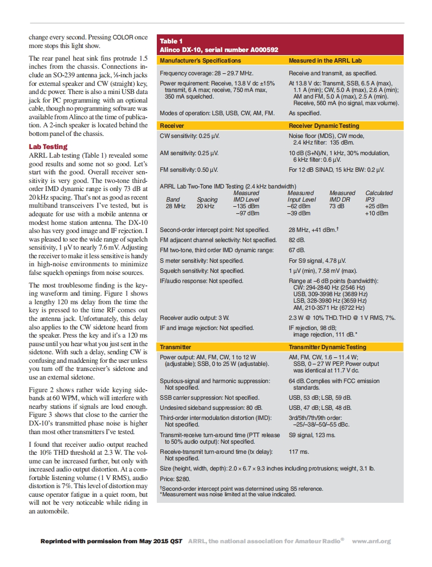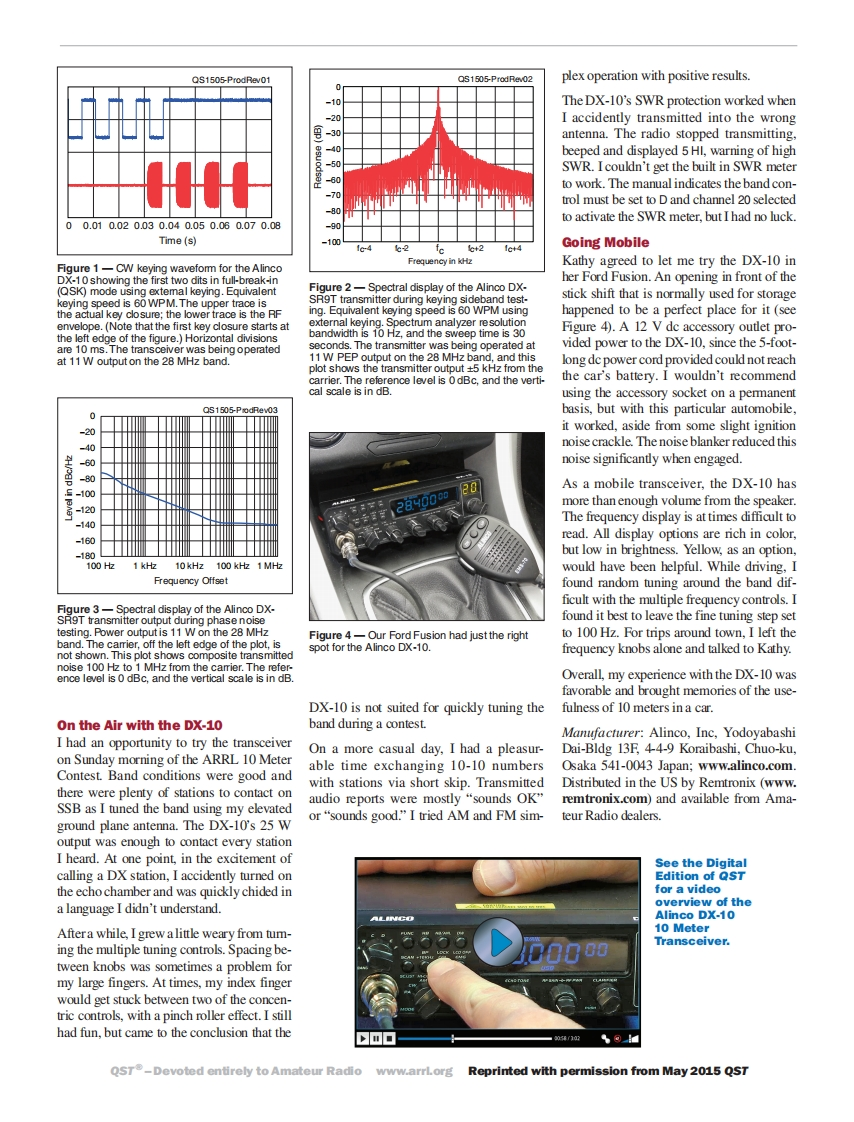 Product ReviewMark J.Wilson,K1RO,k1ro@arrl.orgAlinco DX-10 10 Meter TransceiverAn inexpensive single-band transceiver for mobile,portable,or home station use.Reviewed by Bob Allison,WBIGCMing 28.000 MHz and CHANNELARRL Senior Test Engineer60 equaling 28.295 MHz.Awblgcm@arrl.orgseparate CLARIFIER knobA couple of solar cycles ago,my wifeadjusts the fine tuning of theKathy,KAIRWY,and Ieach hadfrequency of each channela 10 meter mobile transceiver+10 kHz in steps of 10 Hz,in our car.With a base loaded.100 Hz,1 kHz,or 10 kHz.Thismagnetic mount antenna,tuning arrangement isour 25 W PEP radios could00002890998much different than con-reach our home station uptinuous tuning accom-to 30 miles away.Whenplished with a singlethe band opened,Kathyknob,as found on virtuallyalways attracted DX withall other conventional amateurher melodious voice andtransceivers.managed to talk to more thanA Closer Look60 countries from her Oldsmobile stationFront panel pushbutton functions are:FUNCwagon.I was grateful to have 10 meters(function),RB/BP (roger beep/beep),NB/aboard my rickety Mercury Comet.and operates on USB,LSB,CW,AM,andANL/LOCK (noise blanker/lock),DW/LCDMany newly licensed Technicians haveFM.RF power output is 25 W for SSB andOFF (dual watch;select another frequencytold me they were attracted to the lure12 W for CW,AM,and FM.There is noto be monitored and the receiver switchesof DX and local communications onsubaudible tone function or split transmit/between the two/display off),SCAN/SC LIST10 meters,but were afraid to invest in anreceive feature for FM repeater operation.(scan/scan list),+10 kHz/HI-CUT (bumps theexpensive multiband HF transceiver.I'veThe radio has power supply polarity andreceiver up 10 kHz/high cut audio filter to re-also overheard a few amateurs express theirSWR protection.Current consumption isduce hiss),COL/TOT (display color/time-outdesire for a simple 10 meter mobile radiotimer),EMG/S/RF (switch to user-selected6.5 A maximum,requiring a modest dcthat comes with a warranty.Alinco's DX-10supply.Included accessories are the Alincoemergency channel/meter function).Fromcan meet the needs of both groups.EMS-70 hand microphone,microphoneleft to right,the knob controls are memorybanks A -F.mode,VOL/SQ (volume/But it's...clip,mobile mounting bracket,and mount-Yes,I know the DX-10 looks like a CBing hardware.squelch),ECHO/TONE,RF GAIN/RF PWR.CLARIFIER.and CHANNELtransceiver.It has some of the features youThe DX-10 uses an unusual frequency tun-would find on a CB radio,such as an echoing arrangement.The radio has six memoryIn addition to the front panel controls,thechamber and roger beep (that are best leftbanks that are preprogrammed at the fac-DX-10 has a menu for 16 parameters suchturned off),public address feature,and two-as microphone gain and sidetone level.Entertory,with each bank covering a span ofdigit CHANNEL display.In other parts of the300 kHz using 60 memory channels.Thethe menu setup by pressing and holdingworld,identical-looking tra