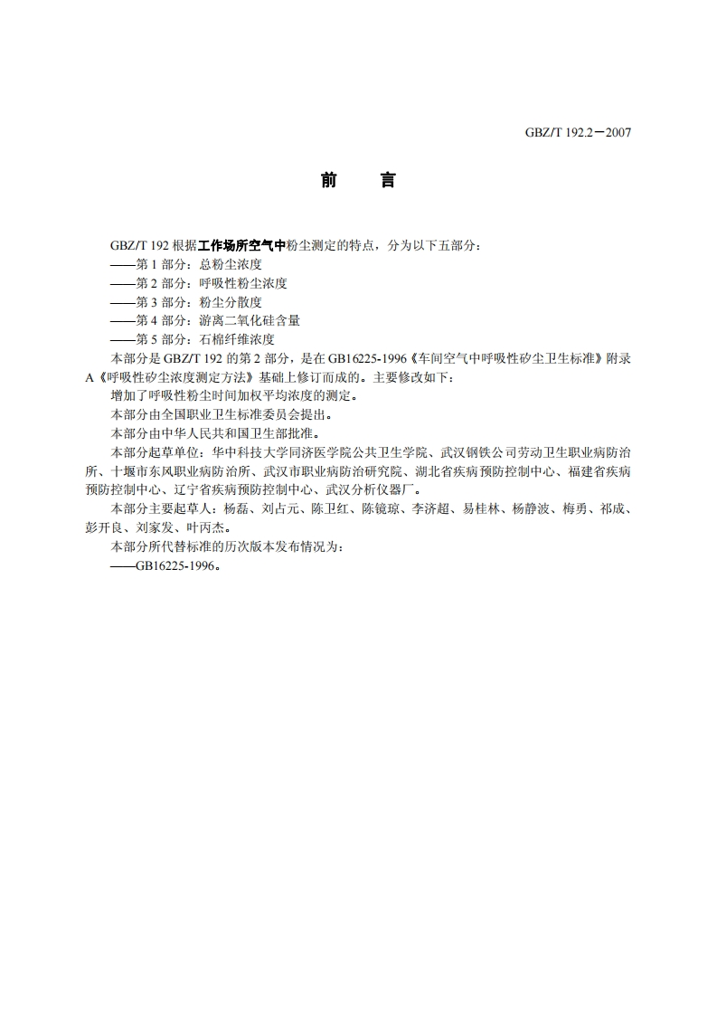 工作场所物理因素测量GBZT189.2-2007348072@abc4个月前发布关注私信0.16MB4页028工作场所物理因素测量GBZT189.2-2007此内容为付费资源,请付费后查看¥23¥32黄金会员免费钻石会员免费立即购买您当前未登录!建议登陆后购买,可保存购买订单付费资源 第1页 / 共4页 第2页 / 共4页 试读已结束,还剩2页,您可下载完整版后进行离线阅读 THE END标准规范 文本预览 ICS 100C52GBZ中华人民共和国国家职业卫生标准GBZ/T192.2-2007工作场所空气中粉尘测定第2部分:呼吸性粉尘浓度Method for determination of dust in the air of workplacePart 2:Respirable dust concentration2007年6月18日发布2007年12月30日实施中华人民共和国卫生部发布 查看更多 收起部分 喜欢就支持一下吧收藏