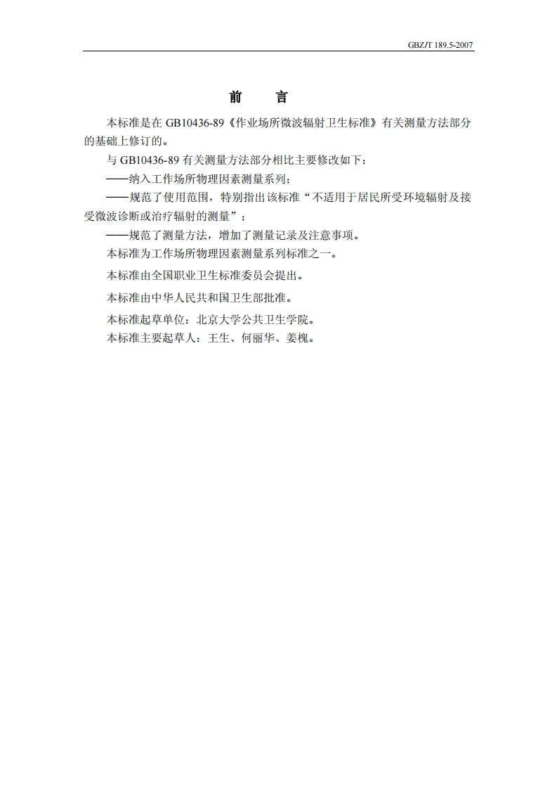 工作场所物理因素测量GBZT189.5-2007348072@abc4个月前发布关注私信63.32KB3页038工作场所物理因素测量GBZT189.5-2007此内容为付费资源,请付费后查看¥23¥32黄金会员免费钻石会员免费立即购买您当前未登录!建议登陆后购买,可保存购买订单付费资源 第1页 / 共3页 第2页 / 共3页 试读已结束,还剩1页,您可下载完整版后进行离线阅读 THE END标准规范 文本预览 ICS13.100C52GBZ中华人民共和国国家职业卫生标准GBZT189.5-2007工作场所物理因素测量微波辐射Measurement of microwave radiation in the workplace2007-04-20发布2007-11-01实施中华人民共和国卫生部发布 查看更多 收起部分 喜欢就支持一下吧收藏